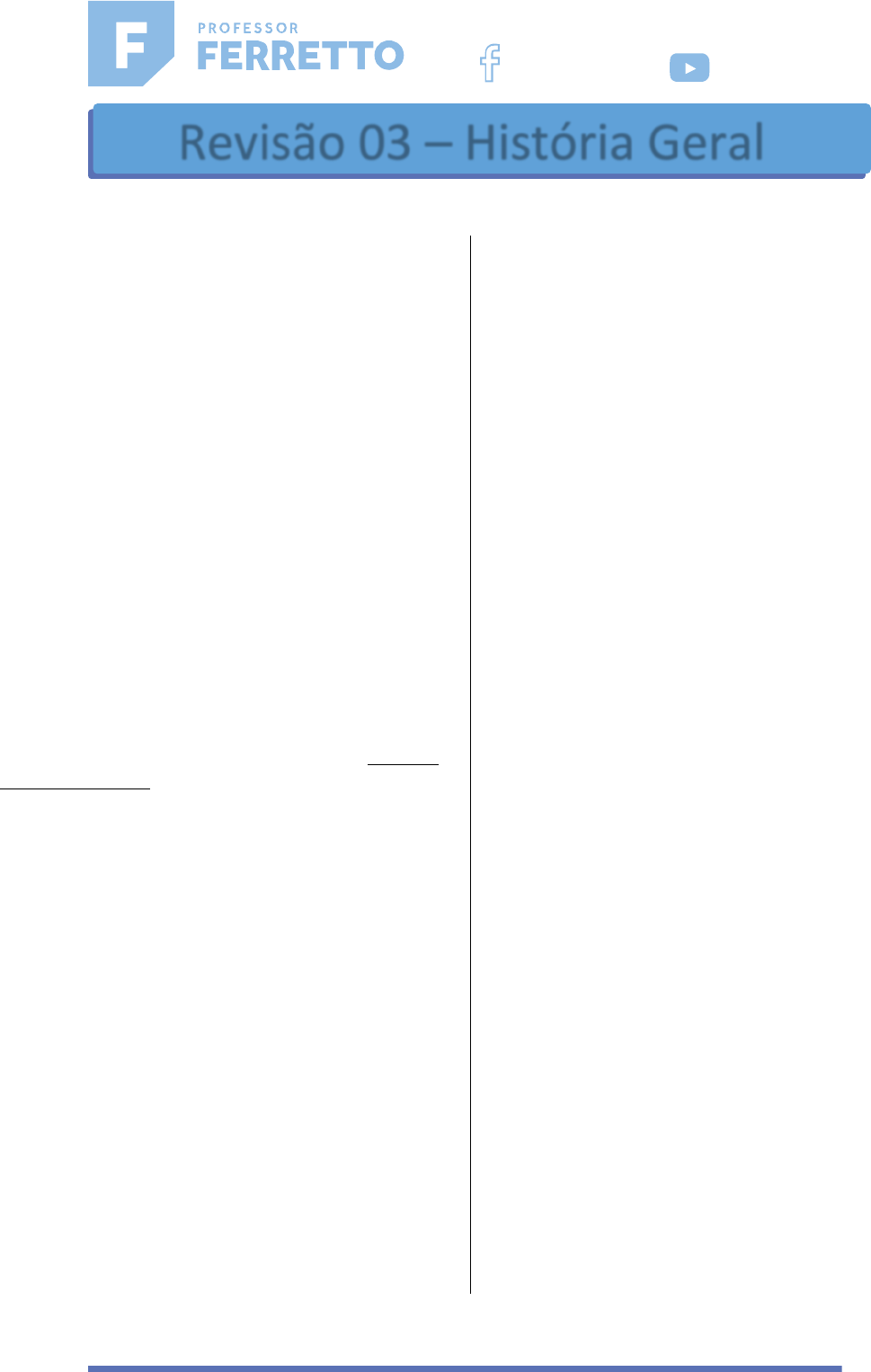 <p>1</p><p>01 - (Espcex) Com o objetivo inicial de romper o</p><p>monopólio de genoveses e venezianos (que</p><p>controlavam as rotas do Mar Mediterrâneo) no</p><p>lucrativo comércio de produtos orientais, a alternativa</p><p>encontrada pelos comerciantes portugueses foi</p><p>investir na descoberta de um novo caminho para o</p><p>Oriente, pelo Oceano Atlântico, dando início à época</p><p>das "Grandes Navegações". Relativamente aos fatores</p><p>que levaram ao pioneirismo português nesse processo,</p><p>analise as assertivas abaixo.</p><p>I. Portugal foi o primeiro país europeu a instituir uma</p><p>monarquia nacional centralizada.</p><p>II. Os portugueses aperfeiçoaram mapas e inventaram</p><p>a caravela.</p><p>III. A posição geográfica de Portugal não teve grande</p><p>influência.</p><p>IV. Com a invenção da imprensa, a popularização dos</p><p>livros incentivou as pessoas a se aventurarem em busca</p><p>de riqueza, fama e glória.</p><p>Assinale a alternativa que apresenta somente</p><p>assertivas corretas</p><p>a) I, II, III e IV.</p><p>b) II, III e IV.</p><p>c) I, II e IV.</p><p>d) I, III e IV.</p><p>e) I, II e III.</p><p>02 - (Albert Einstein) Nessa primeira metade do século</p><p>[XIX], as atividades urbanas haviam perdido qualquer</p><p>vínculo com o tempo da natureza; de há muito se</p><p>encontram subordinadas ao tempo abstrato, ao dia</p><p>implacavelmente dividido em 24 horas.</p><p>(Maria Stella Martins Bresciani. Londres e Paris no século XIX: o</p><p>espetáculo da pobreza, 1982.)</p><p>A mudança assinalada no excerto associa-se</p><p>a) ao declínio da influência social das religiões e ao</p><p>surgimento do capitalismo.</p><p>b) à ética protestante do trabalho e ao aumento do</p><p>consumismo.</p><p>c) ao êxodo rural e à dinâmica da globalização</p><p>econômica.</p><p>d) ao nascimento das fábricas e ao processo de</p><p>metropolização.</p><p>e) à noção liberal do tempo útil e à busca do sucesso</p><p>profissional.</p><p>03 - (Fcmscsp) Antes de sua publicação em 1572, o</p><p>poema Os Lusíadas de Luís de Camões foi submetido à</p><p>leitura e à censura de Frei Bartolomeu Ferreira,</p><p>membro da Santa Inquisição em Portugal.</p><p>Vi por mandado da Santa e Geral Inquisição esses dez</p><p>Cantos dos Lusíadas de Luís de Camões, dos valorosos</p><p>feitos em armas que os Portugueses fizeram em Ásia, e</p><p>Europa, e não achei neles coisa alguma escandalosa,</p><p>nem contrária à fé e aos bons costumes [...]. O autor</p><p>para encarecer a dificuldade da navegação e entrada</p><p>dos portugueses na Índia usa de uma ficção dos Deuses</p><p>dos Gentios. [...] Todavia, como isso é Poesia e</p><p>fingimento, o autor como poeta não pretende mais que</p><p>ornar o efeito Poético, não tivemos por inconveniente</p><p>ver esta fábula dos Deuses na obra, conhecendo-a por</p><p>tal, e ficando sempre salva a verdade de nossa Santa fé,</p><p>que todos os deuses dos Gentios são Demônios.</p><p>(Luís de Camões. Os Lusíadas, 1572. Adaptado.)</p><p>Observando a maneira como o poeta orna “o efeito</p><p>Poético”, conclui-se que o poema ar</p><p>a) ressuscita os ritos do paganismo greco-romano no</p><p>período de vigência da arte barroca da Europa</p><p>Ocidental.</p><p>b) procura demonstrar a superioridade da literatura</p><p>portuguesa sobre os modelos de inspiração da</p><p>Antiguidade.</p><p>c) sintetiza o mundo clássico com o monoteísmo</p><p>cristão de acordo com os padrões culturais do</p><p>Renascimento.</p><p>d) denuncia a ausência de liberdade de expressão nas</p><p>monarquias absolutistas da Idade Moderna.</p><p>e) exalta o pacifismo dos portugueses como expressão</p><p>da mentalidade do teocentrismo medieval.</p><p>www.professorferretto.com.br</p><p>ProfessorFerretto ProfessorFerretto</p><p>Revisão 03 – História Geral</p><p>2</p><p>04 - (Espcex) A tentativa do rei Jaime II (1685-1689) de</p><p>impor o catolicismo aos ingleses, contrariando o</p><p>Parlamento, de maioria protestante, levou este último</p><p>a convidar o príncipe holandês Guilherme de Orange,</p><p>casado com a filha protestante de Jaime II, a ocupar o</p><p>trono inglês. Guilherme, então, entrou na Inglaterra</p><p>com seu exército e destronou o sogro, no movimento</p><p>que ficou conhecido como Revolução Gloriosa.</p><p>Relativamente a esse momento histórico, analise as</p><p>assertivas abaixo.</p><p>I. Guilherme de Orange jurou obedecer à Declaração de</p><p>Direitos (Bill of Rights), que passou a vigorar na</p><p>Inglaterra desde então.</p><p>II. O processo revolucionário inglês foi inspirado nas</p><p>ideias do pensador político Maquiavel.</p><p>III. A Revolução, de inspiração liberal, favoreceu o</p><p>desenvolvimento do capitalismo e expansão dos</p><p>negócios da burguesia manufatureira e mercantil,</p><p>colaborando para o pioneirismo inglês na vindoura</p><p>Revolução Industrial.</p><p>IV. A partir da Revolução Gloriosa, tornou-se comum</p><p>dizer que, na Inglaterra, “o rei reina, mas quem</p><p>governa é o Parlamento”.</p><p>Assinale a alternativa que apresenta somente</p><p>assertivas corretas.</p><p>a) I, II, III e IV.</p><p>b) I, II e III.</p><p>c) I, III e IV.</p><p>d) II, III e IV.</p><p>e) Nenhuma das opções apresentadas.</p><p>05 - (Pucrs) O Renascimento foi um período de</p><p>inovações que ocorreu nas artes, na literatura e na</p><p>ciência na Europa Ocidental no início da Era Moderna.</p><p>Trata-se de um rico movimento intelectual, afetando</p><p>essa parte do continente de diferentes formas.</p><p>Sobre as principais características do Renascimento,</p><p>assinale V (verdadeiro) ou F (falso) para as afirmações.</p><p>(__) As inovações tecnológicas permitiram uma nova</p><p>relação entre os impressos e os leitores, favorecendo a</p><p>ampliação do número de publicações e a maior</p><p>circulação de ideias e textos, em especial, de filósofos</