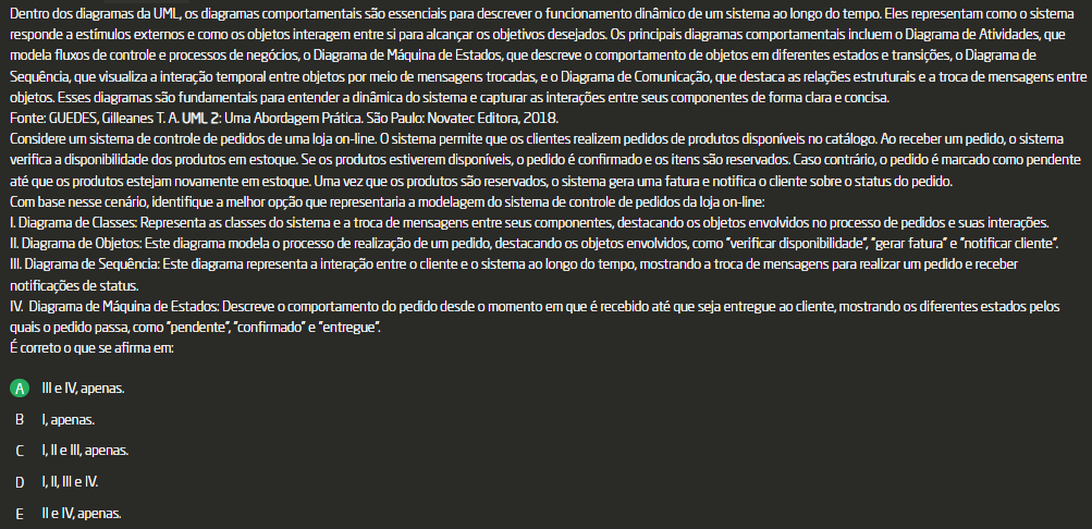 Dentro dos diagramas da UML, os diagramas comportamentais são essenciais para descrever funcionamento dinâmico de um sistema ao longo do tempo. Eles representam como sistema responde a estímulos externos e como objetos interagem entre si para alcançar objetivos desejados. Os principais diagramas comportamentais incluem Diagrama de Atividades, que modela fluxos de controle e processos de negócios, Diagrama de Máquina de Estados, que descreve comportamento de objetos em diferentes estados e transições, Diagrama de que visualiza a interação temporal entre objetos por meio de mensagens trocadas, e Diagrama de Comunicação, que destaca as relações estruturais e a troca de mensagens entre objetos Esses diagramas são fundamentais para entender a dinâmica do sistema e capturar as interações entre seus componentes de forma clara e concisa. Fonte: GUEDES, Gilleanes T.A. UML 2: Uma Abordagem Prática. São Paulo: Editora, 2018. Considere um sistema de controle de pedidos de uma loja on-line. 0 sistema permite que os clientes realizem pedidos de produtos disponíveis no catálogo. Ao receber um pedido, sistema verifica a disponibilidade dos produtos em estoque. Se os produtos estiverem disponíveis, pedido é confirmado e itens são reservados. Caso contrário, pedido é marcado como pendente até que os produtos estejam novamente em estoque. Uma os produtos são reservados, sistema gera uma fatura e notifica cliente sobre status do pedido. Com base nesse cenário, identifique a melhor opção que representaria a modelagem do sistema de controle de pedidos da loja on-line: I. Diagrama de Classes: Representa as classes do sistema e a troca de mensagens entre seus componentes, destacando objetos envolvidos processo de pedidos e suas interações. II. Diagrama de Objetos: Este diagrama modela processo de realização de um pedido, destacando objetos envolvidos, como "verificar disponibilidade", "gerar e "notificar III. Diagrama de Sequência: Este diagrama representa a interação entre cliente e O sistema ao longo do tempo, mostrando a troca de mensagens para realizar um pedido e receber notificações de IV. Diagrama de Máquina de Descreve comportamento do pedido desde O momento em que é recebido até que seja entregue ao cliente, mostrando diferentes estados pelos quais pedido passa, como "pendente", "confirmado" e "entregue". É correto que se afirma em III e apenas. B I, apenas C I, lle III, apenas. D I, III e IV. E IV,