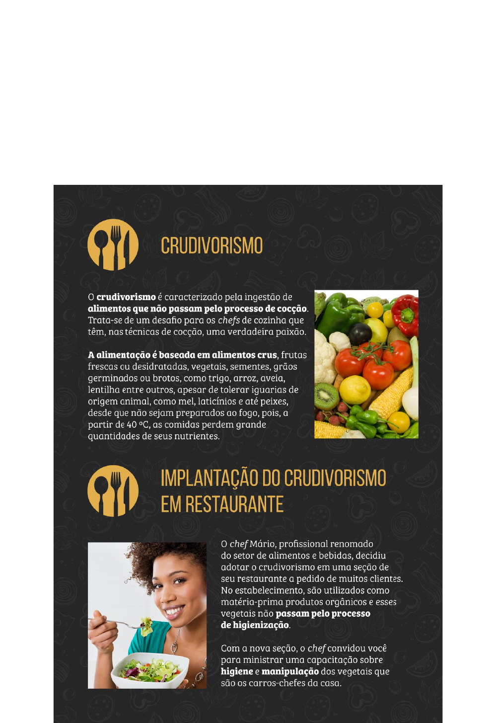 <p>COZINHA QUENTE E COZINHA FRIA - HIGIENIZAÇÃO E MANIPULAÇÃO DE VEGETAIS</p><p>DESAFIO</p><p>A cultura alimentar faz parte da história de uma civilização em qualquer parte do Brasil e do Mundo.</p><p>Com a globalização, todos os dias novas práticas alimentares, produtos e serviços são lançados no</p><p>mercado de alimentos e bebidas. Em razão disso, os profissionais da área precisam estar antenados</p><p>para não ficarem obsoletos.</p><p>Um exemplo de nova forma de alimentação é o crudivorismo, que se baseia na ingestão de alimentos</p><p>crus e vivos. A seguir, conheça características dessa prática e o caso de um restaurante que decidiu</p><p>adotá-la.</p><p>Neste Desafio, quais orientações você passaria para os colaboradores para atender às especificidades</p><p>da casa e garantir a segurança alimentar e qual seria a orientação quanto ao procedimento com</p><p>cogumelos?</p><p>Escreva sua resposta no campo abaixo:</p><p>R. Para higienizar cogumelos frescos, pode-se usar um pano de prato ou papel toalha úmido, com</p><p>delicadeza, limpando um a um. Também é possível usar uma escova pequena e macia para remover</p><p>sujeira e terra. Limpar os cogumelos com escovas pequenas é bastante aconselhável pelos cozinheiros</p><p>e chefs de cozinha. É uma ótima maneira de tirar o excesso de terra e outros substratos. Existem escovas</p><p>específicas para o procedimento ou você pode utilizar escovinhas reservadas para a culinária.</p><p>É importante não lavar os cogumelos em água corrente, pois eles absorvem muito líquido e podem ficar</p><p>encharcados e murchos. Como são como esponjas, se forem colocados de molho, vão soltar água na</p><p>preparação e ficar molengos e sem gosto.</p><p>Alguns tipos de cogumelos, como shimeji e shiitake, geralmente não precisam ser limpos antes de serem</p><p>preparados.</p><p>Padrão de resposta esperado</p><p>No setor de alimentação, os cuidados relacionados à higiene e à segurança alimentar são</p><p>premissas básicas sempre, principalmente quando se trata de ingestão de produtos crus,</p><p>independentemente de serem produtos orgânicos.</p><p>- Todos os alimentos vegetais têm sujidades e devem ser lavados em água corrente. Depois</p><p>de lavados, devem ser colocados de molho em hipoclorito de sódio por 15 minutos, retirar da</p><p>solução e passar em água corrente novamente. Em seguida, secar com papel toalha antes do</p><p>consumo e/ou do armazenamento.</p><p>- Quanto aos cogumelos, eles não devem ser lavados, pois absorvem água. É preciso retirar</p><p>suas sujidades com pincel ou papel toalha e não devem ser consumidos crus, somente após</p><p>o processo de cocção.</p>