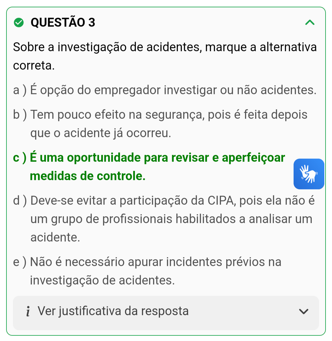 QUESTÃO 3 Sobre a investigação de acidentes, marque a alternativa correta. a ) É opção do empregador investigar ou não acidentes. b) Tem pouco efeito na segurança, pois é feita depois que o acidente já ocorreu. c) É uma oportunidade para revisar e aperfeiçoar medidas de controle. Deve-se evitar a participação da CIPA, pois ela não é um grupo de profissionais habilitados a analisar um acidente. e ) Não é necessário apurar incidentes prévios na investigação de acidentes. i Ver justificativa da resposta