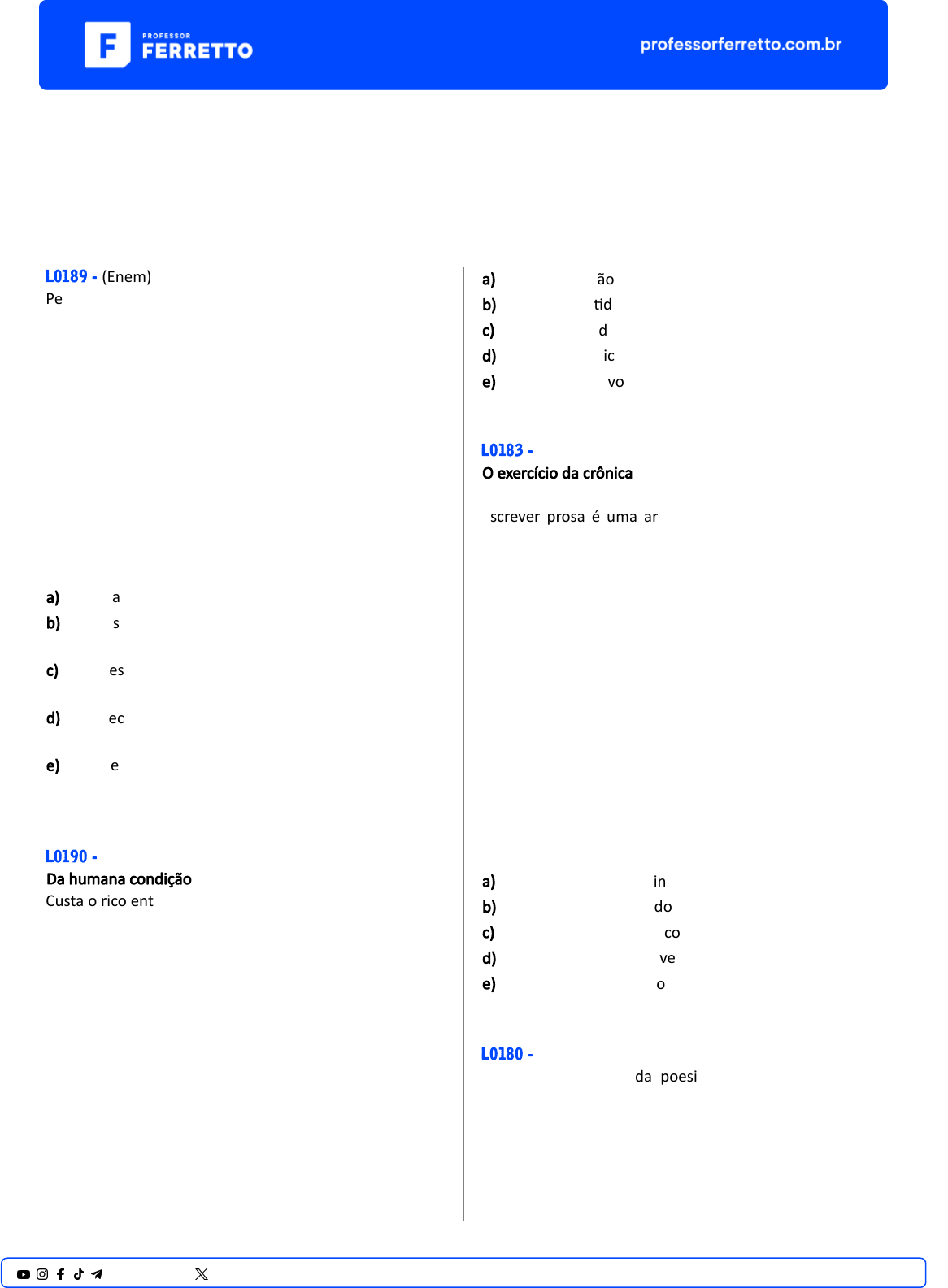 <p>ENEM</p><p>Modernismo - Segunda Fase - Poesia</p><p>L0189 - (Enem)</p><p>Pequenos tormentos da vida</p><p>De cada lado da sala de aula, pelas janelas altas, o</p><p>azul convida os meninos,</p><p>as nuvens desenrolam-se, lentas como quem vai</p><p>inventando</p><p>preguiçosamente uma história sem fim...</p><p>Sem fim é a aula: e nada acontece,</p><p>nada... Bocejos e moscas. Se, ao menos, pensa</p><p>Margarida, se ao menos um</p><p>avião entrasse por uma janela e saísse por outra!</p><p>(Mário Quintana, Poesias)</p><p>Na cena retratada no texto, o sen�mento do tédio:</p><p>a) provoca que os meninos fiquem contando histórias.</p><p>b) leva os alunos a simularem bocejos, em protesto</p><p>contra a monotonia da aula.</p><p>c) acaba es�mulando a fantasia, criando a expecta�va de</p><p>algum imprevisto mágico.</p><p>d) prevalece de modo absoluto, impedindo até mesmo a</p><p>distração ou o exercício do pensamento.</p><p>e) decorre da morosidade da aula, em contraste com o</p><p>movimento acelerado das nuvens e das moscas.</p><p>L0190 - (Enem)</p><p>Da humana condição</p><p>Custa o rico entrar no céu</p><p>(Afirma o povo e não erra).</p><p>Porém muito mais di�cil</p><p>É um pobre ficar na terra.</p><p>QUINTANA, M.Melhores poemas. São Paulo: Global,</p><p>2003.</p><p>Mário Quintana ficou conhecido por seus “quintanares”,</p><p>nome que o poeta Manuel Bandeira deu a esses</p><p>quartetos com pequenas observações sobre a vida. Nessa</p><p>perspec�va, os versos do poema Da humana</p><p>condição ressaltam</p><p>a) a desvalorização da cultura popular.</p><p>b) a falta de sen�do da existência humana.</p><p>c) a irreverência diante das crenças do povo.</p><p>d) uma visão irônica das diferenças de classe.</p><p>e) um olhar obje�vo sobre as diferenças sociais.</p><p>L0183 - (Enem)</p><p>O exercício da crônica</p><p>Escrever prosa é uma arte ingrata. Eu digo prosa fiada,</p><p>como faz um cronista; não a prosa de um ficcionista, na</p><p>qual este é levado meio a tapas pelas personagens e</p><p>situações que, azar dele, criou porque quis. Com um</p><p>prosador co�diano, a coisa fia mais fino. Senta-se diante</p><p>de sua máquina, acende um cigarro, olha através da</p><p>janela e busca fundo em sua imaginação um fato</p><p>qualquer, de preferência colhido no no�ciário matu�no,</p><p>ou da véspera, em que, com duas ar�manhas peculiares,</p><p>possa injetar um sangue novo.</p><p>MORAES, V. Para viver um grande amor: crônicas e</p><p>poemas. São Paulo: Cia. das Letras, 1991.</p><p>Nesse trecho, Vinicius de Moraes exercita a crônica para</p><p>pensá-la como gênero e prá�ca. Do ponto de vista dele,</p><p>cabe ao cronista</p><p>a) criar fatos com a imaginação.</p><p>b) reproduzir as no�cias dos jornais.</p><p>c) escrever em linguagem coloquial.</p><p>d) construir personagens verossímeis.</p><p>e) ressignificar o co�diano pela escrita.</p><p>L0180 - (Enem)</p><p>No poema "Procura da poesia", Carlos Drummond de</p><p>Andrade expressa a concepção esté�ca de se fazer com</p><p>palavras o que o escultor Michelangelo fazia com</p><p>mármore. O fragmento a seguir exemplifica essa</p><p>afirmação.</p><p>"(...)</p><p>1@professorferretto @prof_ferretto</p><p>Penetra surdamente no reino das palavras.</p><p>Lá estão os poemas que esperam ser escritos.</p><p>(...)</p><p>Chega mais perto e contempla as palavras.</p><p>Cada uma</p><p>tem mil faces secretas sob a face neutra</p><p>e te pergunta, sem interesse pela resposta,</p><p>pobre ou terrível, que lhe deres:</p><p>trouxeste a chave?"</p><p>Carlos Drummond de Andrade. A rosa do povo. Rio de</p><p>Janeiro: Record, 1997, p. 13-14.</p><p>Esse fragmento poé�co ilustra o seguinte tema constante</p><p>entre autores modernistas:</p><p>a) a nostalgia do passado colonialista revisitado.</p><p>b) a preocupação com o engajamento polí�co e social da</p><p>literatura.</p><p>c) o trabalho quase artesanal com as palavras,</p><p>despertando sen�dos novos.</p><p>d) a produção de sen�dos hermé�cos na busca da</p><p>perfeição poé�ca.</p><p>e) a contemplação da natureza brasileira na perspec�va</p><p>ufanista da pátria.</p><p>L0181 - (Enem)</p><p>Leia estes poemas.</p><p>Texto 1 - AUTO-RETRATO</p><p>Provinciano que nunca soube</p><p>Escolher bem uma gravata;</p><p>Pernambucano a quem repugna</p><p>A faca do pernambucano;</p><p>Poeta ruim que na arte da prosa</p><p>Envelheceu na infância da arte,</p><p>E até mesmo escrevendo crônicas</p><p>Ficou cronista de província;</p><p>Arquiteto falhado, músico</p><p>Falhado (engoliu um dia</p><p>Um piano, mas o teclado</p><p>Ficou de fora); sem família,</p><p>Religião ou filosofia;</p><p>Mal tendo a inquietação de espírito</p><p>Que vem do sobrenatural,</p><p>E em matéria de profissão</p><p>Um �sico* profissional.</p><p>(Manuel Bandeira. Poesia completa e prosa. Rio de</p><p>Janeiro: Aguilar, 1983. p. 395.)</p><p>(*) �sico = tuberculoso</p><p>Texto 2 - POEMA DE SETE FACES</p><p>Quando eu nasci, um anjo torto</p><p>desses que vivem na sombra</p><p>disse: Vai, Carlos! ser gauche na vida.</p><p>As casas espiam os homens</p><p>que correm atrás de mulheres.</p><p>A tarde talvez fosse azul,</p><p>não houvesse tantos desejos.</p><p>(....)</p><p>Meu Deus, por que me abandonaste</p><p>se sabias que eu não era Deus</p><p>se sabias que eu era fraco.</p><p>Mundo mundo vasto mundo,</p><p>se eu me chamasse Raimundo</p><p>seria uma rima, não seria uma solução.</p><p>Mundo mundo vasto mundo</p><p>mais vasto é o meu coração.</p><p>(Carlos Drummond de Andrade. Obra completa. Rio de</p><p>Janeiro: Aguilar, 1964. p. 53.)</p><p>No verso "Meu Deus, por que me abandonaste" do texto</p><p>2, Drummond retoma as palavras de Cristo, na cruz,</p><p>pouco antes de morrer. Esse recurso de repe�r palavras</p><p>de outrem equivale a</p><p>a) emprego de termos moralizantes.</p><p>b) uso de vício de linguagem pouco tolerado.</p><p>c)