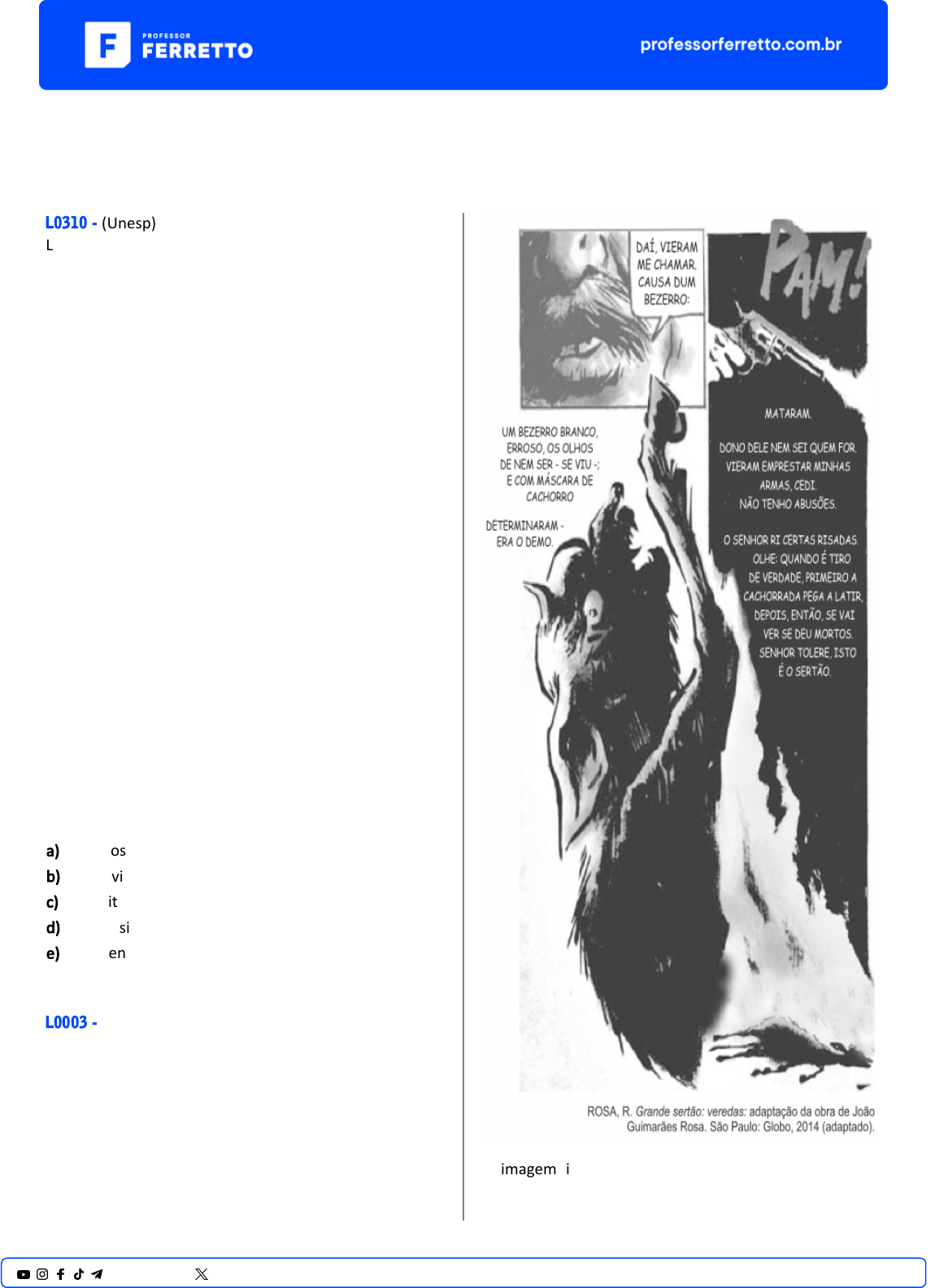 <p>Erradas</p><p>Introdução à Literatura</p><p>L0310 - (Unesp)</p><p>Leia o ensaio “Império reverso”, de Eduardo Gianne�.</p><p>Império reverso – O filósofo grego Diógenes fez da</p><p>autossuficiência e do controle das paixões os valores</p><p>centrais de sua vida: um casaco, uma mochila e uma</p><p>cisterna de argila no interior da qual pernoitava eram</p><p>suas únicas posses. Intrigado com relatos sobre essa</p><p>estranha figura, o imperador Alexandre Magno resolveu</p><p>conferir de perto. Foi até ele e propôs: “Sou o homem</p><p>mais poderoso do mundo, peça-me o que desejar e lhe</p><p>atenderei.” Diógenes [...] não �tubeou: “O senhor teria a</p><p>delicadeza de afastar-se um pouco? Sua sombra está</p><p>bloqueando o meu banho de sol.” O filósofo e o</p><p>imperador são casos extremos, mas ambos ilustram a</p><p>tese socrá�ca de que, entre os mortais, o mais próximo</p><p>dos deuses em felicidade é aquele que de menor número</p><p>de coisas carece. Alexandre, ex-pupilo e depois mecenas</p><p>de Aristóteles, aprendeu a lição. Quando um cortesão</p><p>zombou do morador da cisterna por ter “desperdiçado” a</p><p>oferta que lhe caíra do céu, o imperador rebateu: “Pois</p><p>saiba então você que, se eu não fosse Alexandre, eu teria</p><p>desejado ser Diógenes.” Os extremos se tocam. – “Querei</p><p>só o que podeis”, pondera o padre Antônio Vieira, “e</p><p>sereis omnipotentes.”</p><p>(Eduardo Gianne�. Trópicos utópicos, 2016.)</p><p>A resposta de Diógenes a Alexandre Magno pode ser</p><p>caracterizada como</p><p>a) audaciosa.</p><p>b) subserviente.</p><p>c) hipócrita.</p><p>d) compassiva.</p><p>e) incoerente.</p><p>L0003 - (Enem)</p><p>A imagem integra uma adaptação em quadrinhos da</p><p>obra Grande sertão: veredas, de Guimarães Rosa. Na</p><p>1@professorferretto @prof_ferretto</p><p>representação gráfica, a inter-relação de diferentes</p><p>linguagens caracteriza-se por</p><p>a) romper com a linearidade das ações da narra�va</p><p>literária.</p><p>b) ilustrar de modo fidedigno passagens representa�vas</p><p>da história.</p><p>c) ar�cular a tensão do romance à desproporcionalidade</p><p>das formas.</p><p>d) potencializar a drama�cidade do episódio com</p><p>recursos das artes visuais.</p><p>e) desconstruir a diagramação do texto literário pelo</p><p>desequilíbrio da composição.</p><p>L0316 - (Unesp)</p><p>Leia a crônica “Elegia do Guandu”, de Carlos Drummond</p><p>de Andrade, publicada originalmente em 2 de novembro</p><p>de 1974.</p><p>E se reverenciássemos neste 2 de novembro os</p><p>mortos do Guandu, que descem a correnteza, a caminho</p><p>do mar – o mar que eles não alcançam, pois encalham na</p><p>areia das margens, e os urubus os devoram?</p><p>Perdoai se apresento matéria tão feia, em dia de</p><p>flores consagradas aos mortos queridos. Estes não são</p><p>amados de ninguém, ou o são de mínima gente. Seus</p><p>corpos, não há quem os reclame, de medo ou seja lá pelo</p><p>que for.</p><p>Se algum deles tem sorte de derivar pela res�nga da</p><p>Marambaia e ali é recolhido por pescadores – ah, peixe</p><p>menos desejado – ganha sepultura anônima, que a</p><p>piedade dos humildes providencia. Mas não é prudente</p><p>pescar mortos do Guandu: há sempre a perspec�va de</p><p>interrogatórios que fazem perder o dia de trabalho, às</p><p>vezes mais do que isso: a liberdade, que se confisca aos</p><p>suspeitos e aos que explicam mal suas pescarias</p><p>macabras.</p><p>São marginais caçados pela polícia ou por outros</p><p>marginais, são suicidas, são acidentados? Di�cil classificá-</p><p>los, se não trazem a marca registrada dos trucidadores ou</p><p>estes sinais: mãos amarradas, amarrado de vários corpos,</p><p>pesos amarrados aos pés. Estes úl�mos são mortos fáceis</p><p>de catalogar, embora só se lhes vejam as cabeças em</p><p>rodopio à flor d’água, mas os que vêm boiando e fluindo,</p><p>fluindo e boiando, em sonho aquá�co deslizante, estes</p><p>desesperaram da vida, ou a vida lhes faltou de surpresa?</p><p>Os mortos vão passando, procissão falhada. Eis</p><p>desce o rio um lote de seis, uns aos outros ligados pela</p><p>corda fraternizante. É espetáculo para se ver da janela de</p><p>moradores de Itaguaí, assistentes ribeirinhos de novela</p><p>de espaçados capítulos. Ver e não contar. Ver e guardar</p><p>para conversas ín�mas:</p><p>– Ontem, na �ntura da madrugada, passaram três</p><p>garrafinhas. Eu vi, chamei a Teresa pra espiar também...</p><p>Garrafinhas chamam-se eles, os trucidados com</p><p>chumbo aos pés, e não mais como ficou escrito em livros</p><p>de cartório. O garrafinha nº 1 não é diferente do</p><p>garrafinha nº 2 ou 3. Foram todos nivelados pelo</p><p>Guandu. Como frascos vazios, de pequeno porte e</p><p>nenhuma importância, lá vão rio abaixo, Nova Iguaçu</p><p>abaixo, rumo do esquecimento das garrafas e dos crimes</p><p>que cometeram ou não cometeram, ou dos crimes que</p><p>neles foram come�dos.</p><p>O Guandu não responde a inquéritos nem a</p><p>repórteres. Não dis�ngue, carrega. Não comenta, não</p><p>julga, não reclama se lhe corrompem as águas;</p><p>transporta. Em sua impessoalidade serve a desígnios</p><p>vários, favorece a vida que quer se desembaraçar da</p><p>morte, facilita a morte que quer se libertar da vida. Pela</p><p>jus�ça sumária, pelo absurdo, pelo desespero.</p><p>Mas não é ao Guandu que cabe dedicar uma elegia,</p><p>é aos mortos do Guandu, nos quais ninguém pensa no</p><p>dia de pensar os e nos mortos. Os criminosos, os não</p><p>criminosos, os que se destruíram, os que resvalaram.</p><p>Mortos sem sepultura e sem lembrança. Trágicos e</p><p>apagados deslizantes na correnteza. Passageiros do</p><p>Guandu, apenas e afinal.</p><p>(Carlos Drummond de Andrade. Os dias lindos, 2013.)</p><p>O cronista dirige-se explicita