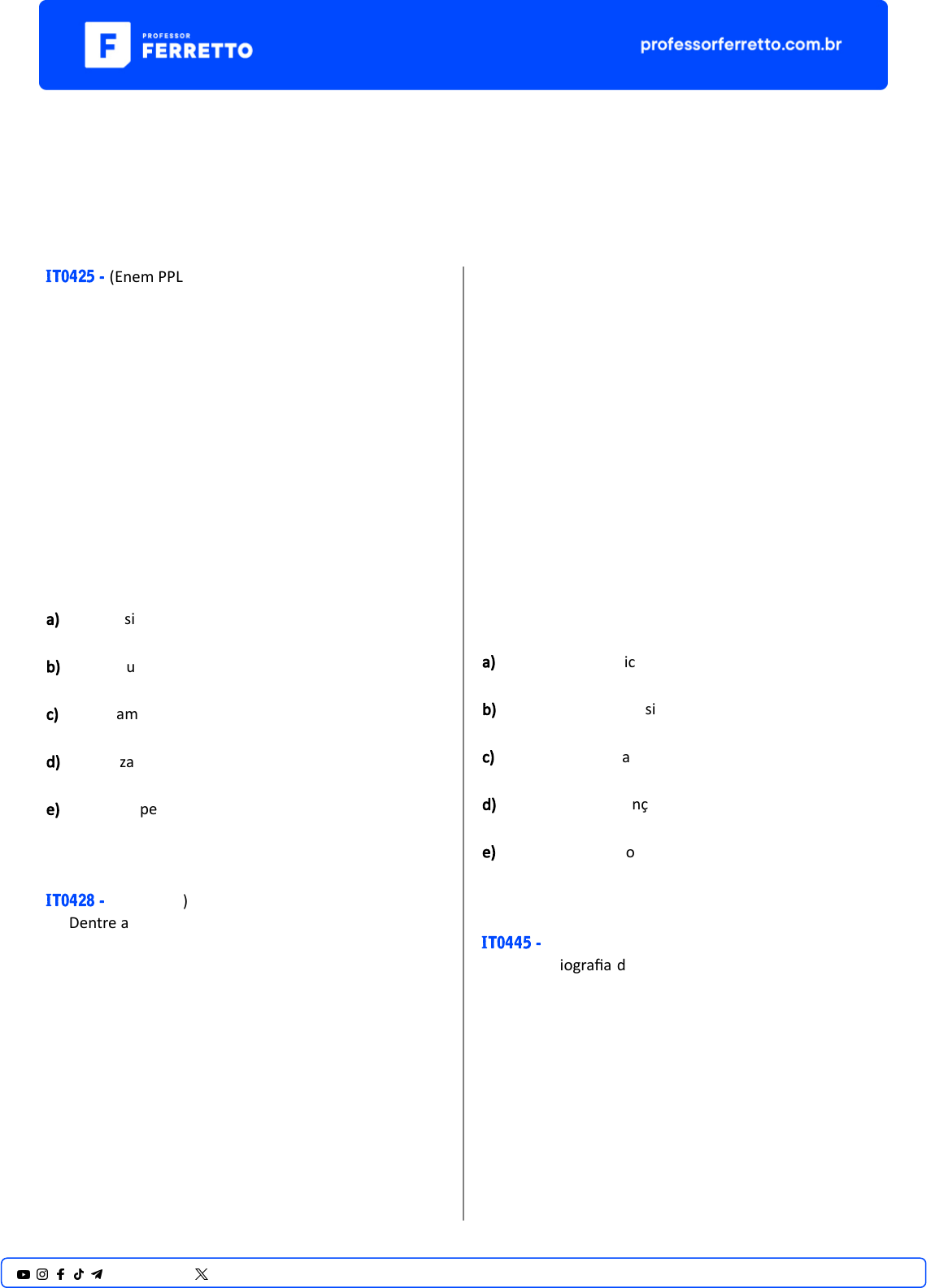 <p>ENEM</p><p>Língua e Patrimônio</p><p>IT0425 - (Enem PPL)</p><p>O povo indígena Wajãpi u�liza o Kusiwa —</p><p>reconhecido como bem imaterial da humanidade em</p><p>2003 — como repertório codificado de padrões gráficos</p><p>que decora e colore o corpo e os objetos. Para além de</p><p>enfeitar, Kusiwa aparece como “arte”, “marca”, “pintura”</p><p>e “desenho”. Esses grafismos ultrapassam a noção</p><p>esté�ca e alcançam a cosmologia e as crenças religiosas.</p><p>ALMEIDA, C. S.; CARDOSO, P. B. Arte coussiouar,</p><p>perspec�vas históricas de alteridade e reconhecimento.</p><p>Espaço Ameríndio, n. 1, jan.-jul. 2021.</p><p>O povo Wajãpi, que vive na Serra do Tumucumaque,</p><p>entre Amapá, Pará e Guiana Francesa, vivencia prá�cas</p><p>culturais que</p><p>a) perdem significado quando desprovidas de elementos</p><p>gráficos.</p><p>b) revelam uma concepção de arte para além de funções</p><p>esté�cas.</p><p>c) funcionam como elementos de representação</p><p>figura�va de seu mundo.</p><p>d) padronizam uma mesma iden�dade gráfica entre</p><p>diferentes povos indígenas.</p><p>e) primam pela u�lização dos grafismos como</p><p>contraposição ao mundo imaginário.</p><p>IT0428 - (Enem PPL)</p><p>Dentre as músicas clássicas que �nham potencial para</p><p>ganhar as ruas das grandes cidades brasileiras, uma se</p><p>destacou e acabou se transformando em um recado ao</p><p>inconsciente cole�vo: se as notas ouvidas lá longe são a</p><p>melodia Für Elise, interpretada ao piano, é um caminhão</p><p>vendendo gás que se aproxima. Essa história, que torna a</p><p>obra do compositor alemão Ludwig van Beethoven um</p><p>meme nacional, começou quando as firmas de venda de</p><p>gás porta a porta queriam uma solução para subs�tuir o</p><p>barulho das buzinas e os gritos de “Ó o gás”. Com o</p><p>obje�vo de diminuir a poluição sonora, a prefeitura de</p><p>São Paulo promulgou a Lei n. 11 016, em 1991, que</p><p>ins�tui que “Fica proibido o uso da buzina, pelos</p><p>caminhões de venda de gás engarrafado a domicílio, para</p><p>anunciar a sua passagem pelas vias e logradouros”.</p><p>Entregadores de empresas de distribuição de gás</p><p>recorreram a chips com músicas livres de direitos</p><p>autorais. No início, não era apenas Für Elise — notas de</p><p>outros temas clássicos também eram ouvidas. Mas a</p><p>força da bagatela beethoveniana composta em 1810</p><p>acabou se sobrepondo às demais e virou pra�camente</p><p>um símbolo.</p><p>Disponível em: www.dw.com. Acesso em: 21 dez. 2020</p><p>(adaptado).</p><p>Ludwig van Beethoven (1770-1827) é mundialmente</p><p>conhecido como um dos maiores representantes da</p><p>música de concerto do período român�co. A adoção de</p><p>uma de suas obras mais difundidas como anúncio de</p><p>venda de gás engarrafado indica a</p><p>a) u�lização da música erudita como forma de educar a</p><p>população em geral.</p><p>b) manutenção da música europeia nos mais variados</p><p>aspectos da cultura brasileira.</p><p>c) contribuição que a obra do compositor alemão tem na</p><p>diminuição da poluição sonora.</p><p>d) modificação da função que uma obra ar�s�ca pode</p><p>sofrer em diferentes épocas e lugares.</p><p>e) ar�culação entre o poder público e as empresas para</p><p>contornar as limitações das leis de direito autoral.</p><p>IT0445 - (Enem PPL)</p><p>A historiografia do país demonstra que foi necessário</p><p>considerável esforço do colonizador português em impor</p><p>sua língua pátria em um território tão extenso. Trata-se</p><p>de um fenômeno polí�co e cultural relevante o fato de,</p><p>na atualidade, a língua portuguesa ser a língua oficial e</p><p>plenamente inteligível de norte a sul do país, apesar das</p><p>especificidades e da grande diversidade dos chamados</p><p>“sotaques” regionais. Esse empreendimento relacionado</p><p>à imposição da língua portuguesa foi adotado como uma</p><p>das estratégias de dominação, ocupação e demarcação</p><p>das fronteiras do território nacional, sucessivamente, em</p><p>pra�camente todos os períodos e regimes polí�cos. Da</p><p>1@professorferretto @prof_ferretto</p><p>Colônia ao Império, da República ao Estado Novo e daí</p><p>em diante.</p><p>Tomemos como exemplo o nheengatu, uma língua</p><p>baseada no tupi an�go e que foi fruto do encontro,</p><p>muitas vezes belicoso e violento, entre o colonizador e as</p><p>populações indígenas da costa brasileira e de grande</p><p>parte da Amazônia. Foi a língua geral de comunicação no</p><p>período colonial até ser banida pelo Marquês de Pombal,</p><p>a par�r de 1758, caindo em pleno processo de desuso e</p><p>decadência a par�r de então. Foram falantes de</p><p>nheengatu que nominaram uma infinidade de lugares,</p><p>paisagens, acidentes geográficos, rios e até cidades.</p><p>Atualmente, resta um pequeno con�ngente de falantes</p><p>dessa língua no extremo norte do país. É u�lizada como</p><p>língua franca em regiões como o Alto Rio Negro, sendo</p><p>inclusive fator de afirmação étnica de grupos indígenas</p><p>que perderam sua língua original, como os Barés,</p><p>Arapaços, Baniwas e Werekenas.</p><p>Disponível em: h�p://desafios.ipea.gov.br. Acesso em: 20</p><p>out. 2021 (adaptado).</p><p>Da leitura do texto, depreende-se que o patrimônio</p><p>linguís�co brasileiro é</p><p>a) cons�tuído por processos históricos e sociais de</p><p>dominação e violência.</p><p>b) decorrente da tenta�va de fusão de diferentes línguas</p><p>indígenas.</p><p>c) exemplifica�vo da miscigenação étnica da sociedade</p><p>nacional.</p><p>d) caracterizado pela diversidade de sotaques e</p><p>regionalismos.</p><p>e) resultado de sucessivas ações de expansão territorial.</p><p>IT0450 - (Enem PPL)</p><p>Pelo modo como seleciona e organiza as informaç