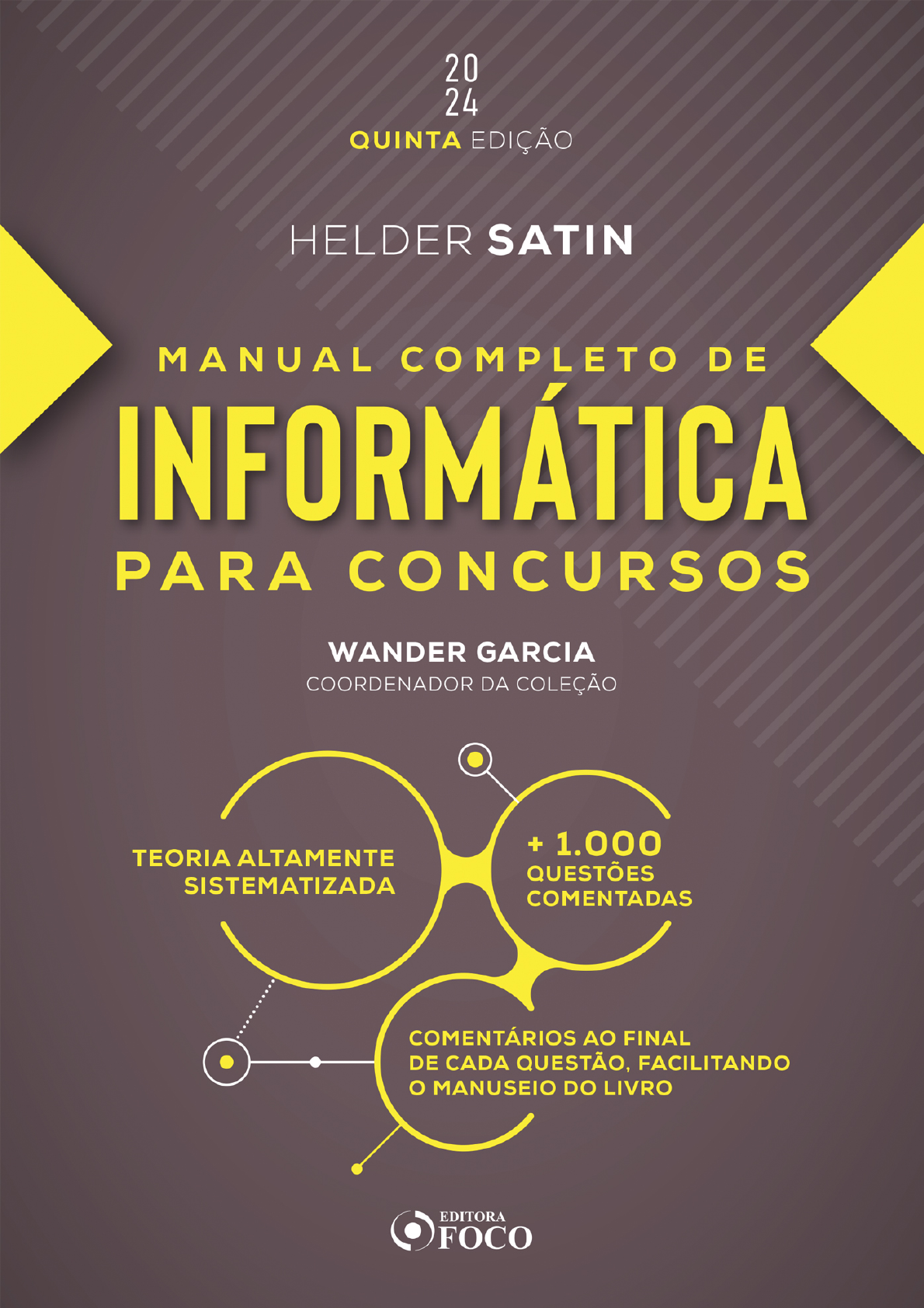 <p>Dados Internacionais de Catalogação na Publicação (CIP) de acordo com ISBD</p><p>S253m</p><p>Satin, Helder Manual Completo de Informática para Concursos [recurso eletrônico] / Helder</p><p>Satin. - 5. ed. - Indaiatuba : Editora Foco, 2024.</p><p>232 p. ; ePUB.</p><p>Inclui bibliografia e índice.</p><p>ISBN: 978-65-5515-799-4 (Ebook) 1. Informática. 2. Manual. 3. Concursos</p><p>Públicos. I. Título.</p><p>2023-1420</p><p>CDD 004</p><p>CDU 004</p><p>Elaborado por Vagner Rodolfo da Silva - CRB-8/9410</p><p>Índices para Catálogo Sistemático: 1. Informática 004 2. Informática 004</p><p>2022 © Editora Foco</p><p>Coordenadores: Wander Garcia Autores: Helder Satin Diretor Acadêmico: Leonardo Pereira</p><p>Editor: Roberta Densa</p><p>Revisora Sênior: Georgia Renata Dias Revisora: Simone Dias</p><p>Capa Criação: Leonardo Hermano Diagramação: Ladislau Lima e Aparecida Lima Produção</p><p>ePub: Booknando</p><p>DIREITOS AUTORAIS: É proibida a reprodução parcial ou total desta publicação, por qualquer</p><p>forma ou meio, sem a prévia autorização da Editora FOCO, com exceção do teor das questões</p><p>de concursos públicos que, por serem atos oficiais, não são protegidas como Direitos Autorais,</p><p>na forma do Artigo 8º, IV, da Lei 9.610/1998. Referida vedação se estende às características</p><p>gráficas da obra e sua editoração. A punição para a violação dos Direitos Autorais é crime</p><p>previsto no Artigo 184 do Código Penal e as sanções civis às violações dos Direitos Autorais</p><p>estão previstas nos Artigos 101 a 110 da Lei 9.610/1998. Os comentários das questões são de</p><p>responsabilidade dos autores.</p><p>NOTAS DA EDITORA:</p><p>Atualizações e erratas: A presente obra é vendida como está, atualizada até a data do seu</p><p>fechamento, informação que consta na página II do livro. Havendo a publicação de legislação</p><p>de suma relevância, a editora, de forma discricionária, se empenhará em disponibilizar</p><p>atualização futura.</p><p>Bônus ou Capítulo On-line: Excepcionalmente, algumas obras da editora trazem conteúdo no</p><p>on-line, que é parte integrante do livro, cujo acesso será disponibilizado durante a vigência da</p><p>edição da obra.</p><p>Erratas: A Editora se compromete a disponibilizar no site www.editorafoco.com.br, na seção</p><p>Atualizações, eventuais erratas por razões de erros técnicos ou de conteúdo. Solicitamos,</p><p>outrossim, que o leitor faça a gentileza de colaborar com a perfeição da obra, comunicando</p><p>eventual erro encontrado por meio de mensagem para contato@editorafoco.com.br. O acesso</p><p>será disponibilizado durante a vigência da edição da obra.</p><p>Data de Fechamento (08.2023)</p><p>2024</p><p>Todos os direitos reservados à</p><p>Editora Foco Jurídico Ltda.</p><p>Avenida Itororó, 348 – Sala 05 – Cidade Nova</p><p>CEP 13334-050 – Indaiatuba – SP</p><p>E-mail: contato@editorafoco.com.br</p><p>www.editorafoco.com.br</p><p>https://www.editorafoco.com.br/</p><p>https://www.editorafoco.com.br/</p><p>SUMÁRIO</p><p>Capa</p><p>Ficha catalográfica</p><p>Folha de rosto</p><p>Créditos</p><p>Dedicatória</p><p>Apresentação</p><p>Parte I Hardware</p><p>1. Hardware</p><p>1.1. PLACA-MÃE</p><p>1.2. PROCESSADOR</p><p>1.3. MEMÓRIAS PRINCIPAIS</p><p>1.4. MEMÓRIAS SECUNDÁRIAS</p><p>1.5. MEMÓRIA VIRTUAL</p><p>1.6. PLACAS E PERIFÉRICOS DE ENTRADA E SAÍDA</p><p>QUESTÕES COMENTADAS DE HARDWARE</p><p>Parte II Office</p><p>1. OFFICE</p><p>1.1. EDITORES DE TEXTO</p><p>1.2. EDITORES DE PLANILHAS</p><p>1.3. EDITORES DE APRESENTAÇÕES</p><p>clbr://internal.invalid/book/OEBPS/Text/cover.xhtml</p><p>QUESTÕES COMENTADAS DE OFFICE</p><p>1. editores de texto</p><p>1.1. OFFICE</p><p>1.2. BROFFICE</p><p>2. EDITORES DE PLANILHAS</p><p>2.1. OFFICE</p><p>2.2. BROFFICE</p><p>3. EDITORES DE APRESENTAÇÃO</p><p>PARTE III BANCO DE DADOS</p><p>1. BANCOS DE DADOS</p><p>1.1. SELECT</p><p>1.2. INSERT</p><p>1.3. UPDATE</p><p>1.4. DELETE</p><p>1.5. TIPOS DE BANCOS DE DADOS</p><p>1.6. OUTROS CONCEITOS</p><p>QUESTÕES COMENTADAS DE BANCOS DE DADOS</p><p>PARTE IV INTERNET</p><p>1. INTERNET</p><p>1.1. NAVEGAÇÃO</p><p>1.2. NAVEGADORES</p><p>1.3. MOTORES DE BUSCA</p><p>1.4. COMUNICAÇÃO ON-LINE</p><p>QUESTÕES COMENTADAS DE Internet</p><p>1. REDE, INTERNET E INTRANET</p><p>2. FERRAMENTAS E APLICATIVOS DE NAVEGAÇÃO</p><p>3. CORREIO ELETRÔNICO</p><p>4. GRUPOS DE DISCUSSÃO</p><p>5. BUSCA E PESQUISA</p><p>PARTE V – SISTEMAS OPERACIONAIS</p><p>1. SISTEMAS OPERACIONAIS</p><p>1.1. LINUX</p><p>1.2. WINDOWS</p><p>1.3. INTERFACE</p><p>1.4. ÍCONES</p><p>1.5. INTERAÇÃO VIA MOUSE</p><p>1.6. ATALHOS DO TECLADO</p><p>1.7. PRINCIPAIS PROGRAMAS</p><p>1.8. SISTEMA DE PASTAS E ARQUIVOS</p><p>1.9. OUTROS CONCEITOS</p><p>QUESTÕES COMENTADAS DE SISTEMAS OPERACIONAIS</p><p>1. REDES DE COMPUTADORES</p><p>1.1. CLASSIFICAÇÕES</p><p>1.2. MODELO OSI</p><p>QUESTÕES COMENTADAS DE REDE DE COMPUTADORES</p><p>PARTE VII SEGURANÇA DA INFORMAÇÃO</p><p>1. SEGURANÇA DA INFORMAÇÃO</p><p>1.1. PRINCÍPIOS BÁSICOS</p><p>1.2. BACKUP</p><p>QUESTÕES COMENTADAS DE SEGURANÇA DA INFORMAÇÃO</p><p>DEDICATÓRIA</p><p>À Stella e Pedro, que a semente do conhecimento brote em seus corações</p><p>Helder Satin</p><p>APRESENTAÇÃO</p><p>Por que você está diante de um MANUAL COMPLETO DE INFORMÁTICA</p><p>para Concursos?</p><p>Porque este MANUAL não se limita a trazer a TEORIA acerca do que é cobrado</p><p>nos concursos públicos. Ele vai além e traz, também, número expressivo de</p><p>QUESTÕES COMENTADAS, assuntos atuais e escrita de fácil entendimento.</p><p>Quanto aos TEMAS ABORDADOS, foram selecionados aqueles de maior</p><p>relevância e incidência em provas de concurso de todo o país, visando uma</p><p>preparação mais objetiva do concursando. É importante salientar que nem todo</p><p>tema será abordado de forma profunda, uma vez que frequentemente é requisitado</p><p>um conhe