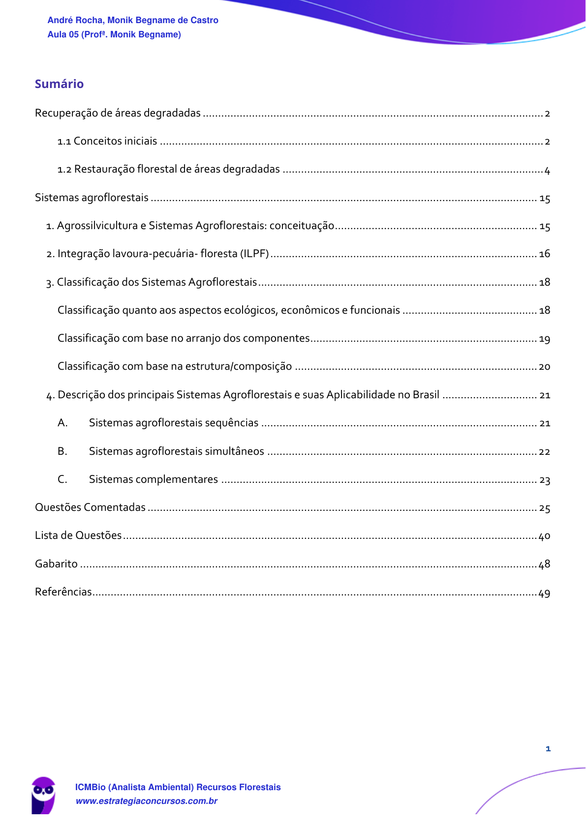 <p>1</p><p>Sumário</p><p>Recuperação de áreas degradadas ............................................................................................................... 2</p><p>1.1 Conceitos iniciais ............................................................................................................................. 2</p><p>1.2 Restauração florestal de áreas degradadas ..................................................................................... 4</p><p>Sistemas agroflorestais .............................................................................................................................. 15</p><p>1. Agrossilvicultura e Sistemas Agroflorestais: conceituação .................................................................. 15</p><p>2. Integração lavoura-pecuária- floresta (ILPF) ....................................................................................... 16</p><p>3. Classificação dos Sistemas Agroflorestais ........................................................................................... 18</p><p>Classificação quanto aos aspectos ecológicos, econômicos e funcionais ............................................ 18</p><p>Classificação com base no arranjo dos componentes .......................................................................... 19</p><p>Classificação com base na estrutura/composição ............................................................................... 20</p><p>4. Descrição dos principais Sistemas Agroflorestais e suas Aplicabilidade no Brasil ............................... 21</p><p>A. Sistemas agroflorestais sequências .......................................................................................... 21</p><p>B. Sistemas agroflorestais simultâneos ........................................................................................ 22</p><p>C. Sistemas complementares ....................................................................................................... 23</p><p>Questões Comentadas ............................................................................................................................... 25</p><p>Lista de Questões ....................................................................................................................................... 40</p><p>Gabarito ..................................................................................................................................................... 48</p><p>Referências ................................................................................................................................................. 49</p><p>André Rocha, Monik Begname de Castro</p><p>Aula 05 (Profª. Monik Begname)</p><p>ICMBio (Analista Ambiental) Recursos Florestais</p><p>www.estrategiaconcursos.com.br</p><p>17028458776 - Vitor Brandão de Souza</p><p>2</p><p>INTRODUÇÃO</p><p>Olá, Estrategistas! Tudo bem?</p><p>Nesta aula iremos estudar sobre: recuperação de áreas degradadas e sistemas agroflorestais. Esses</p><p>assuntos apareceram no último edital da seguinte maneira:</p><p>RECURSOS FLORESTAIS:</p><p>5 Recuperação de áreas degradadas.</p><p>11 Sistemas agroflorestais.</p><p>Espero que você tenha uma boa aula!</p><p>Em caso de dúvidas, entre em contato comigo pelo fórum.</p><p>Abraços,</p><p>Prof.ª Monik Begname</p><p>RECUPERAÇÃO DE ÁREAS DEGRADADAS</p><p>1.1 Conceitos iniciais</p><p>Antes de iniciarmos nosso estudo, irei apresentar alguns termos e conceitos1 aplicados à recuperação de</p><p>áreas degradadas:</p><p>Mata de galeria: corresponde àquela formação mesófila (vegetação adaptada a viver em ambiente com</p><p>mediana disponibilidade de água, no solo e na atmosfera), de qualquer grau de caducidade, que orla um ou</p><p>dois lados de um curso d'água, em uma região em que a vegetação original de interflúvio não seja a de</p><p>floresta continua, assim, estaria presente no cerrado, na caatinga, nos campos etc.</p><p>Mata Ciliar: faixa de floresta mais estreita, limitada à beirada dos diques marginais dos rios, estando</p><p>presente nas regiões em que a vegetação original de interflúvio também é florestal.</p><p>OBS.: Para efeitos práticos, em termos de legislação e recuperação, o termo floresta/mata ciliar tem sido</p><p>amplamente usado para designar, de forma genérica e popular, todos os tipos de formações florestais</p><p>1 MARTINS, S. V. Recuperação de áreas degradadas: ações em Áreas de Preservação Permanente, voçorocas, taludes</p><p>rodoviários e de mineração. Viçosa: Editora Aprenda Fácil, 2017, 266 p.</p><p>André Rocha, Monik Begname de Castro</p><p>Aula 05 (Profª. Monik Begname)</p><p>ICMBio (Analista Ambiental) Recursos Florestais</p><p>www.estrategiaconcursos.com.br</p><p>Adquira uma Assinatura em @Xinyuu_bot - Telegram</p><p>3</p><p>ocorrentes às margens dos cursos d'água, independente do regime de elevação do rio ou lençol freático e</p><p>do tipo de vegetação de interflúvio.</p><p>Resiliência: significa a capacidade que um ecossistema possui de se recuperar de perturbações internas</p><p>naturais ou provocadas pelo homem.</p><p>Por exemplo, a queda de uma árvore numa floresta gera um distúrbio local denominado clareira, que,</p><p>normalmente, em poucos anos, é cicatrizada pelo crescimento de espécies pioneiras que posteriormente</p><p>são substituídas por espécies secundárias iniciais e, na sequência, por tardias e clímax. Portanto, esse</p><p>retorno de uma clareira a uma fase de floresta madura só acontece porque o ecossistema possui resiliência.</p><p>Ecossistema Estável: quando reage a um distúrbio absorvendo o impacto sofrido, sem sofrer mudanças,</p><p>e ajustando-se aos seus processos ecológicos.</p><p>Ex.: Floresta madura após abertura natural de clareira.</p><p>Ecossistema Perturbado: é aquele que, após sofrer um certo distúrbio natural ou mesmo antrópico, ainda</p