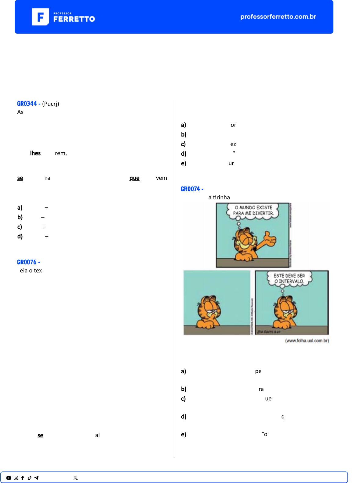 <p>Vestibulares</p><p>Classes do Nome - Pronomes</p><p>GR0344 - (Pucrj)</p><p>Assinale a alterna�va em que está corretamente indicada</p><p>a sequência dos referentes dos termos sublinhados no</p><p>seguinte trecho do Texto.</p><p>“Precisamos dar mais atenção a como os ar�stas</p><p>realmente pensam nas e com as artes — as novas ideias</p><p>que lhes ocorrem, incluindo novas “ideias de arte” ou</p><p>ideias a respeito de suas a�vidades, de seus próprios</p><p>materiais ou ins�tuições —, e depois a como essas ideias</p><p>se enquadram em campos mais amplos, que envolvem</p><p>muitos outros discursos: as ciências, a polí�ca e até a</p><p>própria filosofia."</p><p>a) ar�stas – ideias – campos</p><p>b) ideias – a�vidades – discursos</p><p>c) artes – ideias – materiais</p><p>d) ar�stas – artes – campos</p><p>GR0076 - (Insper)</p><p>Leia o texto para responder à questão.</p><p>27 de janeiro</p><p>Africa</p><p>Nas minhas andanças, fui parar na África e lá</p><p>conversei com aqueles homens da Unesco, os bons, não</p><p>os burocratas. Um deles me disse: “Cada vez que morre</p><p>um velho africano é uma biblioteca que se incendeia.”</p><p>Fiquei pensando no nosso índio. Pensando na</p><p>Amazônia. Indio, escritor e árvore — as três espécies em</p><p>processo de ex�nção. Condenadas ao aniquilamento, o</p><p>índio principalmente. Será que antes de chegarmos à</p><p>solução final do nosso problema indígena teremos tempo</p><p>de captar um pouco da sua arte e de sua vida, nas quais o</p><p>sagrado e a beleza se confundem para alimentar nossa</p><p>cultura e nosso remorso?</p><p>(Lygia Fagundes Telles. A disciplina do amor, 1980.)</p><p>Em “Será que antes de chegarmos à solução final do</p><p>nosso problema indígena teremos tempo de captar um</p><p>pouco da sua arte e de sua vida, nas quais o sagrado e a</p><p>beleza se confundem para alimentar nossa cultura e</p><p>nosso remorso?” (2º parágrafo), o termo sublinhado</p><p>refere-se a</p><p>a) “cultura” e “remorso”.</p><p>b) “arte” e “vida”.</p><p>c) “sagrado” e “beleza”.</p><p>d) “solução final” e “problema indígena”.</p><p>e) “beleza” e “cultura”.</p><p>GR0074 - (Famerp)</p><p>Considere a �rinha Garfield, de Jim Davis.</p><p>O pronome “este”, no terceiro quadrinho,</p><p>a) refere-se ao presente do personagem, em que não há</p><p>diversão.</p><p>b) retoma o sen�do das palavras “o mundo”.</p><p>c) refere-se ao período em que o mundo diverte o</p><p>personagem.</p><p>d) aponta para um momento em que o desejo do</p><p>personagem se realizaria.</p><p>e) retoma o sen�do da frase “o mundo existe para me</p><p>diver�r”.</p><p>1@professorferretto @prof_ferretto</p><p>GR0365 - (Uerj)</p><p>CIVILIZAÇÃO</p><p>A matéria saiu no New York Times, foi publicada</p><p>na Folha de São Paulo; deveria ser bibliografia obrigatória</p><p>do ensino fundamental à pós-graduação, deveria ser</p><p>colada aos postes, lançada de aviões, viralizada nas redes</p><p>sociais, impressa em san�nhos, guardada na carteira, no</p><p>bolso ou no su�ã e lida toda vez que a desilusão, o</p><p>desespero, a melancolia ou mesmo o tédio batesse na</p><p>porta, batesse na aorta: “Para salvar Stradivarius, uma</p><p>cidade inteira fica em silêncio”.</p><p>Antonio Stradivari viveu entre 1644 e 1737 em</p><p>Cremona, norte da Itália, cidadezinha que hoje conta com</p><p>72.267 habitantes. Durante algumas décadas dos séculos</p><p>XVII e XVIII, Stradivari produziu instrumentos de corda,</p><p>como violinos, cujos sons quase quatro séculos de</p><p>conhecimento acumulado não foram capazes de igualar.</p><p>Por muito tempo permaneceu um mistério o que</p><p>fazia aqueles instrumentos tão diferentes dos demais,</p><p>fabricados antes ou depois. Estudos recentes, porém,</p><p>mostraram que, para além da artesania magistral do</p><p>luthier*, um tratamento químico dado à madeira, à</p><p>época da fabricação, interfere na qualidade do som dos</p><p>instrumentos.</p><p>O tempo de uso também entra na equação: a</p><p>secura da madeira e a distância entre as fibras, causada</p><p>pela oxidação, são razões pelas quais, segundo o dr.</p><p>Hwan-Ching Tai, autor de um estudo de 2016, “esses</p><p>velhos violinos vibram mais livremente, o que permite a</p><p>eles expressar uma gama mais ampla de emoções”.</p><p>Se é verdade que os violinos Stradivarius, como</p><p>muitos vinhos, melhoraram com o tempo, é inexorável</p><p>que, em algum momento, avinagrem. Pois esse momento</p><p>se aproxima: depois de quase quatrocentos anos</p><p>espalhando a melhor música que já foi ouvida, os</p><p>violinos, violoncelos e violas de Cremona estão a�ngindo</p><p>seu limite. Logo estarão frágeis demais para serem</p><p>tocados e serão, segundo Fausto Cacciatori, curador do</p><p>Museu do Violino de Cremona, “colocados para dormir”.</p><p>Antecipando-se ao sono derradeiro, os</p><p>moradores de Cremona criaram o Projeto Stradivarius.</p><p>“Por cinco semanas, quatro músicos, tocando dois</p><p>violinos, uma viola e um violoncelo, farão centenas de</p><p>escalas e arpejos, usando técnicas diferentes com arcos,</p><p>ou dedilhando as cordas”, sob “trinta e dois microfones</p><p>de alta sensibilidade”. Três engenheiros de som,</p><p>trancados num quar�nho à prova de qualquer ruído, no</p><p>auditório do museu, gravarão cada uma das centenas de</p><p>milhares de variações sonoras, de modo que, no futuro,</p><p>será possível compor músicas com o som dos</p><p>Stradivarius.</p><p>O projeto já estava quase saindo do papel em</p><p>2017 quando os idealizadores perceberam que o barulho</p><p>em torno do museu impossibilitaria as gravações. O</p><p>prefeito de Cremona, então, permi�u que as ruas da</p><p>região fossem fechadas até que a úl�ma nota fosse</p><p>imortalizada. A cidade ca