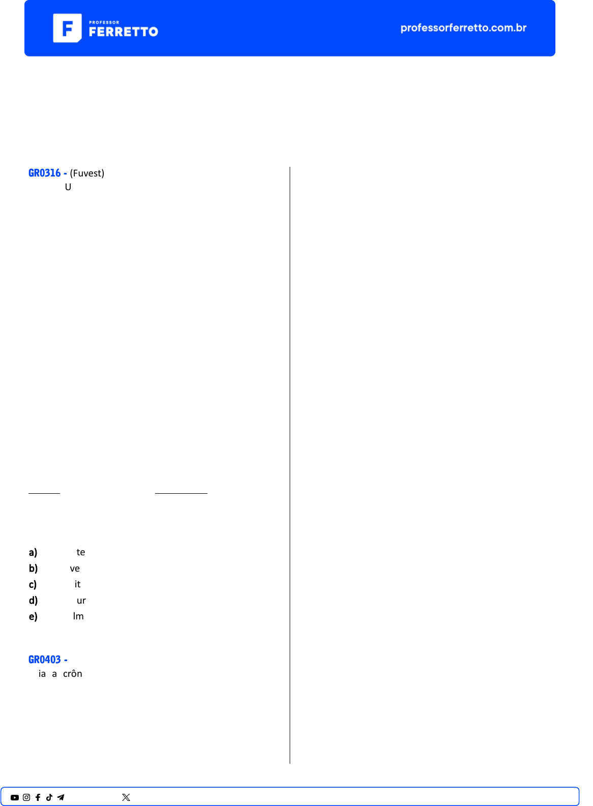 <p>Vestibulares</p><p>Classes Relacionais</p><p>GR0316 - (Fuvest)</p><p>Uma obra de arte é um desafio; não a</p><p>explicamos, ajustamo-nos a ela. Ao interpretá-la, fazemos</p><p>uso dos nossos próprios obje�vos e esforços, dotamo-la</p><p>de um significado que tem sua origem nos nossos</p><p>próprios modos de viver e de pensar. Numa palavra,</p><p>qualquer gênero de arte que, de fato, nos afete, torna-se,</p><p>deste modo, arte moderna.</p><p>As obras de arte, porém, são como al�tudes</p><p>inacessíveis. Não nos dirigimos a elas diretamente, mas</p><p>contornamo-las. Cada geração as vê sob um ângulo</p><p>diferente e sob uma nova visão; nem se deve supor que</p><p>um ponto de vista mais recente é mais eficiente do que</p><p>um anterior.</p><p>Cada aspecto surge na sua altura própria, que</p><p>não pode ser antecipada nem prolongada; e, todavia, o</p><p>seu significado não está perdido porque o significado que</p><p>uma obra assume para uma geração posterior é o</p><p>resultado de uma série completa de interpretações</p><p>anteriores.</p><p>Arnold Hauser, Teorias da arte. Adaptado.</p><p>No trecho “Numa palavra, qualquer gênero de arte que,</p><p>de fato, nos afete, torna-se, deste modo, arte moderna”</p><p>(itálico), as expressões sublinhadas podem ser</p><p>subs�tuídas, sem prejuízo do sen�do do texto,</p><p>respec�vamente, por</p><p>a) realmente; portanto.</p><p>b) invariavelmente; ainda.</p><p>c) com efeito; todavia.</p><p>d) com segurança; também.</p><p>e) possivelmente; até.</p><p>GR0403 - (Unesp)</p><p>Leia a crônica “Seu ‘Afredo’”, de Vinicius de Moraes</p><p>(1913-1980).</p><p>Seu Afredo (ele sempre subtraía o “l” do nome, ao</p><p>se apresentar com uma ligeira curvatura: “Afredo Paiva,</p><p>um seu criado...”) tornou-se inesquecível à minha</p><p>infância porque tratava-se muito mais de um linguista</p><p>que de um encerador. Como encerador, não ia muito lá</p><p>das pernas. Lembro-me que, sempre depois de seu</p><p>trabalho, minha mãe ficava passeando pela sala com uma</p><p>flanelinha debaixo de cada pé, para melhorar o lustro.</p><p>Mas, como linguista, cultor do vernáculo1 e aplicador de</p><p>su�lezas grama�cais, seu Afredo estava sozinho.</p><p>Tratava-se de um mulato quarentão,</p><p>ultrarrespeitador, mas em quem a preocupação</p><p>linguís�ca perturbava às vezes a colocação pronominal.</p><p>Um dia, numa fila de ônibus, minha mãe ficou</p><p>ligeiramente ressabiada2 quando seu Afredo,</p><p>casualmente de passagem, parou junto a ela e</p><p>perguntou-lhe à queima-roupa, na segunda do singular:</p><p>– Onde vais assim tão elegante?</p><p>Nós lhe dávamos uma bruta corda. Ele falava horas a</p><p>fio, no ritmo do trabalho, fazendo os mais deliciosos</p><p>pedan�smos que já me foi dado ouvir. Uma vez, minha</p><p>mãe, em meio à lide3 caseira, queixou-se do fa�gante</p><p>ramerrão4 do trabalho domés�co. Seu Afredo virou-se</p><p>para ela e disse:</p><p>– Dona Lídia, o que a senhora precisa fazer é ir a um</p><p>médico e tomar a sua quilometragem. Diz que é muito</p><p>bão.</p><p>De outra feita, minha �a Graziela, recém-chegada de</p><p>fora, cantarolava ao piano enquanto seu Afredo,</p><p>acocorado perto dela, esfregava cera no soalho. Seu</p><p>Afredo nunca �nha visto minha �a mais gorda. Pois bem:</p><p>chegou-se a ela e perguntou-lhe:</p><p>– Cantas?</p><p>Minha �a, meio surpresa, respondeu com um riso</p><p>amarelo:</p><p>– É, canto às vezes, de brincadeira...</p><p>Mas, um tanto formalizada, foi queixar-se a minha</p><p>mãe, que lhe explicou o temperamento do nosso</p><p>encerador:</p><p>– Não, ele é assim mesmo. Isso não é falta de</p><p>respeito, não. É excesso de... gramá�ca.</p><p>Conta ela que seu Afredo, mal viu minha �a sair,</p><p>chegou-se a ela com ar disfarçado e falou:</p><p>– Olhe aqui, dona Lídia, não leve a mal, mas essa</p><p>menina, sua irmã, se ela pensa que pode cantar no rádio</p><p>1@professorferretto @prof_ferretto</p><p>com essa voz, ‘tá redondamente enganada. Nem em</p><p>programa de calouro!</p><p>E, a seguir, ponderou:</p><p>– Agora, piano é diferente. Pianista ela é!</p><p>E acrescentou:</p><p>– Eximinista pianista!</p><p>(Para uma menina com uma flor, 2009.)</p><p>1 vernáculo: a língua própria de um país; língua nacional.</p><p>2 ressabiado: desconfiado.</p><p>3 lide: trabalho penoso, labuta.</p><p>4 ramerrão: ro�na.</p><p>Em “Conta ela que seu Afredo, mal viu minha �a sair,</p><p>chegou-se a ela com ar disfarçado e falou [...]” (12º</p><p>parágrafo), a conjunção destacada pode ser subs�tuída,</p><p>sem prejuízo para o sen�do do texto, por:</p><p>a) assim como.</p><p>b) logo que.</p><p>c) enquanto.</p><p>d) porque.</p><p>e) ainda que.</p><p>GR0298 - (Unesp)</p><p>Trecho do livro A solidão dos moribundos, do sociólogo</p><p>alemão Norbert Elias.</p><p>Não mais consideramos um entretenimento de</p><p>domingo assis�r a enforcamentos, esquartejamentos e</p><p>suplícios na roda. Assis�mos ao futebol, e não aos</p><p>gladiadores na arena. Se comparados aos da An�guidade,</p><p>nossa iden�ficação com outras pessoas e nosso</p><p>compar�lhamento de seus sofrimentos e morte</p><p>aumentaram. Assis�r a �gres e leões famintos devorando</p><p>pessoas vivas pedaço a pedaço, ou a gladiadores, por</p><p>astúcia e engano, mutuamente se ferindo e matando,</p><p>dificilmente cons�tuiria uma diversão para a qual nos</p><p>prepararíamos com o mesmo prazer que os senadores ou</p><p>o povo romano. Tudo indica que nenhum sen�mento de</p><p>iden�dade unia esses espectadores àqueles que, na</p><p>arena, lutavam por suas vidas. Como sabemos, os</p><p>gladiadores saudavam o imperador ao entrar com as</p><p>palavras “Morituri te salutant” (Os que vão morrer te</p><p>saúdam). Alguns dos imperadores sem dúvida se</p><p>acreditavam imortais. De todo 