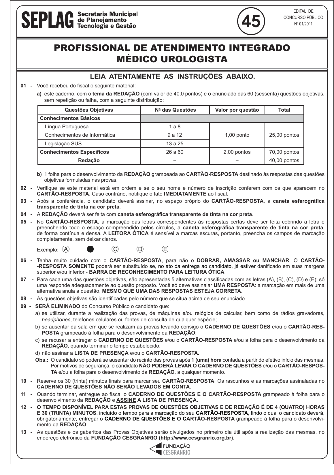 <p>pcimarkpci MDAwMDowMDAwOjAwMDA6MDAwMDowMDAwOmZmZmY6YjEzMzoyMGFm:RnJpLCAxOCBPY3QgMjAyNCAyMjoyMzo0NSAtMDMwMA==</p><p>www.pciconcursos.com.br</p><p>PROFISSIONAL DE ATENDIMENTO INTEGRADO</p><p>MÉDICO UROLOGISTA</p><p>1</p><p>45</p><p>EDITAL DE</p><p>CONCURSO PÚBLICO</p><p>No 01/2011</p><p>PROFISSIONAL DE ATENDIMENTO INTEGRADO</p><p>MÉDICO UROLOGISTA</p><p>LEIA ATENTAMENTE AS INSTRUÇÕES ABAIXO.</p><p>01 - Você recebeu do fiscal o seguinte material:</p><p>a) este caderno, com o tema da REDAÇÃO (com valor de 40,0 pontos) e o enunciado das 60 (sessenta) questões objetivas,</p><p>sem repetição ou falha, com a seguinte distribuição:</p><p>b) 1 folha para o desenvolvimento da REDAÇÃO grampeada ao CARTÃO-RESPOSTA destinado às respostas das questões</p><p>objetivas formuladas nas provas.</p><p>02 - Verifique se este material está em ordem e se o seu nome e número de inscrição conferem com os que aparecem no</p><p>CARTÃO-RESPOSTA. Caso contrário, notifique o fato IMEDIATAMENTE ao fiscal.</p><p>03 - Após a conferência, o candidato deverá assinar, no espaço próprio do CARTÃO-RESPOSTA, a caneta esferográfica</p><p>transparente de tinta na cor preta.</p><p>04 - A REDAÇÃO deverá ser feita com caneta esferográfica transparente de tinta na cor preta.</p><p>05 - No CARTÃO-RESPOSTA, a marcação das letras correspondentes às respostas certas deve ser feita cobrindo a letra e</p><p>preenchendo todo o espaço compreendido pelos círculos, a caneta esferográfica transparente de tinta na cor preta,</p><p>de forma contínua e densa. A LEITORA ÓTICA é sensível a marcas escuras, portanto, preencha os campos de marcação</p><p>completamente, sem deixar claros.</p><p>Exemplo:</p><p>06 - Tenha muito cuidado com o CARTÃO-RESPOSTA, para não o DOBRAR, AMASSAR ou MANCHAR. O CARTÃO-</p><p>-RESPOSTA SOMENTE poderá ser substituído se, no ato da entrega ao candidato, já estiver danificado em suas margens</p><p>superior e/ou inferior - BARRA DE RECONHECIMENTO PARA LEITURA ÓTICA.</p><p>07 - Para cada uma das questões objetivas, são apresentadas 5 alternativas classificadas com as letras (A), (B), (C), (D) e (E); só</p><p>uma responde adequadamente ao quesito proposto. Você só deve assinalar UMA RESPOSTA: a marcação em mais de uma</p><p>alternativa anula a questão, MESMO QUE UMA DAS RESPOSTAS ESTEJA CORRETA.</p><p>08 - As questões objetivas são identificadas pelo número que se situa acima de seu enunciado.</p><p>09 - SERÁ ELIMINADO do Concurso Público o candidato que:</p><p>a) se utilizar, durante a realização das provas, de máquinas e/ou relógios de calcular, bem como de rádios gravadores,</p><p>headphones, telefones celulares ou fontes de consulta de qualquer espécie;</p><p>b) se ausentar da sala em que se realizam as provas levando consigo o CADERNO DE QUESTÕES e/ou o CARTÃO-RES-</p><p>POSTA grampeado à folha para o desenvolvimento da REDAÇÃO;</p><p>c) se recusar a entregar o CADERNO DE QUESTÕES e/ou o CARTÃO-RESPOSTA e/ou a folha para o desenvolvimento da</p><p>REDAÇÃO, quando terminar o tempo estabelecido.</p><p>d) não assinar a LISTA DE PRESENÇA e/ou o CARTÃO-RESPOSTA.</p><p>Obs.: O candidato só poderá se ausentar do recinto das provas após 1 (uma) hora contada a partir do efetivo início das mesmas.</p><p>Por motivos de segurança, o candidato NÃO PODERÁ LEVAR O CADERNO DE QUESTÕES e/ou o CARTÃO-RESPOS-</p><p>TA e/ou a folha para o desenvolvimento da REDAÇÃO, a qualquer momento.</p><p>10 - Reserve os 30 (trinta) minutos finais para marcar seu CARTÃO-RESPOSTA. Os rascunhos e as marcações assinaladas no</p><p>CADERNO DE QUESTÕES NÃO SERÃO LEVADOS EM CONTA.</p><p>11 - Quando terminar, entregue ao fiscal o CADERNO DE QUESTÕES E O CARTÃO-RESPOSTA grampeado à folha para o</p><p>desenvolvimento da REDAÇÃO e ASSINE A LISTA DE PRESENÇA.</p><p>12 - O TEMPO DISPONÍVEL PARA ESTAS PROVAS DE QUESTÕES OBJETIVAS E DE REDAÇÃO É DE 4 (QUATRO) HORAS</p><p>E 30 (TRINTA) MINUTOS, incluído o tempo para a marcação do seu CARTÃO-RESPOSTA, findo o qual o candidato deverá,</p><p>obrigatoriamente, entregar o CADERNO DE QUESTÕES E O CARTÃO-RESPOSTA grampeado à folha para o desenvolvi-</p><p>mento da REDAÇÃO.</p><p>13 - As questões e os gabaritos das Provas Objetivas serão divulgados no primeiro dia útil após a realização das mesmas, no</p><p>endereço eletrônico da FUNDAÇÃO CESGRANRIO (http://www.cesgranrio.org.br).</p><p>Questões Objetivas No das Questões Valor por questão Total</p><p>Conhecimentos Básicos</p><p>Língua Portuguesa 1 a 8</p><p>1,00 ponto 25,00 pontosConhecimentos de Informática 9 a 12</p><p>Legislação SUS 13 a 25</p><p>Conhecimentos Específicos 26 a 60 2,00 pontos 70,00 pontos</p><p>Redação - - 40,00 pontos</p><p>pcimarkpci MDAwMDowMDAwOjAwMDA6MDAwMDowMDAwOmZmZmY6YjEzMzoyMGFm:RnJpLCAxOCBPY3QgMjAyNCAyMjoyMzo0NSAtMDMwMA==</p><p>www.pciconcursos.com.br</p><p>PROFISSIONAL DE ATENDIMENTO INTEGRADO</p><p>MÉDICO UROLOGISTA</p><p>2</p><p>RASCUNHO</p><p>_________________________________________________________________________________________________</p><p>________________________________________________________________________________________________</p><p>_________________________________________________________________________________________________</p><p>________________________________________________________________________________________________</p><p>_________________________________________________________________________________________________</p><p>________________________________________________________________________________________________</p><p>_________________________________________________________________________________________________</p><p>________________________________________________________________________________________________</p><p>_________________________________________________________________________________________________</p><p>________________________________________