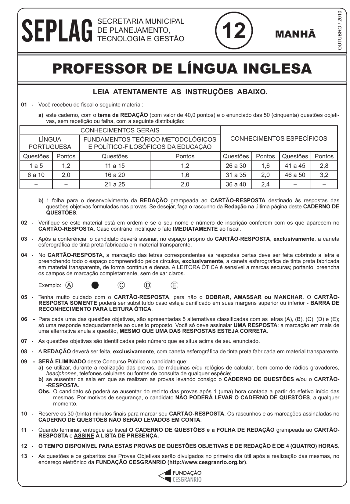 <p>pcimarkpci MDAwMDowMDAwOjAwMDA6MDAwMDowMDAwOmZmZmY6YjEzMzoyMjll:RnJpLCAxOCBPY3QgMjAyNCAyMjoxODo1MyAtMDMwMA==</p><p>www.pciconcursos.com.br</p><p>PROFESSOR DE LÍNGUA INGLESA</p><p>1</p><p>LEIA ATENTAMENTE AS INSTRUÇÕES ABAIXO.</p><p>01 - Você recebeu do fiscal o seguinte material:</p><p>a) este caderno, com o tema da REDAÇÃO (com valor de 40,0 pontos) e o enunciado das 50 (cinquenta) questões objeti-</p><p>vas, sem repetição ou falha, com a seguinte distribuição:</p><p>b) 1 folha para o desenvolvimento da REDAÇÃO grampeada ao CARTÃO-RESPOSTA destinado às respostas das</p><p>questões objetivas formuladas nas provas. Se desejar, faça o rascunho da Redação na última página deste CADERNO DE</p><p>QUESTÕES.</p><p>02 - Verifique se este material está em ordem e se o seu nome e número de inscrição conferem com os que aparecem no</p><p>CARTÃO-RESPOSTA. Caso contrário, notifique o fato IMEDIATAMENTE ao fiscal.</p><p>03 - Após a conferência, o candidato deverá assinar, no espaço próprio do CARTÃO-RESPOSTA, exclusivamente, a caneta</p><p>esferográfica de tinta preta fabricada em material transparente.</p><p>04 - No CARTÃO-RESPOSTA, a marcação das letras correspondentes às respostas certas deve ser feita cobrindo a letra e</p><p>preenchendo todo o espaço compreendido pelos círculos, exclusivamente, a caneta esferográfica de tinta preta fabricada</p><p>em material transparente, de forma contínua e densa. A LEITORA ÓTICA é sensível a marcas escuras; portanto, preencha</p><p>os campos de marcação completamente, sem deixar claros.</p><p>Exemplo:</p><p>05 - Tenha muito cuidado com o CARTÃO-RESPOSTA, para não o DOBRAR, AMASSAR ou MANCHAR. O CARTÃO-</p><p>RESPOSTA SOMENTE poderá ser substituído caso esteja danificado em suas margens superior ou inferior - BARRA DE</p><p>RECONHECIMENTO PARA LEITURA ÓTICA.</p><p>06 - Para cada uma das questões objetivas, são apresentadas 5 alternativas classificadas com as letras (A), (B), (C), (D) e (E);</p><p>só uma responde adequadamente ao quesito proposto. Você só deve assinalar UMA RESPOSTA: a marcação em mais de</p><p>uma alternativa anula a questão, MESMO QUE UMA DAS RESPOSTAS ESTEJA CORRETA.</p><p>07 - As questões objetivas são identificadas pelo número que se situa acima de seu enunciado.</p><p>08 - A REDAÇÃO deverá ser feita, exclusivamente, com caneta esferográfica de tinta preta fabricada em material transparente.</p><p>09 - SERÁ ELIMINADO deste Concurso Público o candidato que:</p><p>a) se utilizar, durante a realização das provas, de máquinas e/ou relógios de calcular, bem como de rádios gravadores,</p><p>headphones, telefones celulares ou fontes de consulta de qualquer espécie;</p><p>b) se ausentar da sala em que se realizam as provas levando consigo o CADERNO DE QUESTÕES e/ou o CARTÃO-</p><p>-RESPOSTA.</p><p>Obs. O candidato só poderá se ausentar do recinto das provas após 1 (uma) hora contada a partir do efetivo início das</p><p>mesmas. Por motivos de segurança, o candidato NÃO PODERÁ LEVAR O CADERNO DE QUESTÕES, a qualquer</p><p>momento.</p><p>10 - Reserve os 30 (trinta) minutos finais para marcar seu CARTÃO-RESPOSTA. Os rascunhos e as marcações assinaladas no</p><p>CADERNO DE QUESTÕES NÃO SERÃO LEVADOS EM CONTA.</p><p>11 - Quando terminar, entregue ao fiscal O CADERNO DE QUESTÕES e a FOLHA DE REDAÇÃO grampeada ao CARTÃO-</p><p>RESPOSTA e ASSINE A LISTA DE PRESENÇA.</p><p>12 - O TEMPO DISPONÍVEL PARA ESTAS PROVAS DE QUESTÕES OBJETIVAS E DE REDAÇÃO É DE 4 (QUATRO) HORAS.</p><p>13 - As questões e os gabaritos das Provas Objetivas serão divulgados no primeiro dia útil após a realização das mesmas, no</p><p>endereço eletrônico da FUNDAÇÃO CESGRANRIO (http://www.cesgranrio.org.br).</p><p>12</p><p>O</p><p>U</p><p>TU</p><p>B</p><p>R</p><p>O</p><p>/</p><p>20</p><p>10</p><p>PROFESSOR DE LÍNGUA INGLESA</p><p>SECRETARIA MUNICIPAL</p><p>DE PLANEJAMENTO,</p><p>TECNOLOGIA E GESTÃO</p><p>CONHECIMENTOS GERAIS</p><p>CONHECIMENTOS ESPECÍFICOSLÍNGUA</p><p>PORTUGUESA</p><p>FUNDAMENTOS TEÓRICO-METODOLÓGICOS</p><p>E POLÍTICO-FILOSÓFICOS DA EDUCAÇÃO</p><p>Questões Pontos Questões Pontos Questões Pontos Questões Pontos</p><p>1 a 5 1,2 11 a 15 1,2 26 a 30 1,6 41 a 45 2,8</p><p>6 a 10 2,0 16 a 20 1,6 31 a 35 2,0 46 a 50 3,2</p><p>− − 21 a 25 2,0 36 a 40 2,4 − −</p><p>MANHÃ</p><p>pcimarkpci MDAwMDowMDAwOjAwMDA6MDAwMDowMDAwOmZmZmY6YjEzMzoyMjll:RnJpLCAxOCBPY3QgMjAyNCAyMjoxODo1MyAtMDMwMA==</p><p>www.pciconcursos.com.br</p><p>PROFESSOR DE LÍNGUA INGLESA 2</p><p>R E D A Ç Ã O</p><p>TEXTO I</p><p>“O grande desafio da escola é descobrir como ser inovadora, não em relação aos meios, às</p><p>novas maneiras de fazer, mas aos fins – resultados sociais a serem obtidos.</p><p>Mudar a escola significa reapropriar-se da educação para a construção de um modelo alter-</p><p>nativo de convivência. Assumir o diferente, trabalhando com a pluralidade trazida pelos professores</p><p>e alunos. Assumir os relatos privados, singulares, fazendo circular as diversas representações oriun-</p><p>das de outros segmentos sociais. Atingir de novo uma escola de todos, construída agora por outras</p><p>vias, valorizando-se a escola como espaço de convivência.</p><p>O importante é que os jovens que frequentam a escola sejam capazes de se organizar e de</p><p>criar suas próprias significações, não como excluídos, mas como sujeitos de uma nova configuração</p><p>cultural. O caminho da cidadania é o mesmo caminho da emancipação. Sem liberdade não se</p><p>constroem sujeitos de transformação social.”</p><p>ABREU, Zuleika Pinho de. Sobre a escola e transformação social. In: Ciclo de Estudos 2004.</p><p>Caderno de textos no 5. Rio de Janeiro: Fundação Darcy Ribeiro, 2004, p.14. (Adaptado).</p><p>TEXTO II</p><p>“Propor que a escola trate questões sociais na perspectiva da cidadania coloca imediata-</p><p>mente a questão da formação dos educ