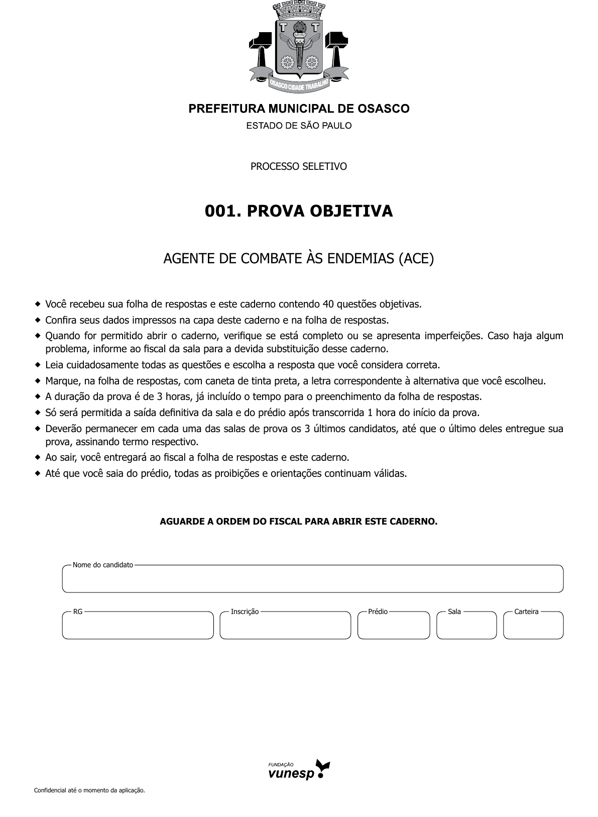 <p>Confidencial até o momento da aplicação.</p><p>Processo seletivo</p><p>001. Prova objetiva</p><p>agente de combate às endemias (ace)</p><p>� você recebeu sua folha de respostas e este caderno contendo 40 questões objetivas.</p><p>� Confira seus dados impressos na capa deste caderno e na folha de respostas.</p><p>� Quando for permitido abrir o caderno, verifique se está completo ou se apresenta imperfeições. Caso haja algum</p><p>problema, informe ao fiscal da sala para a devida substituição desse caderno.</p><p>� Leia cuidadosamente todas as questões e escolha a resposta que você considera correta.</p><p>� Marque, na folha de respostas, com caneta de tinta preta, a letra correspondente à alternativa que você escolheu.</p><p>� A duração da prova é de 3 horas, já incluído o tempo para o preenchimento da folha de respostas.</p><p>� Só será permitida a saída definitiva da sala e do prédio após transcorrida 1 hora do início da prova.</p><p>� Deverão permanecer em cada uma das salas de prova os 3 últimos candidatos, até que o último deles entregue sua</p><p>prova, assinando termo respectivo.</p><p>� Ao sair, você entregará ao fiscal a folha de respostas e este caderno.</p><p>� Até que você saia do prédio, todas as proibições e orientações continuam válidas.</p><p>aguarde a ordem do fiscal Para abrir este caderno.</p><p>Nome do candidato</p><p>Prédio sala carteiraInscriçãorg</p><p>Thiago Oliveira Paes - thiagooliveira62@live.com - CPF: 508.787.038-45</p><p>Confidencial até o momento da aplicação.</p><p>Thiago Oliveira Paes - thiagooliveira62@live.com - CPF: 508.787.038-45</p><p>3 PMOS2102/001-AgCombateEndemiasConfidencial até o momento da aplicação.</p><p>conhecimentos gerais</p><p>Língua Portuguesa</p><p>Leia o texto de Ruy Castro para responder às questões de</p><p>números 01 a 06.</p><p>Lúcidos e surdos</p><p>Em 1991, fui entrevistar o fabuloso Antonio Nássara</p><p>para meu livro “O Anjo Pornográfico”, sobre Nelson Rodri-</p><p>gues. Nássara era cartunista, artista gráfico e o último rema-</p><p>nescente de “Crítica”, jornal do pai de Nelson, empastelado1</p><p>em 1930. Aos 81 anos, estava 100% lúcido e surdo. Eu tinha</p><p>de escrever a pergunta com Pilot2 num bloco gigante. Nás-</p><p>sara a lia e me respondia – aos berros, como se eu, como</p><p>ele, fosse surdo.</p><p>Nássara fora também coautor de marchinhas como</p><p>“Alá-lá-ô” e sambas como “Meu consolo é você”. Era cruel</p><p>que um homem capaz de tais maravilhas e que conviveu com</p><p>os grandes cantores e músicos de seu tempo vivesse agora</p><p>num mundo de silêncio. Sua surdez decorria apenas da idad e</p><p>– porque toda a música que lhe passou pela vida, mesmo</p><p>quando em alto volume, ainda era tocada a níveis compatí-</p><p>veis com o ouvido humano.</p><p>Desde então, uma multidão já chegou ou chegará ao</p><p>n ível de surdez de Nássara, só que muito mais cedo. Segun-</p><p>do pesquisa da Associação de Fonoaudiologia dos EUA, 15%</p><p>das crianças americanas em idade escolar registraram perda</p><p>a uditiva permanente, provocada por ruído ambiente – trânsito,</p><p>sirenes, britadeiras, secadores de cabelo, lanchonetes, shows</p><p>em arenas fechadas – ou por dispositivos musicais portáteis.</p><p>Nestes, a música que se toca pode chegar a 110 decibéis, o</p><p>equivalente a uma serra elétrica.</p><p>A pesquisa acusou que 35% dos adultos e 59% dos ado-</p><p>lescentes usuários desses dispositivos admitiram fazê-lo com</p><p>volume muito alto e durante várias horas por dia. Daí apre-</p><p>sentarem os sintomas de surdez que só deveriam ter aos</p><p>60 anos. Tudo isso vale também para o Brasil.</p><p>Um dia, com sorte, a surdez será total, planetária, e pas-</p><p>saremos a ouvir apenas a música das esferas.</p><p>(Folha de S.Paulo, 01.04.2013. Adaptado)</p><p>empastelado1: depredado, que teve as instalações destruídas por motivos</p><p>políticos ou pessoais.</p><p>Pilot 2: caneta hidrográfica de traço largo.</p><p>01. Assinale a alternativa correta a respeito das informações</p><p>do texto.</p><p>(A) O escritor informa aos leitores que Antonio Nássara,</p><p>além de artista gráfico, no auge da juventude foi um</p><p>cantor muito famoso.</p><p>(B) Nássara, com 81 anos, havia se tornado comple-</p><p>tamente surdo por causa de sua saúde frequente-</p><p>mente debilitada.</p><p>(C) A vida de Nássara era conteúdo importante para o</p><p>novo livro, porém percebe-se que o escritor é indife-</p><p>rente à situação do entrevistado.</p><p>(D) Os pesquisadores constataram que são os adultos</p><p>os que mais sofrem com a perda auditiva definitiva</p><p>devido ao uso de dispositivos eletrônicos.</p><p>(E) O texto faz um paralelo entre a surdez de Nássara e</p><p>a surdez precoce que vem atingindo diferentes</p><p>faixas etárias em razão do excesso de ruídos.</p><p>02. O termo destacado no trecho do texto pode ser substi-</p><p>tuído, sem alteração de sentido, pelo termo indicado</p><p>e ntre parênteses na alternativa:</p><p>(A) Aos 81 anos, estava 100% lúcido e surdo. (consciente)</p><p>(B) … ainda era tocada a níveis compatíveis com o</p><p>o uvido humano. (inconciliáveis)</p><p>(C) …15% das crianças americanas em idade escolar</p><p>registraram perda auditiva permanente… (eventual)</p><p>(D) … britadeiras, secadores de cabelo, lanchonetes,</p><p>shows em arenas fechadas… (seguras)</p><p>(E) Daí apresentarem os sintomas de surdez que só</p><p>d everiam ter aos 60 anos. (simularem)</p><p>03. Considere os trechos do texto.</p><p>• Eu tinha de escrever a pergunta com Pilot num bloco</p><p>gigante. (1o parágrafo)</p><p>• Desde então, uma multidão já chegou ou chegará ao</p><p>nível de surdez de Nássara, só que muito mais cedo.</p><p>(3o parágrafo)</p><p>As formas verbais destacadas contribuem, respectiva-</p><p>mente, para e