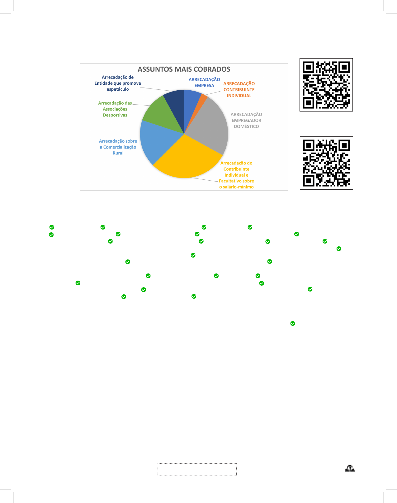 <p>75Número de acertos = ______</p><p>Questões resolvidas</p><p>Vídeo-Aula</p><p>5.AS NORMAS DE ARRECADAÇÃO</p><p>Áudio-Aula</p><p>5 Arrecadação do empregado</p><p>Antes da reforma da previdência, sobre as alíquotas dos empregados, do empregador doméstico e do avulso,</p><p>as alíquotas eram progressivas e cumulativas variando de 7,5% a 14%. Então, quais são atualmente as alíquo-</p><p>tas a serem recolhidas por essas três categorias de segurados? 7,5 / 9% / 12% e 14%, de forma progressiva e</p><p>cumulativa.</p><p>Cabe destacar que, atualmente, esses percentuais de 7,5 / 9% e 12% ou 14%, irão incidir sobre parcelas de</p><p>uma mesma remuneração. Exemplificando: imagine que João receba o teto da Previdência Social. A sua con-</p><p>tribuição será composta de: sobre a parcela de até o salário-mínimo (R$1.212,00) incidirá, incidirá a alíquota de</p><p>7,5%; sobre a parcela acima desse valor (R$1.212,01 a R$2.427,35), a alíquota será de 9%; sobre a parcela</p><p>acima desse valor (R$2.427,36 a R$3.641,03), será valor 12% e, por último, sobre a parcela acima desse valor,</p><p>14%. Ao final, irá ocorrer uma soma desses valores.</p><p>Edital - Seguridade Social para o concurso INSS</p><p>1 Seguridade Social. 1.1 Origem e evolução legislativa no Brasil. 1.2 Conceituação. 1.3 Organização e princípios constitucional.</p><p>2 Legislação Previdenciária. 2.1 Conteúdo, fontes, autonomia. 2.3 Aplicação das normas previdenciárias. 2.3.1 Vigência, hierarquia,</p><p>interpretação e integração. 3 Regime Geral de Previdência Social. 3.1 Segurados obrigatórios. 3.2 Filiação e inscrição. 3.3 Conceito,</p><p>características e abrangência: empregado, empregado doméstico, contribuinte individual, trabalhador avulso e segurado especial. 3.4 Se-</p><p>gurado facultativo: conceito, características, filiação e inscrição. 3.5 Trabalhadores excluídos do Regime Geral.4 Empresa e empregador</p><p>doméstico: conceito previdenciário. 5 Financiamento da Seguridade Social. 5.1 Receitas da União. 5.2 Receitas das contribuições sociais:</p><p>dos segurados, das empresas, do empregador doméstico, do produtor rural, do clube de futebol profissional, sobre a receita de concursos</p><p>de prognósticos, receitas de outras fontes. 5.3 Salário-de-contribuição. 5.3.1 Conceito. 5.3.2 Parcelas integrantes e parcelas não-</p><p>integrantes. 5.3.3 Limites mínimo e máximo. 5.3.4 Proporcionalidade. 5.3.5 Reajustamento. 5.4 Arrecadação e recolhimento das con-</p><p>tribuições destinadas à seguridade social. 5.4.1 Competência do INSS e da Secretaria da Receita Federal do Brasil. 5.4.2 Obrigações da</p><p>empresa e demais contribuintes. 5.4.3 Prazo de recolhimento. 5.4.4 Recolhimento fora do prazo: juros, multa e atualização monetária.6</p><p>Decadência e prescrição.7 Crimes contra a Seguridade Social.8 Recurso das decisões administrativas.9 Plano de Benefícios da Previdência</p><p>Social: beneficiários, espécies de prestações, benefícios, disposições gerais e específicas, períodos de carência, salário-de-benefício, renda</p><p>mensal do benefício, reajustamento do valor dos benefícios.10 Manutenção, perda e restabelecimento da qualidade de segurado.11 Lei no</p><p>8.212/1991 e alterações.12 Lei no 8.213/1991 e alterações.13 Decreto no 3.048, de 06/05/1999 e alterações. 14 Lei de Assistência Social</p><p>(LOAS): conteúdo; fontes e autonomia (Lei no 8.742/1993 e Decreto no 6.214/2007 e alterações).</p><p>76 Número de acertos = ______</p><p>Questões resolvidas</p><p>EXEMPLIFICANDO</p><p>Imagine um médico contratando um eletricista para consertar instalações elétricas do seu consultório. O médico</p><p>vai remunerar o serviço, mas a responsabilidade pelo recolhimento da contribuição do segurado é do próprio</p><p>eletricista.</p><p>EXEMPLIFICANDO</p><p>Imagine Marcio, segurado empregado, que receba R$ 2.000,00 por mês. No mês de junho, seu empregador lhe adianta R$ 1.000,00 de</p><p>13º. Nesse mês, não incide a contribuição previdenciária. No dia 20 de dezembro, Marcio recebe a última parcela do 13º no valor de R$</p><p>1.000,00. Nesse pagamento, haverá a incidência da contribuição previdenciária sobre o valor bruto, ou seja, sobre R$ 2.000,00. Portanto,</p><p>Marcio contribuirá com 9% sobre R$ 2.000,00</p><p>Áudio-Aula</p><p>Questões</p><p>5.1. Arrecadação da empresa</p><p>Toda empresa é obrigada a carrear aos cofres públicos a contribuição do segurado em-</p><p>pregado, do trabalhador avulso e do contribuinte individual que esteja a seu serviço,</p><p>devendo realizar desconto da remuneração e as contribuições a sua responsabilidade que</p><p>incidem sobre a totalidade das remunerações pagas, incluindo adiantamentos de reajuste</p><p>salarial, acordo ou convenção coletiva, aos segurados empregados, contribuinte individual</p><p>e trabalhador avulso a seu serviço, no dia 20 do mês seguinte ao que se referirem as</p><p>remunerações, assim como as importâncias retidas das pessoas jurídicas que prestem ser-</p><p>viços mediante cessão de mão de obra, no dia 20 do mês seguinte àquele da emissão da nota fiscal ou fatura</p><p>(antecipando-se o vencimento para o dia útil anterior quando não houver expediente bancário no dia 20).Sobre a</p><p>gratificação natalina (décimo terceiro salário), o desconto da contribuição do segurado que incide sobre o valor</p><p>bruto é devido a partir do pagamento ou crédito da última parcela e deverá ser calculado de forma separada, e</p><p>recolhida juntamente com a contribuição a cargo da empresa, até o dia 20 do mês de dezembro, antecipando-</p><p>-se o vencimento para o dia útil imediatamente anterior se não houver expediente bancário no dia 20.</p><p>5.2. Arrecadação do Contribuinte Individual</p><p>O segurado contribuinte individual, ao exercer atividade econômica por sua conta ou prestar serviço a pessoa</