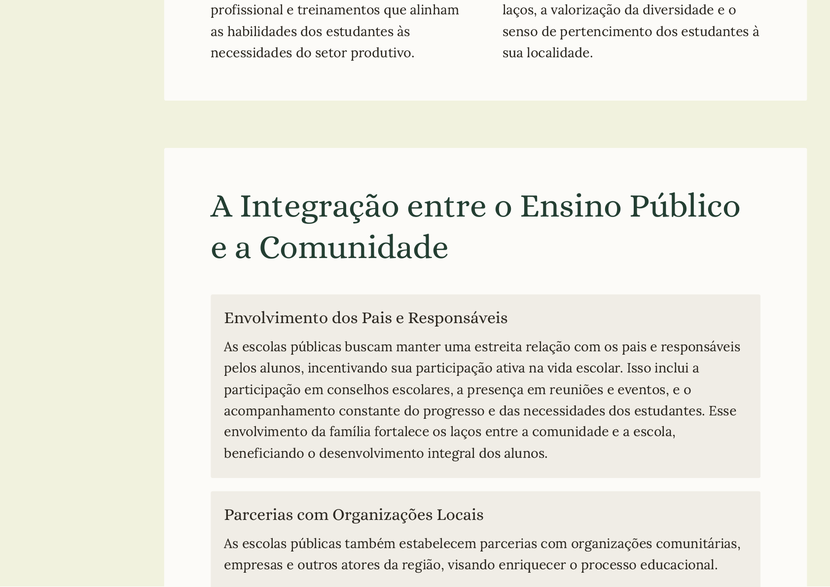 <p>profissional e treinamentos que alinham</p><p>as habilidades dos estudantes às</p><p>necessidades do setor produtivo.</p><p>laços, a valorização da diversidade e o</p><p>senso de pertencimento dos estudantes à</p><p>sua localidade.</p><p>A Integração entre o Ensino Público</p><p>e a Comunidade</p><p>Envolvimento dos Pais e Responsáveis</p><p>As escolas públicas buscam manter uma estreita relação com os pais e responsáveis</p><p>pelos alunos, incentivando sua participação ativa na vida escolar. Isso inclui a</p><p>participação em conselhos escolares, a presença em reuniões e eventos, e o</p><p>acompanhamento constante do progresso e das necessidades dos estudantes. Esse</p><p>envolvimento da família fortalece os laços entre a comunidade e a escola,</p><p>beneficiando o desenvolvimento integral dos alunos.</p><p>Parcerias com Organizações Locais</p><p>As escolas públicas também estabelecem parcerias com organizações comunitárias,</p><p>empresas e outros atores da região, visando enriquecer o processo educacional.</p><p>Essas iniciativas podem envolver a oferta de estágios, a doação de equipamentos e</p><p>materiais didáticos, a realização de palestras e oficinas, e até mesmo a construção</p><p>conjunta de projetos voltados para o desenvolvimento local. Essa integração da</p><p>escola com a comunidade amplia as oportunidades de aprendizagem e prepara</p><p>melhor os estudantes para o mundo do trabalho.</p><p>Eventos e Atividades Comunitárias</p><p>As escolas públicas também se tornam espaços de convivência e integração</p><p>comunitária, por meio da realização de eventos, feiras e atividades abertas à</p><p>população. Essas iniciativas envolvem a comunidade no cotidiano escolar,</p><p>fortalecendo os laços de pertencimento e a valorização do ensino público como um</p><p>bem comum. Além disso, a utilização das instalações escolares pela comunidade fora</p><p>do horário letivo também contribui para essa integração.</p><p>Principais Desafios da Educação</p><p>Digital no Ensino Público</p><p>Acesso Desigual à Tecnologia Capacitação Docente Insuficiente</p>