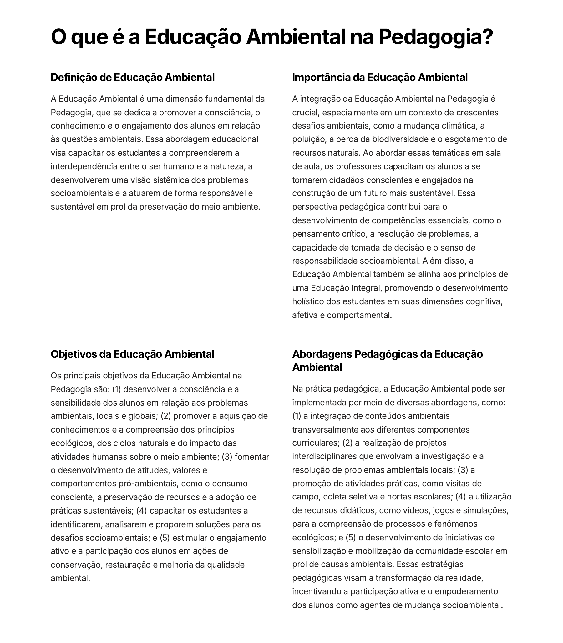 <p>O que é a Educação Ambiental na Pedagogia?</p><p>Definição de Educação Ambiental</p><p>A Educação Ambiental é uma dimensão fundamental da</p><p>Pedagogia, que se dedica a promover a consciência, o</p><p>conhecimento e o engajamento dos alunos em relação</p><p>às questões ambientais. Essa abordagem educacional</p><p>visa capacitar os estudantes a compreenderem a</p><p>interdependência entre o ser humano e a natureza, a</p><p>desenvolverem uma visão sistêmica dos problemas</p><p>socioambientais e a atuarem de forma responsável e</p><p>sustentável em prol da preservação do meio ambiente.</p><p>Importância da Educação Ambiental</p><p>A integração da Educação Ambiental na Pedagogia é</p><p>crucial, especialmente em um contexto de crescentes</p><p>desafios ambientais, como a mudança climática, a</p><p>poluição, a perda da biodiversidade e o esgotamento de</p><p>recursos naturais. Ao abordar essas temáticas em sala</p><p>de aula, os professores capacitam os alunos a se</p><p>tornarem cidadãos conscientes e engajados na</p><p>construção de um futuro mais sustentável. Essa</p><p>perspectiva pedagógica contribui para o</p><p>desenvolvimento de competências essenciais, como o</p><p>pensamento crítico, a resolução de problemas, a</p><p>capacidade de tomada de decisão e o senso de</p><p>responsabilidade socioambiental. Além disso, a</p><p>Educação Ambiental também se alinha aos princípios de</p><p>uma Educação Integral, promovendo o desenvolvimento</p><p>holístico dos estudantes em suas dimensões cognitiva,</p><p>afetiva e comportamental.</p><p>Objetivos da Educação Ambiental</p><p>Os principais objetivos da Educação Ambiental na</p><p>Pedagogia são: (1) desenvolver a consciência e a</p><p>sensibilidade dos alunos em relação aos problemas</p><p>ambientais, locais e globais; (2) promover a aquisição de</p><p>conhecimentos e a compreensão dos princípios</p><p>ecológicos, dos ciclos naturais e do impacto das</p><p>atividades humanas sobre o meio ambiente; (3) fomentar</p><p>o desenvolvimento de atitudes, valores e</p><p>comportamentos pró-ambientais, como o consumo</p><p>consciente, a preservação de recursos e a adoção de</p><p>práticas sustentáveis; (4) capacitar os estudantes a</p><p>identificarem, analisarem e proporem soluções para os</p><p>desafios socioambientais; e (5) estimular o engajamento</p><p>ativo e a participação dos alunos em ações de</p><p>conservação, restauração e melhoria da qualidade</p><p>ambiental.</p><p>Abordagens Pedagógicas da Educação</p><p>Ambiental</p><p>Na prática pedagógica, a Educação Ambiental pode ser</p><p>implementada por meio de diversas abordagens, como:</p><p>(1) a integração de conteúdos ambientais</p><p>transversalmente aos diferentes componentes</p><p>curriculares; (2) a realização de projetos</p><p>interdisciplinares que envolvam a investigação e a</p><p>resolução de problemas ambientais locais; (3) a</p><p>promoção de atividades práticas, como visitas de</p><p>campo, coleta seletiva e hortas escolares; (4) a utilização</p><p>de recursos didáticos, como vídeos, jogos e simulações,</p><p>para a compreensão de processos e fenômenos</p><p>ecológicos; e (5) o desenvolvimento de iniciativas de</p><p>sensibilização e mobilização da comunidade escolar em</p><p>prol de causas ambientais. Essas estratégias</p><p>pedagógicas visam a transformação da realidade,</p><p>incentivando a participação ativa e o empoderamento</p><p>dos alunos como agentes de mudança socioambiental.</p><p>Qual é a importância da Pesquisa na Atividade</p><p>Docente?</p><p>Melhoria das Práticas Pedagógicas</p><p>A pesquisa desempenha um papel fundamental na</p><p>atividade docente, pois permite que os professores</p><p>desenvolvam uma prática pedagógica cada vez mais</p><p>fundamentada, eficaz e adaptada às necessidades de</p><p>seus alunos. Ao se engajarem em investigações, os</p><p>educadores têm a oportunidade de explorar novas</p><p>abordagens de ensino, analisar criticamente seus</p><p>métodos atuais e identificar estratégias inovadoras que</p><p>possam enriquecer seus repertórios didáticos. Essa</p><p>postura investigativa e reflexiva contribui diretamente</p><p>para a melhoria contínua da qualidade do ensino,</p><p>beneficiando diretamente a aprendizagem e o</p><p>desenvolvimento integral dos estudantes.</p><p>Aprimoramento da Formação Docente</p><p>Além de impactar a prática pedagógica, a pesquisa</p><p>também desempenha um papel fundamental no</p><p>aprimoramento da formação dos próprios professores.</p><p>Ao se envolverem em projetos de investigação, os</p><p>educadores têm a oportunidade de se manterem</p><p>atualizados em relação aos avanços teóricos e</p><p>metodológicos de sua área de atuação, ampliando seus</p><p>conhecimentos especializados. Essa postura de</p><p>constante aprendizado e atualização profissional é</p><p>essencial para que os docentes possam oferecer</p><p>experiências de ensino cada vez mais alinhadas às</p><p>demandas do mundo contemporâneo, preparando</p><p>melhor seus alunos para os desafios futuros.</p><p>Promoção da Autonomia e Liderança</p><p>Docente</p><p>Ao se engajar em atividades de pesquisa, os professores</p><p>também desenvolvem habilidades fundamentais, como o</p><p>pensamento crítico, a resolução de problemas e a</p><p>tomada de decisões fundamentadas. Essa postura</p><p>investigativa e autônoma fortalece sua identidade</p><p>profissional, capacitando-os a se tornarem agentes</p><p>ativos na construção do conhecimento e na liderança de</p><p>transformações educacionais. Quando os docentes</p><p>assumem esse papel de pesquisadores, eles não apenas</p><p>melhoram sua própria prática, mas também se tornam</p><p>líderes capazes de influenciar positivamente todo o</p><p>sistema educacional, compartilhando suas descobertas e</p><p>inovações com a comunidade escolar.</p><p>C
