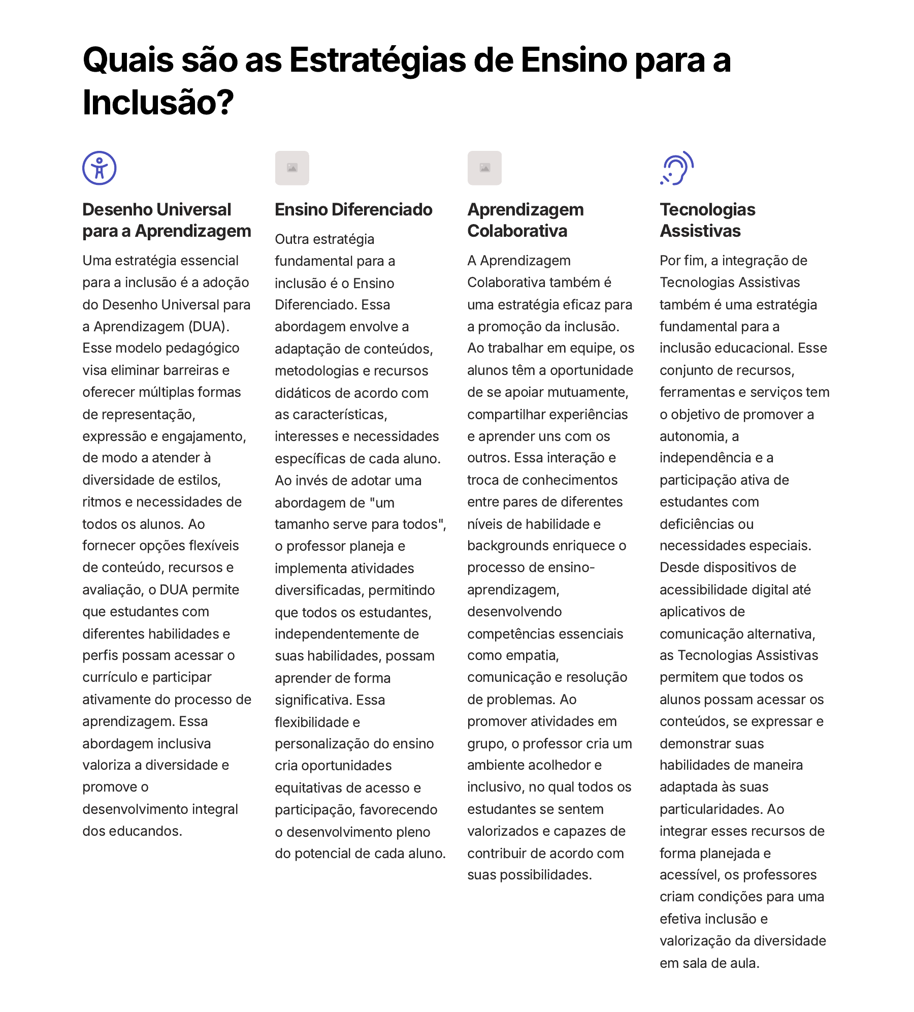 <p>Quais são as Estratégias de Ensino para a</p><p>Inclusão?</p><p>Desenho Universal</p><p>para a Aprendizagem</p><p>Uma estratégia essencial</p><p>para a inclusão é a adoção</p><p>do Desenho Universal para</p><p>a Aprendizagem (DUA).</p><p>Esse modelo pedagógico</p><p>visa eliminar barreiras e</p><p>oferecer múltiplas formas</p><p>de representação,</p><p>expressão e engajamento,</p><p>de modo a atender à</p><p>diversidade de estilos,</p><p>ritmos e necessidades de</p><p>todos os alunos. Ao</p><p>fornecer opções flexíveis</p><p>de conteúdo, recursos e</p><p>avaliação, o DUA permite</p><p>que estudantes com</p><p>diferentes habilidades e</p><p>perfis possam acessar o</p><p>currículo e participar</p><p>ativamente do processo de</p><p>aprendizagem. Essa</p><p>abordagem inclusiva</p><p>valoriza a diversidade e</p><p>promove o</p><p>desenvolvimento integral</p><p>dos educandos.</p><p>Ensino Diferenciado</p><p>Outra estratégia</p><p>fundamental para a</p><p>inclusão é o Ensino</p><p>Diferenciado. Essa</p><p>abordagem envolve a</p><p>adaptação de conteúdos,</p><p>metodologias e recursos</p><p>didáticos de acordo com</p><p>as características,</p><p>interesses e necessidades</p><p>específicas de cada aluno.</p><p>Ao invés de adotar uma</p><p>abordagem de "um</p><p>tamanho serve para todos",</p><p>o professor planeja e</p><p>implementa atividades</p><p>diversificadas, permitindo</p><p>que todos os estudantes,</p><p>independentemente de</p><p>suas habilidades, possam</p><p>aprender de forma</p><p>significativa. Essa</p><p>flexibilidade e</p><p>personalização do ensino</p><p>cria oportunidades</p><p>equitativas de acesso e</p><p>participação, favorecendo</p><p>o desenvolvimento pleno</p><p>do potencial de cada aluno.</p><p>Aprendizagem</p><p>Colaborativa</p><p>A Aprendizagem</p><p>Colaborativa também é</p><p>uma estratégia eficaz para</p><p>a promoção da inclusão.</p><p>Ao trabalhar em equipe, os</p><p>alunos têm a oportunidade</p><p>de se apoiar mutuamente,</p><p>compartilhar experiências</p><p>e aprender uns com os</p><p>outros. Essa interação e</p><p>troca de conhecimentos</p><p>entre pares de diferentes</p><p>níveis de habilidade e</p><p>backgrounds enriquece o</p><p>processo de ensino-</p><p>aprendizagem,</p><p>desenvolvendo</p><p>competências essenciais</p><p>como empatia,</p><p>comunicação e resolução</p><p>de problemas. Ao</p><p>promover atividades em</p><p>grupo, o professor cria um</p><p>ambiente acolhedor e</p><p>inclusivo, no qual todos os</p><p>estudantes se sentem</p><p>valorizados e capazes de</p><p>contribuir de acordo com</p><p>suas possibilidades.</p><p>Tecnologias</p><p>Assistivas</p><p>Por fim, a integração de</p><p>Tecnologias Assistivas</p><p>também é uma estratégia</p><p>fundamental para a</p><p>inclusão educacional. Esse</p><p>conjunto de recursos,</p><p>ferramentas e serviços tem</p><p>o objetivo de promover a</p><p>autonomia, a</p><p>independência e a</p><p>participação ativa de</p><p>estudantes com</p><p>deficiências ou</p><p>necessidades especiais.</p><p>Desde dispositivos de</p><p>acessibilidade digital até</p><p>aplicativos de</p><p>comunicação alternativa,</p><p>as Tecnologias Assistivas</p><p>permitem que todos os</p><p>alunos possam acessar os</p><p>conteúdos, se expressar e</p><p>demonstrar suas</p><p>habilidades de maneira</p><p>adaptada às suas</p><p>particularidades. Ao</p><p>integrar esses recursos de</p><p>forma planejada e</p><p>acessível, os professores</p><p>criam condições para uma</p><p>efetiva inclusão e</p><p>valorização da diversidade</p><p>em sala de aula.</p><p>O que é a Pedagogia da Indignação?</p><p>Conscientização Crítica</p><p>A Pedagogia da Indignação, desenvolvida pelo</p><p>educador brasileiro Paulo Freire, é uma abordagem</p><p>pedagógica que se fundamenta no princípio da</p><p>conscientização crítica. Essa perspectiva busca</p><p>capacitar os alunos a refletirem profundamente sobre</p><p>sua realidade, identificando as estruturas de poder,</p><p>opressão e desigualdade que permeiam a sociedade.</p><p>Ao desenvolverem esse olhar crítico, os estudantes</p><p>são estimulados a questionar, analisar e compreender</p><p>os fatores sociais, econômicos e políticos que afetam</p><p>suas vidas, adotando uma postura ativa e</p><p>transformadora diante dos problemas que os cercam.</p><p>Diálogo Problematizador</p><p>Outro pilar da Pedagogia da Indignação é o diálogo</p><p>problematizador, no qual professores e alunos</p><p>estabelecem uma relação horizontal e colaborativa na</p><p>investigação e compreensão da realidade. Diferente</p><p>da mera transmissão de conteúdos, essa abordagem</p><p>valoriza a troca de ideias, a confrontação de</p><p>diferentes perspectivas e a construção coletiva do</p><p>conhecimento. Ao problematizarem temas relevantes</p><p>e refletirem criticamente sobre suas próprias</p><p>experiências, os estudantes se tornam sujeitos ativos</p><p>na construção de uma visão mais ampla e</p><p>transformadora da sociedade.</p><p>Valorização dos Saberes Populares</p><p>A Pedagogia da Indignação também se caracteriza</p><p>pela valorização dos saberes, das vivências e das</p><p>culturas das classes menos privilegiadas. Essa</p><p>abordagem se contrapõe à visão hegemônica e</p><p>elitista do conhecimento, legitimando e integrando as</p><p>perspectivas e os conhecimentos construídos pelas</p><p>comunidades marginalizadas. Ao reconhecer e</p><p>incorporar esses saberes populares, a Pedagogia da</p><p>Indignação promove o empoderamento e a autonomia</p><p>dos alunos, dando voz a grupos historicamente</p><p>silenciados e contribuindo para a construção de uma</p><p>educação mais inclusiva e democrática.</p><p>Compromisso com a Transformação Social</p><p>Por fim, um elemento fundamental da Pedagogia da</p><p>Indignação é o compromisso ético e político com a</p><p>transformação da realidade social. Essa abordage