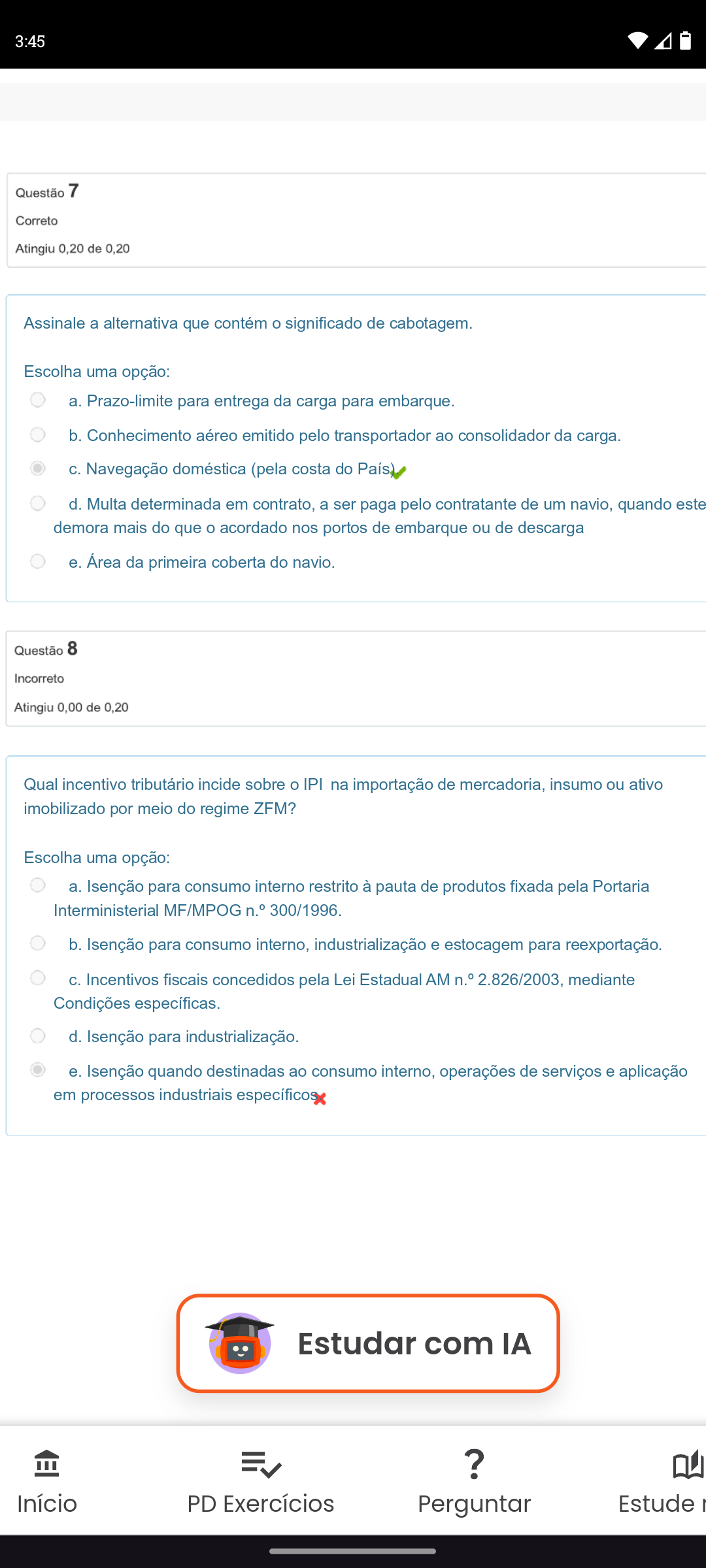 Questão 7 Correto Atingiu 0,20 de 0,20 Assinale a alternativa que contém o significado de cabotagem. Escolha uma opção: a. Prazo-limite para entrega da carga para embarque. b. Conhecimento aéreo emitido pelo transportador ao consolidador da carga. C. Navegação doméstica (pela costa do País) d. Multa determinada em contrato, a ser paga pelo contratante de um navio, quando este demora mais do que o acordado nos portos de embarque ou de descarga e. Área da primeira coberta do navio. Questão 8 Incorreto Atingiu 0,00 de 0,20 Qual incentivo tributário incide sobre o IPI na importação de mercadoria, insumo ou ativo imobilizado por meio do regime ZFM? Escolha uma opção: a. Isenção para consumo interno restrito à pauta de produtos fixada pela Portaria Interministerial MF/MPOG b. Isenção para consumo interno, industrialização e estocagem para reexportação. C. Incentivos fiscais concedidos pela Lei Estadual AM 2.826/2003, mediante Condições específicas. d. Isenção para industrialização. e. Isenção quando destinadas ao consumo interno, operações de serviços e aplicação em processos industriais específicos Estudar com IA ? Início PD Exercícios Perguntar Estude