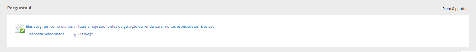 Pergunta 4 0 em 0 Eles surgiram como diários virtuais e hoje são fontes de geração de renda para muitos especialistas. Eles são: Resposta Selecionada: b. Os blogs.