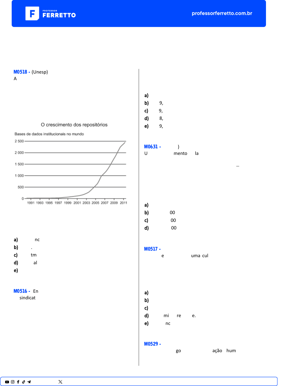<p>Exponencial</p><p>Função Exponencial</p><p>M0518 - (Unesp)</p><p>A revista Pesquisa Fapesp, na edição de novembro de</p><p>2012, publicou o ar�go in�tulado Conhecimento Livre,</p><p>que trata dos repositórios de ar�gos cien�ficos</p><p>disponibilizados gratuitamente aos interessados, por</p><p>meio eletrônico. Nesse ar�go, há um gráfico que mostra</p><p>o crescimento do número dos repositórios ins�tucionais</p><p>no mundo, entre os anos de 1991 e 2011.</p><p>Observando o gráfico, pode-se afirmar que, no período</p><p>analisado, o crescimento do número de repositórios</p><p>ins�tucionais no mundo foi, aproximadamente,</p><p>a) exponencial.</p><p>b) linear.</p><p>c) logarítmico.</p><p>d) senoidal.</p><p>e) nulo.</p><p>M0516 - (Enem)</p><p>O sindicato de trabalhadores de uma empresa sugere</p><p>que o piso salarial da classe seja de R$ 1.800,00,</p><p>propondo um aumento percentual fixo por cada ano</p><p>dedicado ao trabalho. A expressão que corresponde à</p><p>proposta salarial (s), em função do tempo de serviço (t),</p><p>em anos, é s(t) = 1.800 x (1,03)t.</p><p>De acordo com a proposta do sindicato, o salário de um</p><p>profissional dessa empresa com 2 anos de tempo de</p><p>serviço será, em reais,</p><p>a) 7.416,00</p><p>b) 3.819,24</p><p>c) 3.709,62</p><p>d) 3.708,00</p><p>e) 1.909,62</p><p>M0631 - (Pucmg)</p><p>Um equipamento laboratorial, comprado por</p><p>R$60.000,00, tem seu valor reduzido à metade a cada 15</p><p>meses. Assim, a equação V(t) = 60.000 · 2 – 𝑡</p><p>15 , onde t é o</p><p>tempo de uso em meses e V(t) é o valor em reais,</p><p>representa a variação do valor desse equipamento. Com</p><p>base nessas informações, é CORRETO afirmar que o valor</p><p>do equipamento após 45 meses de uso será igual a:</p><p>a) R$ 3.750,00</p><p>b) R$ 7.500,00</p><p>c) R$10.000,00</p><p>d) R$20.000,00</p><p>M0517 - (Enem)</p><p>Em um experimento, uma cultura de bactérias tem sua</p><p>população reduzida pela metade a cada hora, devido à</p><p>ação de um agente bactericida.</p><p>Neste experimento, o número de bactérias em função do</p><p>tempo pode ser modelado por uma função do �po</p><p>a) afim.</p><p>b) seno.</p><p>c) cosseno.</p><p>d) logarítmica crescente.</p><p>e) exponencial.</p><p>M0529 - (Acafe)</p><p>Um dos perigos da alimentação humana são os</p><p>microrganismos, que podem causar diversas doenças e</p><p>1@professorferretto @prof_ferretto</p><p>até levar a óbito. Entre eles, podemos destacar a</p><p>Salmonella. A�tudes simples como lavar as mãos,</p><p>armazenar os alimentos em locais apropriados, ajudam a</p><p>prevenir a contaminação pelos mesmos. Sabendo que</p><p>certo microrganismo se prolifera rapidamente, dobrando</p><p>sua população a cada 20 minutos, pode-se concluir que o</p><p>tempo que a população de 100 microrganismos passará a</p><p>ser composta de 3.200 indivíduos é:</p><p>a) 1 h e 35 min.</p><p>b) 1 h e 40 min.</p><p>c) 1 h e 50 min.</p><p>d) 1 h e 55 min.</p><p>M0524 - (Uepa)</p><p>Os dados esta�s�cos sobre violência no trânsito nos</p><p>mostram que é a segunda maior causa de mortes no</p><p>Brasil, sendo que 98% dos acidentes de trânsito são</p><p>causados por erro ou negligência humana e a principal</p><p>falha come�da pelos brasileiros nas ruas e estradas é</p><p>usar o celular ao volante. Considere que em 2012 foram</p><p>registrados 60.000 mortes decorrentes de acidentes de</p><p>trânsito e destes, 40% das ví�mas estavam em motos.</p><p>Texto Adaptado: Revista Veja, 19/08/2013.</p><p>A função N(t) = N0 · (1,2)t fornece o número de ví�mas</p><p>que estavam de moto a par�r de 2012, sendo t o número</p><p>de anos e N0 o número de ví�mas que estavam em moto</p><p>em 2012. Nessas condições, o número previsto de</p><p>ví�mas em moto para 2015 será de:</p><p>a) 41.472.</p><p>b) 51.840.</p><p>c) 62.208.</p><p>d) 82.944.</p><p>e) 103.680.</p><p>M1882 - (Enem PPL)</p><p>Ao abrir um negócio, um microempresário descreveu</p><p>suas vendas, em milhares de reais (unidade monetária</p><p>brasileira), durante os dois primeiros anos. No primeiro</p><p>ano, suas vendas cresceram de modo linear.</p><p>Posteriormente, ele decidiu inves�r em propaganda, o</p><p>que fez suas vendas crescerem de modo exponencial.</p><p>Qual é o gráfico que melhor descreve as vendas em</p><p>função do tempo?</p><p>a)</p><p>b)</p><p>c)</p><p>2@professorferretto @prof_ferretto</p><p>d)</p><p>e)</p><p>M0526 - (Pucrs)</p><p>A desintegração de uma substância radioa�va é um</p><p>fenômeno químico modelado pela fórmula q = 10 · 2kt,</p><p>onde q representa a quan�dade de substância radioa�va</p><p>(em gramas) existente no instante t (em horas). Quando</p><p>o tempo t é igual a 3,3 horas, a quan�dade existente q</p><p>vale 5. Então, o valor da constante k é</p><p>a) -35/5</p><p>b) -33/10</p><p>c) -5/33</p><p>d) -10/33</p><p>e) -100/33</p><p>M0625 - (Fer)</p><p>O número de bactérias de uma determinada cultura</p><p>evolui, sob certas condições, conforme a função B(t) = 10</p><p>· 3𝑡 – 1 , em que B(t) expressa a quan�dade de bactérias e</p><p>t representa o tempo em horas. Para a�ngir uma cultura</p><p>de 810 bactérias, após o início do experimento, o tempo</p><p>decorrido, em horas, corresponde a:</p><p>a) 1</p><p>b) 2</p><p>c) 3</p><p>d) 4</p><p>e) 5</p><p>M0521 - (Ufpr)</p><p>Uma pizza a 185°C foi re�rada de um forno quente.</p><p>Entretanto, somente quando a temperatura a�ngir 65°C</p><p>será possível segurar um de seus pedaços com as mãos</p><p>nuas, sem se queimar. Suponha que a temperatura T da</p><p>pizza, em graus Celsius, possa ser descrita em função do</p><p>tempo t, em minutos, pela expressão</p><p>𝑇 = 160 · 2-0, 8𝑡 + 25. Qual o tempo necessário para que</p><p>se possa segurar um pedaço dessa pizza com as mãos</p><p>nuas, sem se queimar?</p><p>a) 0,25 minutos.</p><p>b) 0,68 minutos.</p><p>c) 2,5