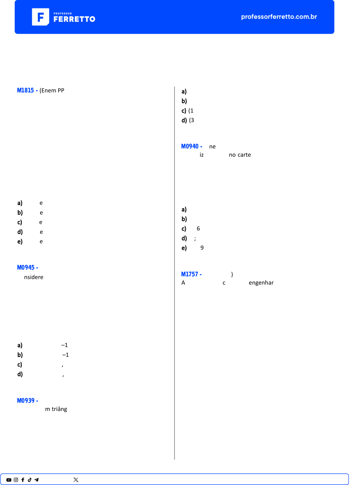 <p>Geometria Analítica</p><p>Fundamentos da Geometria Analítica</p><p>M1815 - (Enem PPL)</p><p>Observou-se que todas as formigas de um formigueiro</p><p>trabalham de maneira ordeira e organizada. Foi feito um</p><p>experimento com duas formigas e os resultados ob�dos</p><p>foram esboçados em um plano cartesiano no qual os</p><p>eixos estão graduados em quilômetros. As duas formigas</p><p>par�ram juntas do ponto O, origem do plano cartesiana</p><p>xOy. Uma delas caminhou horizontalmente para o lado</p><p>direito, a uma velocidade de 4 km/h. A outra caminhou</p><p>ver�calmente para cima, à velocidade de 3 km/h.</p><p>Após 2 horas de movimento, quais as coordenadas</p><p>cartesianas das posições de cada formiga?</p><p>a) (8; 0) e (0; 6).</p><p>b) (4; 0) e (0; 6).</p><p>c) (4; 0) e (0; 3).</p><p>d) (0; 8) e (6; 0).</p><p>e) (0; 4) e (3; 0).</p><p>M0945 - (Eear)</p><p>Considere os segmentos de retas 𝐴𝐵 e ¯𝐶𝐷, onde A(0, 10),</p><p>B(2, 12), C(–2, 3) e D(4, 3). O segmento 𝑀𝑁 determinado</p><p>pelos pontos médios dos segmentos ¯𝐴𝐵 e ¯𝐶𝐷 é dado</p><p>pelos pontos M e N, pertencentes respec�vamente a ¯𝐴𝐵</p><p>e a ¯𝐶𝐷.</p><p>Assinale a alterna�va que corresponde corretamente a</p><p>esses pontos.</p><p>a) M(1/2, 1) e N(–1, 3)</p><p>b) M(–2, 10) e N(–1, 3)</p><p>c) M(1, –2) e N(1, 3)</p><p>d) M(1, 11) e N(1, 3)</p><p>M0939 - (Eear)</p><p>Seja ABC um triângulo tal que A(1 ,1), B(3, –1) e C(5, 3). O</p><p>ponto _____ é o baricentro desse triângulo.</p><p>a) (2, 1).</p><p>b) (3, 3).</p><p>c) (1, 3).</p><p>d) (3, 1).</p><p>M0940 - (Enem)</p><p>Foi u�lizado o plano cartesiano para a representação de</p><p>um pavimento de lojas. A loja A está localizada no ponto</p><p>A(1; 2). No ponto médio entre a loja A e a loja B está o</p><p>sanitário S, localizado no ponto S(5; 10).</p><p>Determine as coordenadas do ponto de localização da</p><p>loja B.</p><p>a) (–3; –6)</p><p>b) (–6; –3)</p><p>c) (3; 6)</p><p>d) (9; 18)</p><p>e) (18; 9)</p><p>M1757 - (Enem PPL)</p><p>Alunos de um curso de engenharia desenvolveram um</p><p>robô “an�bio” que executa saltos somente nas direções</p><p>norte, sul, leste e oeste. Um dos alunos representou a</p><p>posição inicial desse robô, no plano cartesiano, pela letra</p><p>P, na ilustração.</p><p>1@professorferretto @prof_ferretto</p><p>A direção norte-sul é a mesma do eixo y, sendo que o</p><p>sen�do norte é o sen�do de crescimento de y, e a direção</p><p>leste-oeste é a mesma do eixo x, sendo que o sen�do</p><p>leste é o sen�do de crescimento de x.</p><p>Em seguida, esse aluno deu os seguintes comandos de</p><p>movimentação para o robô: 4 norte, 2 leste e 3 sul, nos</p><p>quais os coeficientes numéricos representam o número</p><p>de saltos do robô nas direções correspondentes, e cada</p><p>salto corresponde a uma unidade do plano cartesiano.</p><p>Depois de realizar os comandos dados pelo aluno, a</p><p>posição do robô, no plano cartesiano, será</p><p>a) (0;2).</p><p>b) (0;3).</p><p>c) (1;2).</p><p>d) (1;4).</p><p>e) (2;1).</p><p>M0942 - (Pucrj)</p><p>Assinale o valor da área do quadrado de vér�ces (–2, 9),</p><p>(4, 6), (1, 0) e (–5, 3).</p><p>a) 20</p><p>b) 25</p><p>c) √45</p><p>d) 45</p><p>e) √60</p><p>M1690 - (Professor Ferre�o)</p><p>Um agrimensor, ao fazer umas medidas em uma área de</p><p>terra, representou no plano cartesiano os dados ob�dos.</p><p>Ele colocou estacas nos pontos A, B e C e percebeu que</p><p>formavam um triângulo conforme a figura.</p><p>Sabendo que as coordenadas dos pontos que</p><p>representam a localização das estacas são A(2; 3), B(18;</p><p>15) e C(18; 3), pode-se concluir que a tangente do ângulo</p><p>agudo do triângulo localizado na estaca A é</p><p>a) 3/5.</p><p>b) 3/4.</p><p>c) 4/5.</p><p>d) 5/4.</p><p>e) 4/3.</p><p>M0947 - (Pucmg)</p><p>Quando representados no sistema de coordenadas xOy, o</p><p>ponto B é o simétrico do ponto A (-3, 2) em relação à</p><p>origem O; por sua vez, o ponto C é o simétrico de B em</p><p>relação ao eixo x. Com base nessas informações, é</p><p>CORRETO afirmar que a medida da área do triângulo ABC</p><p>é igual a:</p><p>a) 8</p><p>b) 9</p><p>c) 10</p><p>d) 12</p><p>M1262 - (Enem)</p><p>Um aplica�vo de relacionamentos funciona da seguinte</p><p>forma: o usuário cria um perfil com foto e informações</p><p>pessoais, indica as caracterís�cas dos usuários com quem</p><p>deseja estabelecer contato e determina um raio de</p><p>abrangência a par�r da sua localização. O aplica�vo</p><p>iden�fica as pessoas que se encaixam no perfil desejado</p><p>e que estão a uma distância do usuário menor ou igual ao</p><p>raio de abrangência. Caso dois usuários tenham perfis</p><p>compa�veis e estejam numa região de abrangência</p><p>comum a ambos, o aplica�vo promove o contato entre os</p><p>usuários, o que é chamado de match.</p><p>O usuário P define um raio de abrangência com medida</p><p>de 3 km e busca ampliar a possibilidade de obter um</p><p>match se deslocando para a região central da cidade, que</p><p>2@professorferretto @prof_ferretto</p><p>concentra um maior número de usuários. O gráfico ilustra</p><p>alguns bares que o usuário P costuma frequentar para</p><p>a�var o aplica�vo, indicados por I, II, III, IV e V. Sabe-se</p><p>que os usuários Q, R e S, cujas posições estão descritas</p><p>pelo gráfico, são compa�veis com o usuário P, e que estes</p><p>definiram raios de abrangência respec�vamente iguais a</p><p>3 km, 2km e 5 km.</p><p>Com base no gráfico e nas afirmações anteriores, em qual</p><p>bar o usuário P teria a possibilidade de um match com os</p><p>usuários Q, R e S, simultaneamente?</p><p>a) I</p><p>b) II</p><p>c) III</p><p>d) IV</p><p>e) V</p><p>M0944 - (Enem)</p><p>Em uma cidade será construída uma galeria subterrânea</p><p>que receberá uma rede de canos para o transporte de</p><
