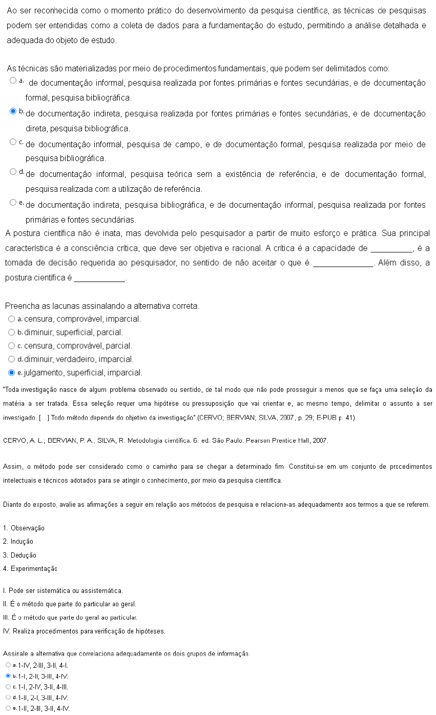 <p>Ao ser reconhecida como momento prático do desenvolvimento da pesquisa as técnicas de pesquisas podem ser entendidas como a coleta de dados para a fundamentação do estudo, permitindo a análise detalhada e adequada do objeto de estudo. As técnicas são materializadas por meio de procedimentos fundamentais, que podem ser delimitados como: a. de documentação informal, pesquisa realizada por fontes primárias e fontes secundárias, e de documentação formal, pesquisa de documentação indireta, pesquisa realizada por fontes primárias e fontes secundárias, e de documentação direta, pesquisa de documentação informal, pesquisa de campo, e de documentação formal, pesquisa realizada por meio de pesquisa documentação informal, pesquisa teórica sem a existência de referência, e de documentação formal, pesquisa realizada com a utilização de referência. e. de documentação indireta, pesquisa e de documentação informal, pesquisa realizada por fontes primárias e fontes A postura científica não é inata, mas devolvida pelo pesquisador a partir de muito esforço e prática. Sua principal característica é a consciência crítica, que deve ser objetiva e racional. A crítica é a capacidade de a tomada de decisão requerida ao pesquisador, no sentido de não aceitar que é Além disso, a postura científica é Preencha as lacunas assinalando a alternativa correta. a. censura, comprovável, b. diminuir, superficial, parcial. c. censura, comprovável, parcial. d. diminuir, verdadeiro, e.julgamento, superficial, "Toda investigação nasce de algum problema observado ou sentido, de tal modo que não pode prosseguir a menos que se faça uma seleção da matéria a ser Essa seleção requer uma hipótese ou pressuposição que vai orientar e, ao mesmo tempo, delimitar 0 assunto a ser investigado. [...] Todo método depende do objetivo da investigação" SILVA, 2007, p. 29; E-PUB p. 41). CERVO, A. BERVIAN, A.; SILVA, R. Metodologia 6. ed. São Paulo: Pearson Prentice Hall, 2007. Assim, método pode ser considerado como 0 caminho para se chegar a determinado fim. Constitui-se em um conjunto de procedimentos intelectuais e técnicos adotados para se atingir 0 conhecimento, por meio da pesquisa Diante do exposto, avalie as afirmações a seguir em relação aos métodos de pesquisa e relacione-as adequadamente aos termos a que se referem. 1. Observação 2. Indução 3. Dedução 4. Experimentação I. Pode ser ou II. É 0 método que parte do particular ao geral. III. É 0 método que parte do geral ao particular. IV. Realiza procedimentos para verificação de Assinale a alternativa que correlaciona adequadamente os dois grupos de informação. a 2-III, 3-II, b. 2-II, 3-III, 4-IV. 2-IV, 3-II, 4-III. d. 1-II, 3-III, 4-IV. e 1-II, 2-III, 3-II, 4-IV.</p>