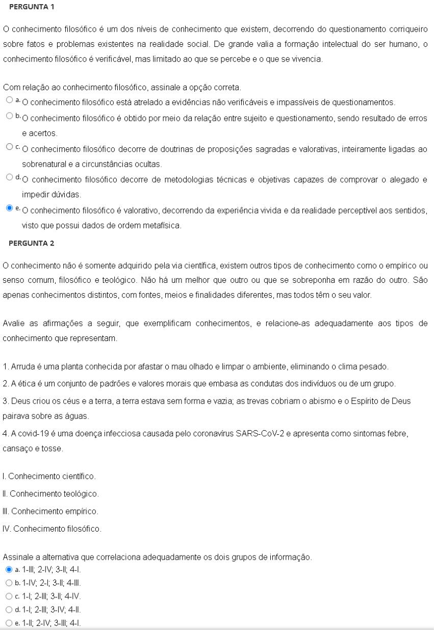 <p>PERGUNTA 1 conhecimento filosófico é um dos níveis de conhecimento que existem, decorrendo do questionamento corriqueiro sobre fatos e problemas existentes na realidade social. De grande valia a formação intelectual do ser humano, conhecimento filosófico é verificável, mas limitado ao que se percebe e que se vivencia. Com relação ao conhecimento filosófico, assinale a opção correta a. conhecimento filosófico está atrelado a evidências não verificáveis e impassíveis de questionamentos. conhecimento filosófico é obtido por meio da relação entre sujeito e questionamento, sendo resultado de erros e acertos. conhecimento filosófico decorre de doutrinas de proposições sagradas e valorativas, inteiramente ligadas ao sobrenatural e a circunstâncias ocultas conhecimento filosófico decorre de metodologias técnicas e objetivas capazes de comprovar alegado e impedir e. conhecimento filosófico é valorativo, decorrendo da experiência vivida e da realidade aos sentidos, visto que possui dados de ordem metafísica. PERGUNTA 2 conhecimento não é somente adquirido pela via existem outros tipos de conhecimento como empírico ou senso comum, filosófico e Não há um melhor que outro ou que se sobreponha em razão do outro. São apenas conhecimentos distintos, com fontes, meios e finalidades diferentes, mas todos têm seu valor. Avalie as afirmações a seguir, que exemplificam conhecimentos, e relacione-as adequadamente aos tipos de conhecimento que representam. 1. Arruda é uma planta conhecida por afastar mau olhado e limpar ambiente, eliminando clima pesado. 2. A ética é um conjunto de padrões e valores morais que embasa as condutas dos indivíduos ou de um grupo. 3. Deus criou os céus e a terra, a terra estava sem forma e vazia; as trevas cobriam abismo e Espírito de Deus pairava sobre as águas. 4. A covid-19 é uma doença infecciosa causada pelo coronavírus SARS-CoV-2 e apresenta como sintomas febre, cansaço e tosse. I. Conhecimento II. Conhecimento III. Conhecimento empírico. IV. Conhecimento Assinale a alternativa que correlaciona adequadamente os dois grupos de informação. a. 1-III; 3-II; 4-1. b. 1-IV; 4-III. 1-I; 2-III; d. 1-I; 2-III; 3-IV; 4-II. e. 1-II; 2-IV; 3-III;</p>