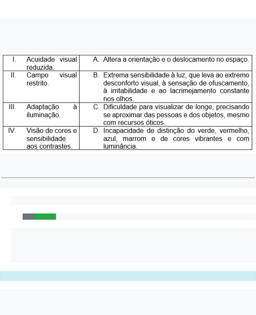 <p>Deficiência visual e AEE</p><p>1)</p><p>Sobre algumas das dificuldades apresentadas pelos alunos com deficiência visual, leis</p><p>as afirmativas a seguir e associe as duas colunas:</p><p>Assinale a alternativa que traz a associação correta entre as colunas.</p><p>Alternativas:</p><p>• I – C; II – A; III – B; IV – D.</p><p>checkCORRETO</p><p>• I – B; II – C; III – A; IV – D.</p><p>• I – D; II – A; III – C; IV – B.</p><p>• I – A; II – D; III – C; IV – B.</p><p>• I – C; II – B; III – A; IV – D.</p><p>Resolução comentada:</p><p>As dificuldades apresentadas pelos alunos com deficiência visual, de acordo com as</p><p>suas respectivas associações, são:</p><p>Código da questão: 66989</p><p>2)</p><p>A cegueira total (ou amaurose) significa a perda completa de visão. A visão é nula, ou</p><p>seja, não há a capacidade de percepção luminosa.</p><p>Assinale a alternativa que apresenta os recursos adequados para o atendimento</p><p>educacional especializado de pessoas cegas totais.</p><p>Alternativas:</p><p>• Telescópio, sistema Braille e softwares acessíveis.</p><p>• Sistema Braille, plano inclinado e luneta.</p><p>• Sistema Braille, Soroban e softwares acessíveis.</p><p>checkCORRETO</p><p>• Sistema Braille, LIBRAS e tipos ampliados.</p><p>• Sistema Braille, Soroban e lupa.</p><p>Resolução comentada:</p><p>Os recursos adequados para o AEE de pessoas cegas são o sistema Braille, Soroban e</p><p>os softwares acessíveis, como o DOSVOX, pois não implicam o uso de visão.</p><p>Plano inclinado, luneta, lupa, telescópio e tipos ampliados não são recursos adequados,</p><p>porque implicam o uso de visão. LIBRAS está incorreta, pois é adequada ao AEE de</p><p>deficiência auditiva.</p><p>Código da questão: 66999</p><p>3)</p><p>A falta da visão pode afetar apenas um dos olhos (no caso da visão monocular), então</p><p>o outro olho assumirá as funções visuais sem causar tantos transtornos no uso eficiente</p><p>da visão (BRASIL, 2007).</p><p>Fonte: BRASIL. Ministério da Educação. Secretaria de Educação Especial. Atendimento</p><p>Educacional Especializado. Deficiência Visual. Brasília: MEC, 2007. Disponível em:</p><p>http://portal.mec.gov.br/seesp/arquivos/pdf/aee_dv.pdf. Acesso em: 16 nov. 2021.</p><p>Sobre as consequências da falta de visão, analise as afirmativas a seguir:</p><p>I. A perda da visão pode levar à extirpação do globo ocular e ao uso de próteses em</p><p>um dos olhos ou em ambos.</p><p>II. O desenvolvimento das informações táteis, auditivas, sinestésicas e olfativas é maior</p><p>nas pessoas cegas.</p><p>III, A utilização das capacidades sensoriais possui potencialidades diferentes nos</p><p>indivíduos.</p><p>IV, A falta da visão leva a um desenvolvimento menor da audição, do olfato e do</p><p>paladar.</p><p>V. Os sentidos remanescentes da pessoa cega agem de forma complementar, e não de</p><p>forma compensatória.</p><p>Assinale a alternativa que apresenta corretamente quais afirmativas são corretas.</p><p>Alternativas:</p><p>• I e III, apenas.</p><p>• I, III e IV, apenas.</p><p>• I, II e V, apenas.</p><p>checkCORRETO</p><p>• II e III, apenas</p><p>• I, III, IV e V, apenas.</p><p>Resolução comentada:</p><p>As afirmativas I, II e V são corretas, pois uma das consequências da perda da visão é a</p><p>extirpação do globo ocular e o uso de próteses oculares em um dos olhos ou em</p><p>ambos; desenvolvimento das informações táteis, auditivas, sinestésicas e olfativas é</p><p>maior nas pessoas cegas, pois usam mais esses sentidos no cotidiano; os sentidos</p><p>remanescentes da pessoa cega agem de forma complementar, não de forma</p><p>compensatória e/ou isolada nem como um fenômeno extraordinário.</p><p>As afirmativas III e IV são incorretas, pois a utilização das capacidades sensoriais tem</p><p>potencialidades semelhantes nos indivíduos, e a falta da visão leva a um</p><p>desenvolvimento maior da audição, do olfato e do paladar.</p><p>Código da questão: 66990</p><p>4)</p><p>O Atendimento Educacional Especializado dos alunos com deficiência visual utiliza</p><p>recursos e materiais específicos no processo de aprendizagem.</p><p>Sobre esses materiais, assinale a alternativa correta.</p><p>Alternativas:</p><p>• Devem substituir as experiências em sala de aula.</p><p>• Devem ser baseados em situações cotidianas do aluno.</p><p>checkCORRETO</p><p>• Devem ser confeccionados por especialistas fora do contexto escolar.</p><p>• Devem ser confeccionados com materiais novos e não recicláveis.</p><p>• Devem ser diferentes do modelo original que está sendo reproduzido.</p><p>Resolução comentada:</p><p>Os materiais específicos para o AEE de deficiência visual devem ser baseados em</p><p>situações cotidianas do aluno. Devem complementar ou suplementar, mas não</p><p>substituir as experiências em sala de aula. Devem ser o mais próximo possível do</p><p>modelo original que está sendo reproduzido. Podem e devem ser confeccionados</p><p>pelos professores no contexto escolar. Podem e devem ser confeccionados com</p><p>materiais como sucatas.</p><p>Código da questão: 67001</p><p>5)</p><p>As pessoas com baixa visão apresentam _____________ de ver os ____________ do dia a dia,</p><p>como as feições. No caso da sala de aula, os alunos enxergam a ___________ , mas não</p><p>são capazes de identificar as ____________.</p><p>Assinale a alternativa que completa adequadamente as lacunas.</p><p>Alternativas:</p><p>• Facilidades; miniaturas; lousa; pessoas.</p><p>• Dificuldades; miniaturas; professora; letras.</p><p>• Potencialidades; detalhes; lousa; pessoas.</p><p>• Dificuldades; detalhes; professora; pessoas.</p><p>• Dificuldades; detalhes; lousa; letras.</p><p>checkCORRETO</p><p>Resolução comentada:</p><p>As pessoas com baixa visão apresentam dificuldades de ver os detalhes do dia a dia,</p><p>como as feiç