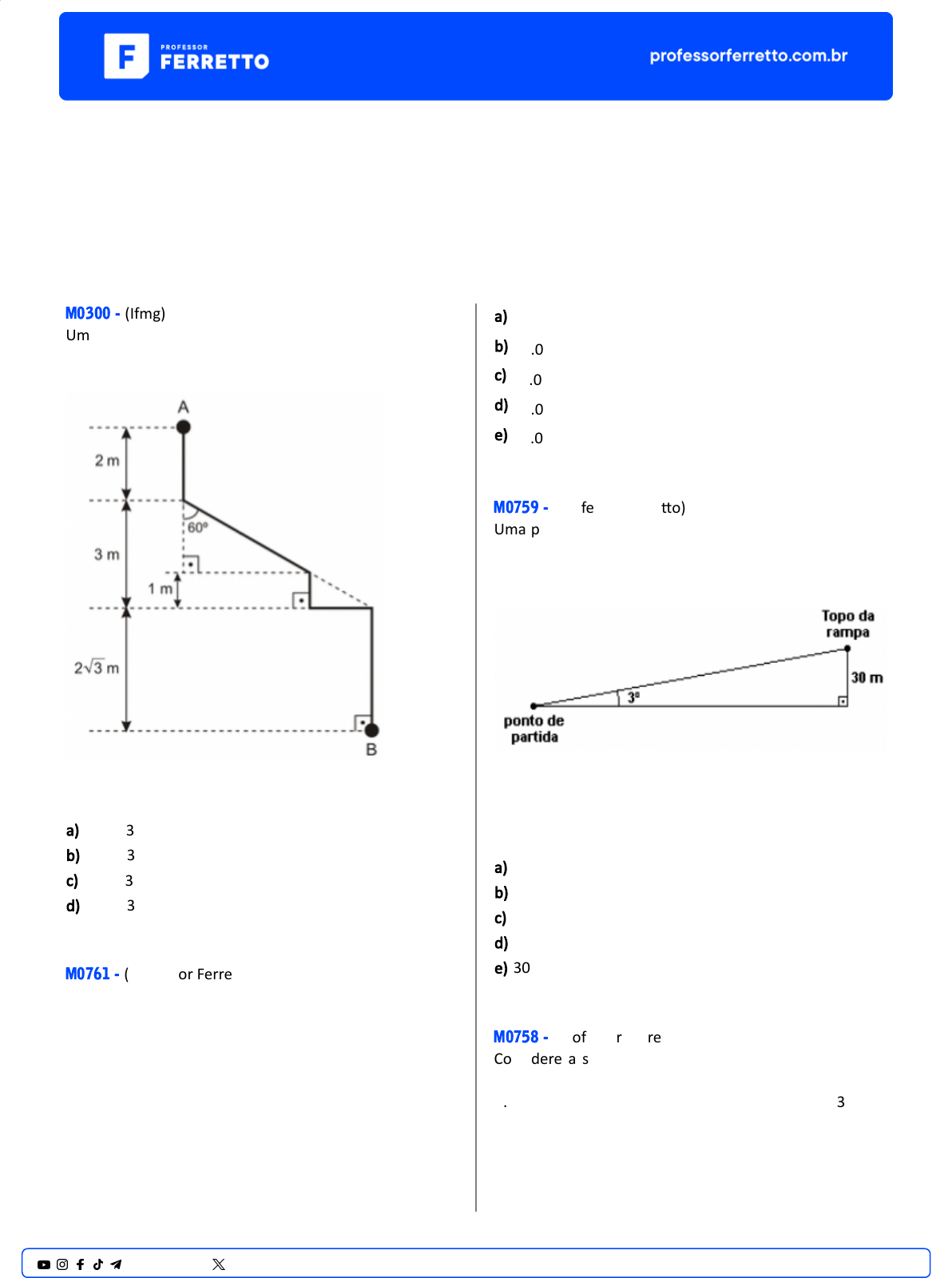 <p>Vestibulares</p><p>Geometria Plana</p><p>Triângulo Retângulo</p><p>M0300 - (Ifmg)</p><p>Uma formiga sai do ponto A e segue por uma trilha,</p><p>representada pela linha con�nua, até chegar ao ponto B,</p><p>como mostra a figura.</p><p>A distância, em metros, percorrida pela formiga é</p><p>a) 1 + 2√3</p><p>b) 3 + 3√3</p><p>c) 5 + 2√3</p><p>d) 7 + 3√3</p><p>M0761 - (Professor Ferre�o)</p><p>Um engenheiro florestal, desejando es�mar a área de</p><p>uma região de preservação, observou em um mapa, com</p><p>escala de 1 cm para cada 100 km, que o formato da</p><p>região era, aproximadamente, um triângulo retângulo de</p><p>catetos medindo 2 cm e 3 cm. Com base nesses dados,</p><p>conclui-se que a área da região de preservação ambiental</p><p>era, aproximadamente, de:</p><p>a) 20.000 km2</p><p>b) 30.000 km2</p><p>c) 35.000 km2</p><p>d) 40.000 km2</p><p>e) 60.000 km2</p><p>M0759 - (Professor Ferre�o)</p><p>Uma pessoa sobe uma rampa com inclinação de 3 graus,</p><p>com velocidade constante de 4 metros por segundo. A</p><p>altura do topo da rampa em relação ao ponto de par�da</p><p>é 30 m.</p><p>Use a aproximação sen 3° = 0,05 e responda. O tempo,</p><p>em minutos, que a pessoa levou para percorrer</p><p>completamente a rampa é</p><p>a) 2,5.</p><p>b) 7,5.</p><p>c) 10.</p><p>d) 15.</p><p>e) 30.</p><p>M0758 - (Professor Ferre�o)</p><p>Considere a seguinte movimentação de dois andarilhos:</p><p>ao meio dia, o andarilho A está 3 km a oeste do andarilho</p><p>B. O andarilho A está se movendo para o oeste a 3 km/h</p><p>e o andarilho B está se movendo para o norte com a</p><p>mesma velocidade.</p><p>Qual a distância, em km, entre os andarilhos às 14h?</p><p>1@professorferretto @prof_ferretto</p><p>a) √17</p><p>b) 17</p><p>c) √51</p><p>d) √117</p><p>e) 117</p><p>M1325 - (Fuvest)</p><p>Na figura, os segmentos AC e DE são paralelos entre si e</p><p>perpendiculares ao segmento CD; o ponto B pertence ao</p><p>segmento AC; F é o ponto médio do segmento AB; e ABE</p><p>é um triângulo equilátero. Além disso, o segmento BC</p><p>mede 10 unidades de comprimento e o segmento AE</p><p>mede 6 unidades de comprimento. A medida do</p><p>segmento DF, em unidades de comprimento, é igual a</p><p>a) 14.</p><p>b) 15.</p><p>c) 16.</p><p>d) 17.</p><p>e) 18.</p><p>M0757 - (Professor Ferre�o)</p><p>Duas fazendas, A e B, são ligadas por uma estrada reta</p><p>que mede 24 km. A cidade mais próxima fica a uma</p><p>distância de 13 km, em linha reta, de ambas as fazendas.</p><p>O acesso a essa cidade, a par�r da estrada que liga as</p><p>duas fazendas, é feito por uma rodovia, também reta,</p><p>que cruza essa estrada perpendicularmente.</p><p>Com base nessas informações, é correto afirmar que para</p><p>ir de uma dessas fazendas até à cidade, fazendo todo o</p><p>percurso pela estrada e pela rodovia de acesso, é</p><p>necessário percorrer no mínimo:</p><p>a) 17 km</p><p>b) 16 km</p><p>c) 15 km</p><p>d) 14 km</p><p>e) 13 km</p><p>M0755 - (Professor Ferre�o)</p><p>A figura abaixo representa parte de um campo de</p><p>futebol, em que estão representados um dos gols e a</p><p>marca do pênal� (ponto P).</p><p>Considere que a marca do pênal� equidista das duas</p><p>traves do gol, que são perpendiculares ao plano do</p><p>campo, além das medidas a seguir, que foram</p><p>aproximadas para facilitar as contas.</p><p>• Distância da marca do pênal� até a linha do gol: 11</p><p>metros.</p><p>• Largura do gol: 8 metros.</p><p>• Altura do gol: 2,5 metros.</p><p>Um jogador chuta a bola da marca do pênal� e ela,</p><p>seguindo uma trajetória reta, choca-se contra a junção da</p><p>trave esquerda com o travessão (ponto T). Nessa</p><p>situação, a bola terá percorrido, do momento do chute</p><p>até o choque, uma distância, em metros,</p><p>aproximadamente igual a</p><p>a) 12.</p><p>b) 14.</p><p>c) 16.</p><p>d) 18.</p><p>e) 20.</p><p>M0298 - (Ufu)</p><p>O comandante de um navio fez, pela primeira vez, uma</p><p>rota re�línea AC orientado por um farol F, localizado</p><p>numa ilha. Ele pretendia determinar as distâncias do farol</p><p>F à rota AC e do ponto inicial A ao farol F. No início da</p><p>viagem, o comandante obteve a medida 𝐹</p><p>^</p><p>𝐴𝐶 = 30˚ e,</p><p>após percorrer 6 milhas marí�mas, localizando-se em B,</p><p>ele fez a medição do ângulo 𝐹</p><p>^</p><p>𝐵𝐶, obtendo 60°. Observe</p><p>a figura a seguir que ilustra esta situação.</p><p>2@professorferretto @prof_ferretto</p><p>De acordo com as informações, as distâncias, em milhas,</p><p>do farol F à rota AC e do ponto inicial A ao farol F ob�das</p><p>pelo comandante foram, respec�vamente,</p><p>a) 2√3 e 3(√3)/2</p><p>b) 2√3 e 4√3</p><p>c) 3√3 e 6√3</p><p>d) 3√3 e √3</p><p>M0287 - (Ufrn)</p><p>A escadaria a seguir tem oito batentes no primeiro lance</p><p>e seis, no segundo lance de escada.</p><p>Sabendo que cada batente tem 20 cm de altura e 30 cm</p><p>de comprimento (profundidade), a tangente do ângulo</p><p>CÂD mede:</p><p>a) 9/10</p><p>b) 14/15</p><p>c) 29/30</p><p>d) 1</p><p>M0296 - (Uemg)</p><p>Observe a figura:</p><p>Tendo como vista lateral da escada com 6 degraus, um</p><p>triângulo retângulo isósceles de hipotenusa √10 metros,</p><p>Magali observa que todos os degraus da escada têm a</p><p>mesma altura.</p><p>A medida em cm, de cada degrau, corresponde</p><p>aproximadamente a:</p><p>a) 37</p><p>b) 60</p><p>c) 75</p><p>d) 83</p><p>M0299 - (Ifsc)</p><p>Em uma aula prá�ca, um professor do curso técnico de</p><p>edificações do campus Florianópolis do IFSC, pede para</p><p>que seus alunos determinem a altura de um poste que</p><p>fica nas instalações da ins�tuição, porém há uma</p><p>impossibilidade para se chegar tanto ao topo do poste,</p><p>bem como sua base. Para realizar tal medida, são</p><p>disponibilizados para os alunos uma trena (fita métrica) e</p><p>um teodolito. 