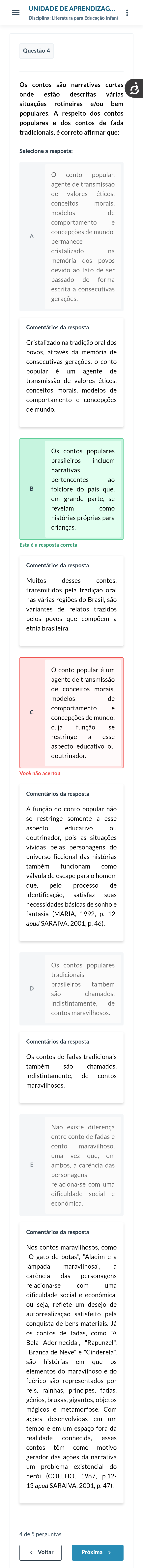 UNIDADE DE Disciplina Literatura para Educação Infant Questão Os contos são narrativas curtas onde estão descritas várias situações rotineiras e/ou bem populares respeito dos contos populares dos contos de fada tradicionais correto afirmar que: Selecione resposta: conto popular agente de transmissão de valores conceitos morais, modelos de comportamento e A concepçõe de permanece cristalizado na memoria dos povos devido fato ser passado de forma escrita consecutivas Comentários resposta Cristalizado tradição oral dos povos, através da de consecutivas gerações conto popular um agente de transmissão de valores éticos, conceitos morais, modelos de comportamento concepções de mundo. Os contos populares brasileiros incluem narrativas pertencentes ao B folclore do país que, em grande se revelam como histórias próprias para Esta resposta correta Comentários resposta Muitos desses contos transmitidos pela tradição nas regiões do Brasil são variantes de relatos trazidos pelos povos que compõem a etnia brasileira o conto popular um agente de transmissão de conceitos modelos de comportamento concepções mundo, cuja função se restringe esse aspecto educativo ou doutr inador acertou Comentários resposta A função do conto popular não se restringe somente esse aspecto educativo ou doutrinador, pois as situações vividas pelas personagens do universo ficcional das histórias também funcionam como para homem que, pelo processo de satisfaz suas necessidades básicas sonho fantasia p. 12. apud 2001, 46). Os contos populares tradicionais brasileiros D são indistintamente, de contos Comentários resposta Os contos de fadas tradicionais também são chamados de contos maravilhosos Não existe diferença entre conto de fadas e conto uma vez que, em E ambos carência das personagens com uma dificuldade social econômica Comentários resposta Nos contos como 'O gato de botas". "Aladim lâmpada a carência das personagens relaciona se com uma dificuldade social ou seja, reflete um desejo de autorrealização satisfeito pela conquista de bens materiais Já os contos de como "A Bela Adormecida" "Rapunzel" "Branca Neve "Cinderela", são histórias em que os elementos do do feérico são representados por reis, rainhas, fadas, gênios objetos mágicos Com ações desenvolvidas em um tempo em um espaço fora da realidade conhecida, esses contos como motivo gerador das ações da narrativa um problema existencial do herói 13 perguntas