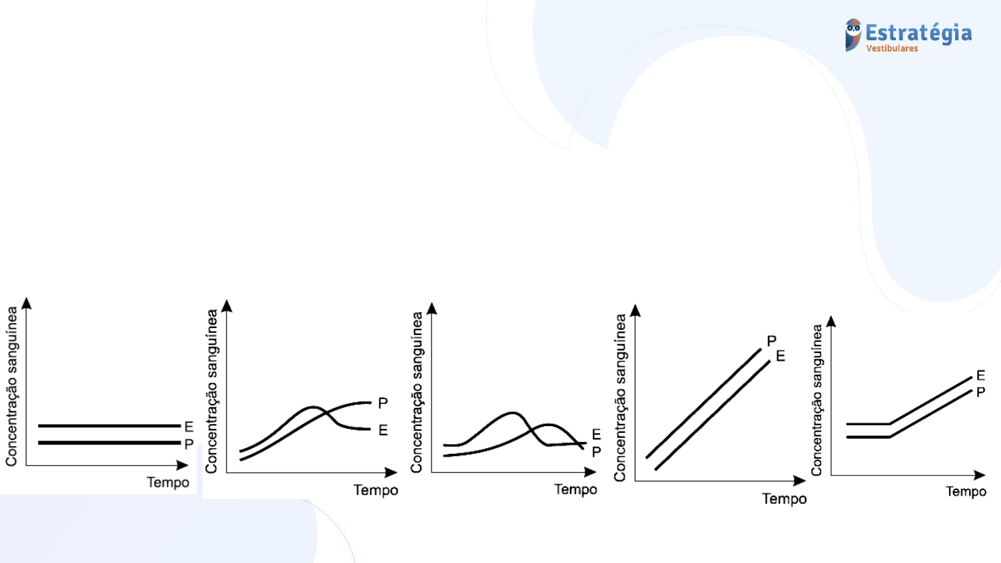<p>Prof. Bruna Klassa @profbrunaklassa</p><p>(ENEM/2013)</p><p>A pílula anticoncepcional é um dos métodos contraceptivos de maior segurança, sendo constituída</p><p>basicamente de dois hormônios sintéticos semelhantes aos hormônios produzidos pelo organismo feminino, o</p><p>estrogênio (E) e a progesterona (P). Em um experimento médico, foi analisado o sangue de uma mulher que</p><p>ingeriu ininterruptamente um comprimido desse medicamento por dia durante seis meses.</p><p>Qual gráfico representa a concentração sanguínea desses hormônios durante o período do experimento?</p><p>Slide 24</p>