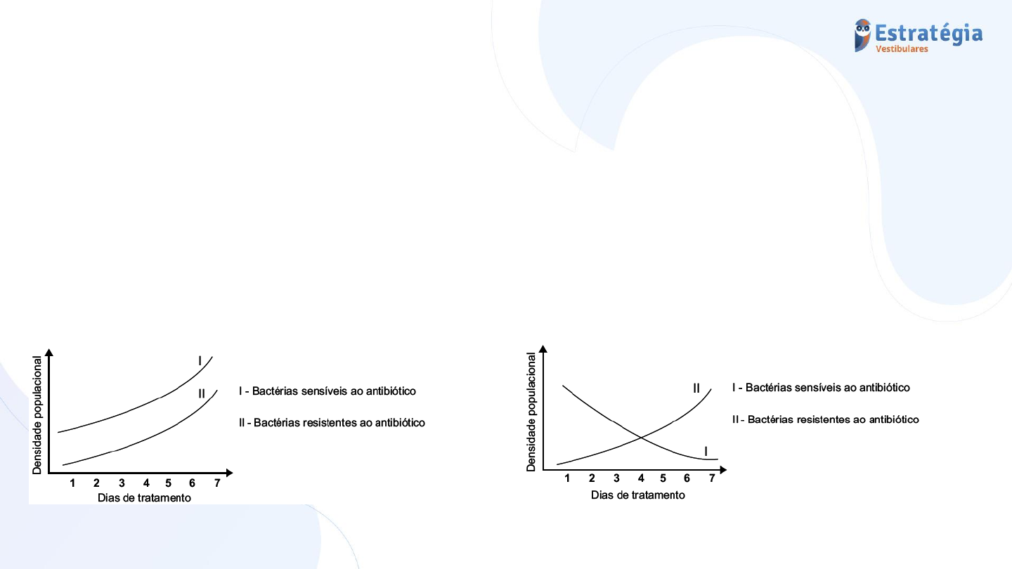 <p>Prof. Bruna Klassa @profbrunaklassa</p><p>(ENEM/2015)</p><p>As superbactérias respondem por um número crescente de infecções e mortes em todo o mundo. O termo</p><p>superbactérias é atribuído às bactérias que apresentam resistência a praticamente todos os antibióticos. Dessa</p><p>forma, no organismo de um paciente, a população de uma espécie bacteriana patogênica pode ser constituída</p><p>principalmente por bactérias sensíveis a antibióticos usuais e por um número reduzido de superbactérias que,</p><p>por mutação ou intercâmbio de material genético, tornaram-se resistentes aos antibióticos existentes.</p><p>Qual figura representa o comportamento populacional das bactérias ao longo de uma semana de tratamento</p><p>com um antibiótico comum?</p><p>Slide 19</p>