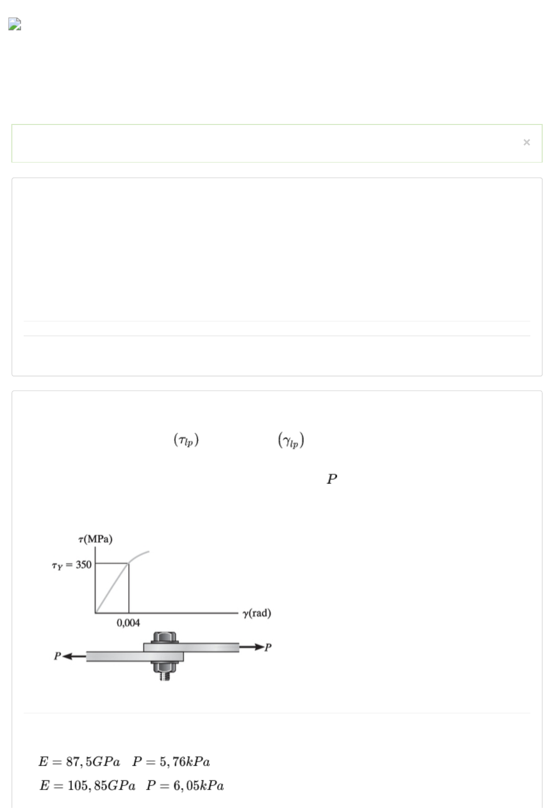 <p> Resistência dos Materiais (/aluno/timeline/in…</p><p>Av2 - Resistência dos Materiais</p><p>Sua avaliação foi confirmada com sucesso</p><p>Colaborar </p><p>(/notific</p><p>×</p><p>Informações Adicionais</p><p>Período: 23/09/2024 00:00 à 04/11/2024 23:59</p><p>Situação: Cadastrado</p><p>Tentativas: 1 / 3</p><p>Pontuação: 1500</p><p>Protocolo: 1055749708</p><p>Avaliar Material</p><p>1)</p><p>a)</p><p>b)</p><p>De modo análogo ao ensaio de tração, o diagrama tesão-deformação de cisalhamento também</p><p>apresentará um trecho inicial reto com comportamento linear elástico até um limite de proporcionalidade</p><p>entre a tensão de cisalhamento e a deformação .</p><p>A partir do diagrama tensão-deformação de cisalhamento do material do elemento de ligação apresentado</p><p>na figura, determine o módulo de elasticidade e o carregamento necessário para provocar o escoamento</p><p>do material. Sabendo que o parafuso tem diâmetro de 5 mm e coeficiente de Poisson é igual a 0,35.</p><p>Figura – Diagrama tensão-deformação de cisalhamento.</p><p>Fonte: Hibbeler (2010, p.79)</p><p>Alternativas:</p><p>e .</p><p>e .</p><p>19/10/24, 16:55 Colaborar - Av2 - Resistência dos Materiais</p><p>https://www.colaboraread.com.br/aluno/avaliacao/index/3518350604?atividadeDisciplinaId=17146950 1/4</p><p>https://www.colaboraread.com.br/aluno/timeline/index/3518350604?ofertaDisciplinaId=2239986</p><p>https://www.colaboraread.com.br/aluno/timeline/index/3518350604?ofertaDisciplinaId=2239986</p><p>https://www.colaboraread.com.br/notificacao/index</p><p>https://www.colaboraread.com.br/notificacao/index</p><p>https://www.colaboraread.com.br/notificacao/index</p><p>javascript:void(0);</p><p>c)</p><p>d)</p><p>e)</p><p>2)</p><p>a)</p><p>b)</p><p>c)</p><p>d)</p><p>e)</p><p>3)</p><p>e . Alternativa assinalada</p><p>e .</p><p>e .</p><p>O estado geral de tensão em um ponto é determinado por seis componentes: três componentes de</p><p>tensão normal e outras três componentes de tensão de cisalhamento. Este estado tridimensional de tensão,</p><p>na prática profissional, para facilitar a interpretação dos problemas reais, é simplificado a um estado plano</p><p>de tensão.</p><p>Determine as tensões normal e de cisalhamento que atuam na face obliqua da região sombreada</p><p>apresentada na figura a seguir. Desenvolva as equações aplicando o equilíbrio de forças atuantes no</p><p>elemento sombreado.</p><p>Figura – Estado plano de tensão</p><p>Fonte: Beer et al. (2015, p. 462)</p><p>Alternativas:</p><p>e .</p><p>e .</p><p>e . Alternativa assinalada</p><p>e .</p><p>e .</p><p>Na prática profissional, é comum a busca pela direção onde ocorrerão as máximas tensões no plano.</p><p>Com isso, para se determinar a tensão normal máxima e mínima, devemos derivar a equação das</p><p>componentes de tensão em relação ao ângulo do plano inclinado e igualar a zero. Assim, temos a equação</p><p>das tensões principais.</p><p>Determine as tensões principais para o estado de tensão apresentado na Figura.</p><p>Figura – Estado plano de tensão</p><p>19/10/24, 16:55 Colaborar - Av2 - Resistência dos Materiais</p><p>https://www.colaboraread.com.br/aluno/avaliacao/index/3518350604?atividadeDisciplinaId=17146950 2/4</p><p>a)</p><p>b)</p><p>c)</p><p>d)</p><p>e)</p><p>4)</p><p>a)</p><p>b)</p><p>c)</p><p>d)</p><p>e)</p><p>5)</p><p>Fonte: Beer el al. (2015, p.462)</p><p>Alternativas:</p><p>e</p><p>e</p><p>e</p><p>e Alternativa assinalada</p><p>e</p><p>“Às vezes, o projeto de um eixo depende de restrições à quantidade de rotação ou torção que pode</p><p>ocorrer quando o eixo é submetido a um torque. Além do mais, saber calcular o ângulo de torção para um</p><p>eixo pode acarretar variação no torque interno ao longo da linha central do eixo” (Hibbeler, 2010, p.139-140)</p><p>Para um navio com hélices acopladas a um eixo vazado com diâmetros externo de e interno de</p><p>e comprimento de , determine o ângulo de torção do eixo, sabendo que o material possui</p><p>uma e .</p><p>Alternativas:</p><p>.</p><p>.</p><p>. Alternativa assinalada</p><p>.</p><p>.</p><p>Os eixos de transmissão utilizados nos projetos normalmente possuem seção transversal circular e são</p><p>submetidos a esforços de torção. Por esse motivo, a seção transversal permanece plana, porém as linhas</p><p>radiais giram. Este fato proporciona uma deformação por cisalhamento no eixo de transmissão.</p><p>Para um eixo de transmissão de seção circular vazada com de comprimento e de diâmetro</p><p>externo, determine o diâmetro interno do eixo de transmissão, sabendo que o motor transmite uma</p><p>potência de ao eixo com velocidade angular de . Sabe-se que e</p><p>19/10/24, 16:55 Colaborar - Av2 - Resistência dos Materiais</p><p>https://www.colaboraread.com.br/aluno/avaliacao/index/3518350604?atividadeDisciplinaId=17146950 3/4</p><p>a)</p><p>b)</p><p>c)</p><p>d)</p><p>e)</p><p>.</p><p>Alternativas:</p><p>.</p><p>.</p><p>.</p><p>.</p><p>. Alternativa assinalada</p><p>19/10/24, 16:55 Colaborar - Av2 - Resistência dos Materiais</p><p>https://www.colaboraread.com.br/aluno/avaliacao/index/3518350604?atividadeDisciplinaId=17146950 4/4</p>