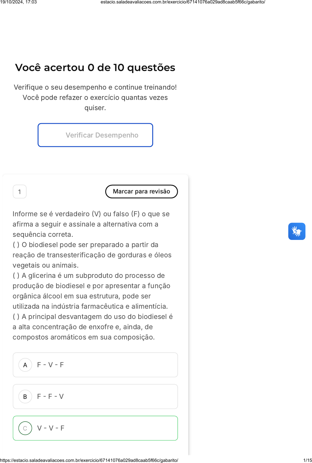 <p>Você acertou 0 de 10 questões</p><p>Verifique o seu desempenho e continue treinando!</p><p>Você pode refazer o exercício quantas vezes</p><p>quiser.</p><p>Verificar Desempenho</p><p>A</p><p>B</p><p>C</p><p>1 Marcar para revisão</p><p>Informe se é verdadeiro �V) ou falso �F) o que se</p><p>afirma a seguir e assinale a alternativa com a</p><p>sequência correta.</p><p>( ) O biodiesel pode ser preparado a partir da</p><p>reação de transesterificação de gorduras e óleos</p><p>vegetais ou animais.</p><p>( ) A glicerina é um subproduto do processo de</p><p>produção de biodiesel e por apresentar a função</p><p>orgânica álcool em sua estrutura, pode ser</p><p>utilizada na indústria farmacêutica e alimentícia.</p><p>( ) A principal desvantagem do uso do biodiesel é</p><p>a alta concentração de enxofre e, ainda, de</p><p>compostos aromáticos em sua composição.</p><p>F � V � F</p><p>F � F � V</p><p>V � V � F</p><p>19/10/2024, 17:03 estacio.saladeavaliacoes.com.br/exercicio/67141076a029ad8caab5f66c/gabarito/</p><p>https://estacio.saladeavaliacoes.com.br/exercicio/67141076a029ad8caab5f66c/gabarito/ 1/15</p><p>D</p><p>E</p><p>V � F � V</p><p>V � V � V</p><p>Questão não respondida</p><p>Opa! A alternativa correta é a letra C.</p><p>Confira o gabarito comentado!</p><p>Gabarito Comentado</p><p>A alternativa correta é a letra C �V � V � F�. A</p><p>primeira afirmação é verdadeira, pois o</p><p>biodiesel é de fato preparado a partir da</p><p>reação de transesterificação de gorduras e</p><p>óleos vegetais ou animais. A segunda</p><p>afirmação também é verdadeira, pois a</p><p>glicerina é um subproduto do processo de</p><p>produção de biodiesel e, por apresentar a</p><p>função orgânica álcool em sua estrutura,</p><p>pode ser utilizada na indústria farmacêutica e</p><p>alimentícia. Já a terceira afirmação é falsa,</p><p>pois uma das vantagens do biodiesel é</p><p>justamente a ausência de contaminação com</p><p>enxofre, chumbo e compostos aromáticos,</p><p>diferentemente dos combustíveis fósseis.</p><p>2 Marcar para revisão</p><p>Ano: 2014 Banca: CESGRANRIO Órgão: EPE Prova:</p><p>CESGRANRIO � 2014 � EPE � Analista de Pesquisa</p><p>Energética - Gás e Bioenergia</p><p>Após testes em 2004, o biodiesel foi inserido na</p><p>matriz nacional por volta de 2005 a 2007. É uma</p><p>característica do biodiesel:</p><p>19/10/2024, 17:03 estacio.saladeavaliacoes.com.br/exercicio/67141076a029ad8caab5f66c/gabarito/</p><p>https://estacio.saladeavaliacoes.com.br/exercicio/67141076a029ad8caab5f66c/gabarito/ 2/15</p><p>A</p><p>B</p><p>C</p><p>D</p><p>E</p><p>Baixo número de cetano</p><p>Ausência de enxofre e aromáticos</p><p>Baixa viscosidade, quando comparado ao</p><p>diesel convencional</p><p>Teor de oxigênio próximo a 50%</p><p>Maior custo associado ao transporte</p><p>Questão não respondida</p><p>Opa! A alternativa correta é a letra B.</p><p>Confira o gabarito comentado!</p><p>Gabarito Comentado</p><p>O biodiesel, que é produzido a partir de óleos</p><p>vegetais e gorduras, possui como uma de</p><p>suas características a ausência de enxofre e</p><p>compostos aromáticos. Esses elementos,</p><p>presentes em combustíveis fósseis, são</p><p>responsáveis por emissões poluentes quando</p><p>queimados. Portanto, a alternativa correta é a</p><p>B, que afirma a ausência desses elementos no</p><p>biodiesel.</p><p>3 Marcar para revisão</p><p>O biodiesel apresenta diversas vantagens, como</p><p>por exemplo a ausência de enxofre. Entre as</p><p>etapas de produção do biodiesel, podemos ver</p><p>alguns processos bem definidos, conforme</p><p>19/10/2024, 17:03 estacio.saladeavaliacoes.com.br/exercicio/67141076a029ad8caab5f66c/gabarito/</p><p>https://estacio.saladeavaliacoes.com.br/exercicio/67141076a029ad8caab5f66c/gabarito/ 3/15</p><p>A</p><p>B</p><p>C</p><p>D</p><p>E</p><p>apresentado nas alternativas abaixo, qual delas</p><p>não faz parte do processo de produção do</p><p>biodiesel?</p><p>Pré-tratamento</p><p>Tratamento</p><p>Transesterificação</p><p>Gaseificação</p><p>Purificação</p><p>Questão não respondida</p><p>Opa! A alternativa correta é a letra D.</p><p>Confira o gabarito comentado!</p><p>Gabarito Comentado</p><p>A produção de biodiesel envolve várias</p><p>etapas, que são: Pré-tratamento, onde ocorre</p><p>a filtragem do óleo (matéria-prima) para</p><p>eliminar a água, resultando em glicerol e</p><p>ácidos graxos; Tratamento, onde o ácido</p><p>graxo é tratado tornando-se base e o</p><p>glicerídeo é removido; Transesterificação,</p><p>onde a base é adicionada ao álcool,</p><p>resultando em uma mistura que apresenta</p><p>fases onde se separam o glicerol e o</p><p>biodiesel, utilizando-se um catalisador para</p><p>afetar a velocidade da reação; e Purificação,</p><p>onde são removidos os subprodutos gerados</p><p>do biodiesel, podendo ser feita de formas</p><p>distintas, dependendo do tipo de catalisador</p><p>utilizado. A alternativa "Gaseificação" não faz</p><p>19/10/2024, 17:03 estacio.saladeavaliacoes.com.br/exercicio/67141076a029ad8caab5f66c/gabarito/</p><p>https://estacio.saladeavaliacoes.com.br/exercicio/67141076a029ad8caab5f66c/gabarito/ 4/15</p><p>A</p><p>B</p><p>C</p><p>D</p><p>E</p><p>parte do processo de produção do biodiesel,</p><p>sendo, portanto, a resposta correta.</p><p>4 Marcar para revisão</p><p>O etanol é um álcool que vem sendo usado como</p><p>combustível automotivo desde 1970. Uma das</p><p>características que NÃO pode ser atribuída ao</p><p>etanol é que:</p><p>A sua queima gera energia na forma de</p><p>calor e de trabalho.</p><p>A combustão completa de 1 mol desse</p><p>álcool produz 1 mol de CO2 e 1 mol de</p><p>CO.</p><p>Ele tem certo caráter polar, o que permite</p><p>a sua mistura à água, formando solução</p><p>em qualquer proporção, sendo um</p><p>exemplo o álcool combustível hidratado.</p><p>Ele e o metóx