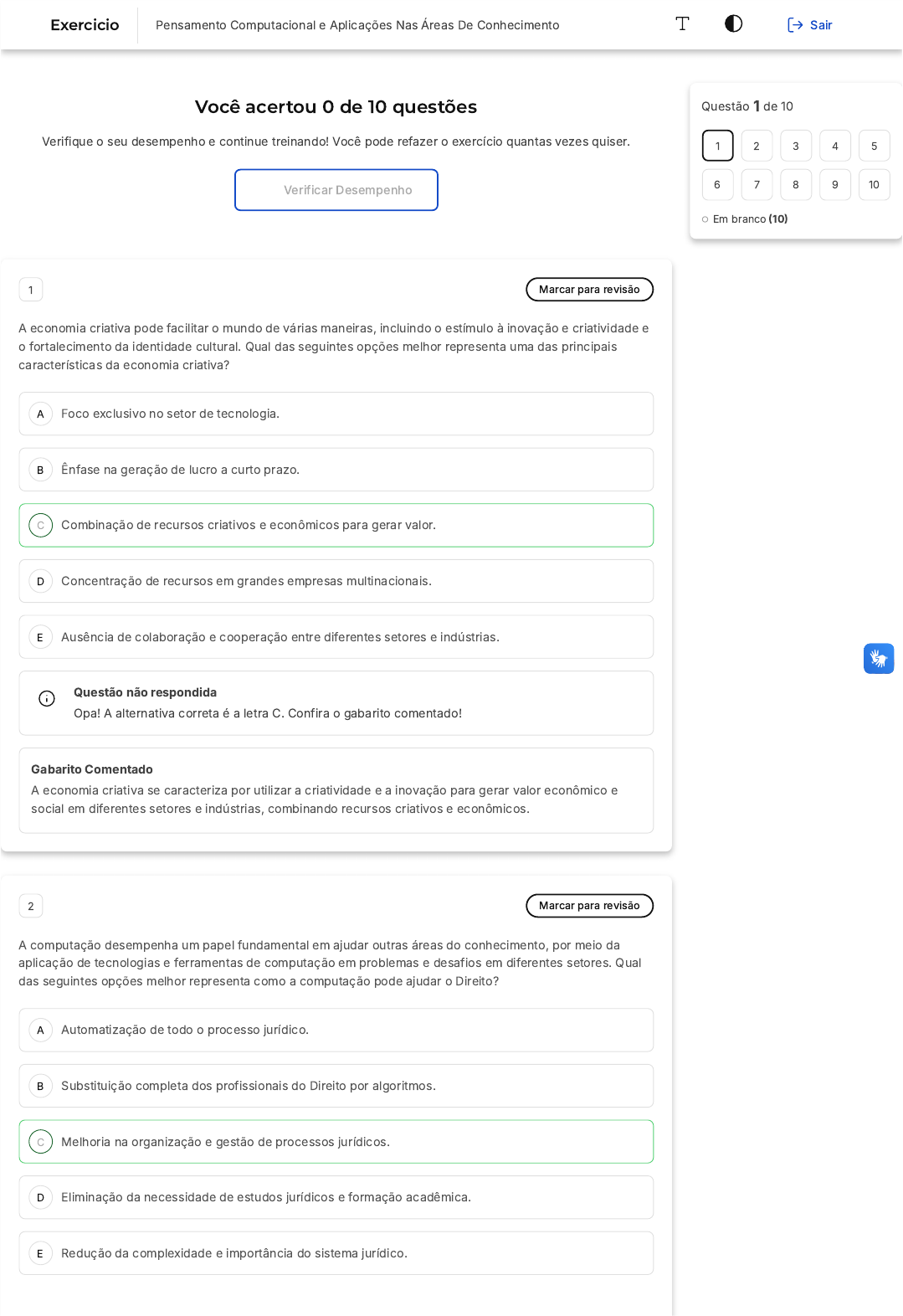 <p>Você acertou 0 de 10 questões</p><p>Verifique o seu desempenho e continue treinando! Você pode refazer o exercício quantas vezes quiser.</p><p>Verificar Desempenho</p><p>A</p><p>B</p><p>C</p><p>D</p><p>E</p><p>A</p><p>B</p><p>C</p><p>D</p><p>E</p><p>1 Marcar para revisão</p><p>A economia criativa pode facilitar o mundo de várias maneiras, incluindo o estímulo à inovação e criatividade e</p><p>o fortalecimento da identidade cultural. Qual das seguintes opções melhor representa uma das principais</p><p>características da economia criativa?</p><p>Foco exclusivo no setor de tecnologia.</p><p>Ênfase na geração de lucro a curto prazo.</p><p>Combinação de recursos criativos e econômicos para gerar valor.</p><p>Concentração de recursos em grandes empresas multinacionais.</p><p>Ausência de colaboração e cooperação entre diferentes setores e indústrias.</p><p>Questão não respondida</p><p>Opa! A alternativa correta é a letra C. Confira o gabarito comentado!</p><p>Gabarito Comentado</p><p>A economia criativa se caracteriza por utilizar a criatividade e a inovação para gerar valor econômico e</p><p>social em diferentes setores e indústrias, combinando recursos criativos e econômicos.</p><p>2 Marcar para revisão</p><p>A computação desempenha um papel fundamental em ajudar outras áreas do conhecimento, por meio da</p><p>aplicação de tecnologias e ferramentas de computação em problemas e desafios em diferentes setores. Qual</p><p>das seguintes opções melhor representa como a computação pode ajudar o Direito?</p><p>Automatização de todo o processo jurídico.</p><p>Substituição completa dos profissionais do Direito por algoritmos.</p><p>Melhoria na organização e gestão de processos jurídicos.</p><p>Eliminação da necessidade de estudos jurídicos e formação acadêmica.</p><p>Redução da complexidade e importância do sistema jurídico.</p><p>Questão 1 de 10</p><p>Em branco �10�</p><p>1 2 3 4 5</p><p>6 7 8 9 10</p><p>Exercicio Pensamento Computacional e Aplicações Nas Áreas De Conhecimento Sair</p><p>A</p><p>B</p><p>C</p><p>D</p><p>E</p><p>A</p><p>B</p><p>C</p><p>Questão não respondida</p><p>Opa! A alternativa correta é a letra C. Confira o gabarito comentado!</p><p>Gabarito Comentado</p><p>A computação pode ajudar o Direito ao melhorar a organização e gestão de processos jurídicos, tornando</p><p>o trabalho dos profissionais mais eficiente e preciso. Tecnologias como softwares de gestão de</p><p>processos, inteligência artificial e big data podem ajudar a analisar grandes quantidades de informações e</p><p>facilitar o trabalho dos advogados na tomada de decisões e estratégias jurídicas. A automação de tarefas</p><p>repetitivas e burocráticas, como preenchimento de formulários, também pode liberar tempo e recursos</p><p>para que os profissionais do Direito se concentrem em tarefas mais complexas e de maior valor agregado.</p><p>No entanto, a computação não substitui a formação acadêmica em Direito e a atuação ética e responsável</p><p>dos profissionais do setor.</p><p>3 Marcar para revisão</p><p>O conceito de pensamento computacional compreende uma série de fatores que são conjugados para se</p><p>alcançar um objetivo predefinido. Assinale a alternativa que melhor define pensamento computacional.</p><p>Saber programar em diversas linguagens.</p><p>Uma forma de estruturar a resolução de problemas complexos.</p><p>Pensar como computadores.</p><p>Conhecer e saber usar as principais ferramentas da internet e editores de texto.</p><p>Substituir a utilização de computadores por raciocínio humano.</p><p>Questão não respondida</p><p>Opa! A alternativa correta é a letra B. Confira o gabarito comentado!</p><p>Gabarito Comentado</p><p>O pensamento computacional é melhor definido como uma forma de estruturar a resolução de problemas</p><p>complexos. Este conceito não se limita apenas a programar em diversas linguagens, pensar como</p><p>computadores, conhecer e usar ferramentas da internet e editores de texto ou substituir a utilização de</p><p>computadores por raciocínio humano. Na verdade, o pensamento computacional se baseia em quatro</p><p>pilares fundamentais: decomposição, abstração, reconhecimento de padrões e algoritmos. Esses pilares,</p><p>quando combinados, formam a base para resolver problemas complexos de maneira estruturada.</p><p>4 Marcar para revisão</p><p>A computação desempenha um papel fundamental em ajudar outras áreas do conhecimento, por meio da</p><p>aplicação de tecnologias e ferramentas de computação em problemas e desafios em diferentes setores. Qual</p><p>das seguintes opções melhor representa como a computação pode ajudar o Direito?</p><p>Automatização de todo o processo jurídico.</p><p>Substituição completa dos profissionais do Direito por algoritmos.</p><p>Melhoria na organização e gestão de processos jurídicos.</p><p>D</p><p>E</p><p>A</p><p>B</p><p>C</p><p>D</p><p>E</p><p>Eliminação da necessidade de estudos jurídicos e formação acadêmica.</p><p>Redução da complexidade e importância do sistema jurídico.</p><p>Questão não respondida</p><p>Opa! A alternativa correta é a letra C. Confira o gabarito comentado!</p><p>Gabarito Comentado</p><p>A computação pode ajudar o Direito ao melhorar a organização e gestão de processos jurídicos, tornando</p><p>o trabalho dos profissionais mais eficiente e preciso. Tecnologias como softwares de gestão de</p><p>processos, inteligência artificial e big data podem ajudar a analisar grandes quantidades de informações e</p><p>facilitar o trabalho dos advogados na tomada de decisões e estratégias jurídicas. A automação de tarefas</p><p>repetitivas e burocráticas, como preenchimento de formulários, também pode liberar tempo e recursos</p><p>para que os profissionais do Direito se concentrem em tarefas mais complexas e de maior valor agregado.</p><p>No entanto, a computação não substitu
