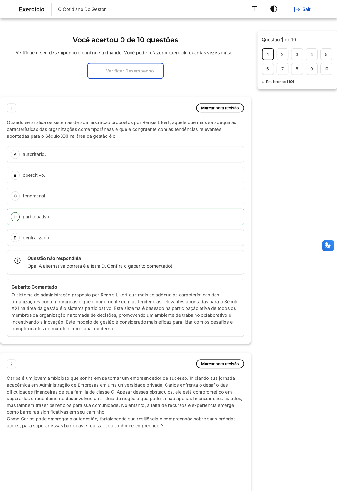 <p>Você acertou 0 de 10 questões</p><p>Verifique o seu desempenho e continue treinando! Você pode refazer o exercício quantas vezes quiser.</p><p>Verificar Desempenho</p><p>A</p><p>B</p><p>C</p><p>D</p><p>E</p><p>1 Marcar para revisão</p><p>Quando se analisa os sistemas de administração propostos por Rensis Likert, aquele que mais se adéqua às</p><p>características das organizações contemporâneas e que é congruente com as tendências relevantes</p><p>apontadas para o Século XXI na área da gestão é o:</p><p>autoritário.</p><p>coercitivo.</p><p>fenomenal.</p><p>participativo.</p><p>centralizado.</p><p>Questão não respondida</p><p>Opa! A alternativa correta é a letra D. Confira o gabarito comentado!</p><p>Gabarito Comentado</p><p>O sistema de administração proposto por Rensis Likert que mais se adéqua às características das</p><p>organizações contemporâneas e que é congruente com as tendências relevantes apontadas para o Século</p><p>XXI na área da gestão é o sistema participativo. Este sistema é baseado na participação ativa de todos os</p><p>membros da organização na tomada de decisões, promovendo um ambiente de trabalho colaborativo e</p><p>incentivando a inovação. Este modelo de gestão é considerado mais eficaz para lidar com os desafios e</p><p>complexidades do mundo empresarial moderno.</p><p>2 Marcar para revisão</p><p>Carlos é um jovem ambicioso que sonha em se tornar um empreendedor de sucesso. Iniciando sua jornada</p><p>acadêmica em Administração de Empresas em uma universidade privada, Carlos enfrenta o desafio das</p><p>dificuldades financeiras de sua família de classe C. Apesar desses obstáculos, ele está comprometido em</p><p>superá-los e recentemente desenvolveu uma ideia de negócio que poderia não apenas financiar seus estudos,</p><p>mas também trazer benefícios para sua comunidade. No entanto, a falta de recursos e experiência emerge</p><p>como barreiras significativas em seu caminho.</p><p>Como Carlos pode empregar a autogestão, fortalecendo sua resiliência e compreensão sobre suas próprias</p><p>ações, para superar essas barreiras e realizar seu sonho de empreender?</p><p>Questão 1 de 10</p><p>Em branco �10�</p><p>1 2 3 4 5</p><p>6 7 8 9 10</p><p>Exercicio O Cotidiano Do Gestor Sair</p><p>A</p><p>B</p><p>C</p><p>D</p><p>E</p><p>A</p><p>B</p><p>C</p><p>D</p><p>E</p><p>Buscar um emprego de tempo integral para juntar capital, o que pode garantir uma segurança</p><p>financeira imediata, mas pode postergar seus estudos e o avanço de seu negócio, desafiando sua</p><p>resiliência e capacidade de autogestão ao equilibrar objetivos de curto e longo prazo.</p><p>Engajar-se em programas de mentoria para jovens empreendedores, o que não apenas provê</p><p>aconselhamento, recursos e oportunidades de networking, mas também fortalece a resiliência e a</p><p>autoconsciência ao navegar pelos desafios do empreendedorismo.</p><p>Procurar um cofundador com recursos financeiros, o que pode aliviar algumas pressões imediatas,</p><p>mas desafia a autogestão de Carlos ao ponderar sobre a perda de controle de sua visão de negócio e</p><p>manter a resiliência diante de compromissos.</p><p>Priorizar exclusivamente a economia de dinheiro, evitando gastos com educação ou desenvolvimento</p><p>pessoal, o que pode limitar o crescimento pessoal e profissional, testando sua resiliência e</p><p>habilidades de autogestão ao enfrentar o futuro incerto sem investimento adequado em si mesmo.</p><p>Iniciar seu negócio imediatamente sem preparação adicional, confiando puramente na paixão e</p><p>determinação, o que pode parecer uma manifestação de resiliência, mas na realidade, desafia a</p><p>eficácia da autogestão ao negligenciar a importância de um planejamento sólido e conhecimento de</p><p>mercado.</p><p>Questão não respondida</p><p>Opa! A alternativa correta é a letra B. Confira o gabarito comentado!</p><p>Gabarito Comentado</p><p>A busca por um emprego de tempo integral pode oferecer uma solução temporária, mas não apoia o</p><p>desenvolvimento a longo prazo nem fortalece a resiliência de Carlos perante adversidades futuras.</p><p>Programas de mentoria, por outro lado, são fundamentais para o desenvolvimento da resiliência e</p><p>autogestão, oferecendo suporte essencial para superar a falta de experiência e acesso a recursos,</p><p>alinhando-se perfeitamente com a capacidade de Carlos de gerenciar suas ações e entender o impacto</p><p>delas em sua jornada. A escolha de um cofundador rico pode parecer atraente, mas é vital que Carlos</p><p>mantenha a autogestão de sua visão a longo prazo, equilibrando a necessidade de recursos com o desejo</p><p>de manter o controle. Focar unicamente em economizar dinheiro sem investir em si mesmo pode restringir</p><p>seu crescimento, desafiando sua resiliência e capacidade de autogestão em um mundo em constante</p><p>mudança. Finalmente, lançar seu negócio sem a devida preparação testa falsamente sua resiliência,</p><p>subestimando a importância da autogestão eficaz e do planejamento estratégico.</p><p>3 Marcar para revisão</p><p>Pedro Paulo pretende adotar um novo modelo de gestão, pois, no local em que trabalha, prevalece o modelo</p><p>autoritário coercitivo estudado por Likert, cujas características são:</p><p>Medidas disciplinares, obediência e recompensas sociais.</p><p>Certa confiança nas pessoas e presença de recompensas sociais.</p><p>Comunicações verticais, ordens diretivas e processo decisório centralizado.</p><p>Comunicação precária e definição de políticas de controle centradas em resultados.</p><p>Recompensas sociais e financeiras, liderança compartilhada e confiança nas pessoas.</p><p>Questão não respondida</p><p>Opa! A alternativa correta é a letra C. Confira o gabarito comentado!</p><p>A</p><p>B</p><p>C</p><p>D</p><p>E</p><p>A</p><p>B</p><p>C</p><p>Gabarito Comentado</p><p>O modelo autoritário coerci