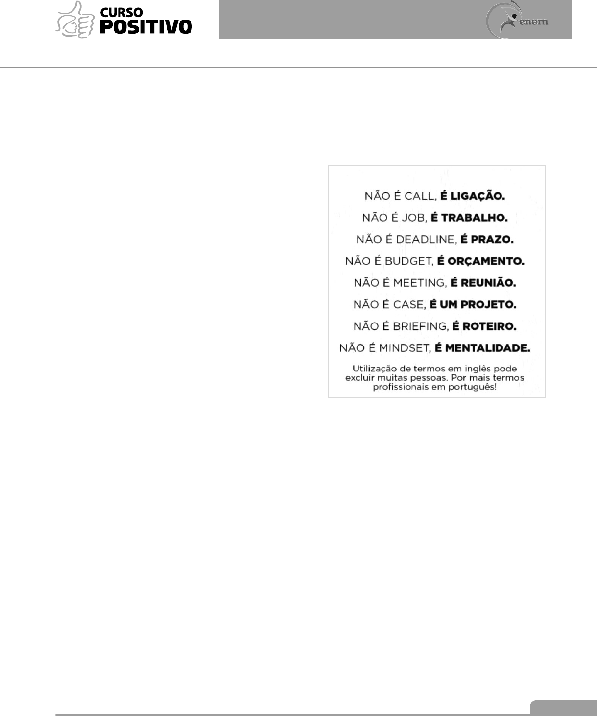 <p>9LINGUAGENS, CIÊNCIAS HUMANAS E REDAÇÃO</p><p>EXAME NACIONAL DO ENSINO MÉDIO</p><p>2023</p><p>2.o SIMULADO ENEM</p><p>riscos e trabalham para garantir que a tecnologia</p><p>seja desenvolvida de forma responsável e ética. A</p><p>colaboração entre especialistas em IA, legisladores,</p><p>empresas e a sociedade em geral é fundamental,</p><p>para abordar preocupações e garantir um futuro se-</p><p>guro e benéfico para todos com o uso da inteligên-</p><p>cia artificial”. Se ele estava mentindo ou não quando</p><p>respondeu isso, contudo, ninguém jamais saberá.</p><p>https://revistaoeste.com/revista/edicao-159/quando-a-inteligencia-artifi-</p><p>cial-e-capaz-de-mentir/(acesso em 17/04/2023) – com adaptações</p><p>Ao abordar os riscos no uso da Inteligência Artificial</p><p>(IA), sobretudo com ferramentas como o ChatGPT,</p><p>o autor do texto</p><p>a) em nenhum momento revela seu posicionamento</p><p>no texto, limitando-se a apresentar um texto típi-</p><p>co do gênero reportagem.</p><p>b) apresenta os riscos no uso da IA, com a citação</p><p>de fatos recentes, como a tentativa bem-sucedi-</p><p>da de a máquina enganar humanos e a carta as-</p><p>sinada por acadêmicos, empresários e especia-</p><p>listas, pedindo uma pausa no desenvolvimento</p><p>dos chats como o ChatGPT.</p><p>c) revela que nem todos os especialistas e empresá-</p><p>rios são favoráveis à pausa no desenvolvimento dos</p><p>chats de inteligência artificial, pois muitos temem</p><p>significativas perdas econômicas com tal pausa.</p><p>d) cita a opinião do próprio ChatGPT, cuja argumen-</p><p>tação utilizada descarta qualquer risco quanto ao</p><p>uso futuro de tal tecnologia, opinião também en-</p><p>dossada por Bill Gates, no parágrafo anterior.</p><p>e) defende que a segurança no uso da IA seja de</p><p>responsabilidade estatal, que deve acompanhar e</p><p>regulamentar totalmente o uso de tal tecnologia.</p><p>08. Leia com atenção os textos a seguir:</p><p>Texto 1</p><p>Estrangeirismo – É o emprego de palavras,</p><p>expressões e construções alheias ao idioma que a</p><p>ele chegam por empréstimos tomados de outra lín-</p><p>gua. Os estrangeirismos que entram no idioma, por</p><p>um processo natural de assimilação de cultura ou</p><p>de contiguidade geográfica, assumem aspecto de</p><p>sentimento político-patriótico que, aos olhos dos pu-</p><p>ristas extremados, trazem o selo da subserviência</p><p>e da degradação do país. Esquecem-se de que a</p><p>língua, como produto social, registra, em tais estran-</p><p>geirismos, os contatos de povos. (...) O que se deve</p><p>combater é o excesso de importação de palavras</p><p>estrangeiras, mormente aquela desnecessária por</p><p>se encontrarem no vernáculo palavras equivalentes.</p><p>BECHARA, Evanildo. Moderna gramática portuguesa. 38ª ed. Ver.</p><p>Ampl. Rio de Janeiro: Nova Fronteira, 2015, p. 618 (com adaptações)</p><p>Vocabulário</p><p>• Mormente: principalmente, sobretudo</p><p>• Vernáculo: idioma nacional, com significativo</p><p>grau de pureza</p><p>Texto 2</p><p>https://www.facebook.com/www.litteratraducoes.com.br/photos/</p><p>a.672665776172382/3283919738380293/?type=3</p><p>(acesso em 16/04/2023)</p><p>Os dois textos abordam a temática dos estrangeiris-</p><p>mos na língua portuguesa. Entretanto, em relação</p><p>ao Texto 1, o Texto 2</p><p>a) exemplifica o combate ao excesso de termos es-</p><p>trangeiros na língua nacional, por mais que tal</p><p>ampliação vocabular possa gerar mais oportu-</p><p>nidades de inserção do cidadão no mercado de</p><p>trabalho.</p><p>b) assume um enfoque mais social do que profissio-</p><p>nal ou linguístico.</p><p>c) apresenta expressões oriundas do inglês para</p><p>comprovar a “subserviência e a degradação do</p><p>país”.</p><p>d) defende a ideia de que os estrangeirismos po-</p><p>dem funcionar como um mecanismo de exclusão</p><p>profissional.</p><p>e) relativiza o conceito de estrangeirismos, uma vez</p><p>que lista palavras que já estão definitivamente</p><p>adaptadas à língua nacional.</p>