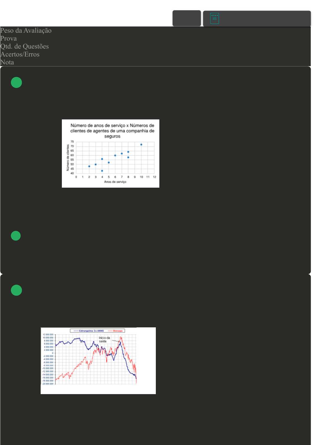 <p>Prova Impressa</p><p>GABARITO | Avaliação disciplina on-line (Cod.:512293)</p><p>Peso da Avaliação 10,00</p><p>Prova 20631855</p><p>Qtd. de Questões 10</p><p>Acertos/Erros 8/2</p><p>Nota 8,00</p><p>Os gráficos estão presentes em todas as formas de comunicação. São utilizados para demonstrar</p><p>de forma mais fácil uma situação envolvendo números. Analise o gráfico a seguir e identifique sua</p><p>classificação:</p><p>FONTE DA IMAGEM: https://pt.wikipedia.org/wiki/Gr%C3%A1fico_de_dispers%C3%A3o. Acesso</p><p>em: 20 mar. 2019.</p><p>A Gráfico de Área.</p><p>B Gráfico em Rede.</p><p>C Gráfico de Dispersão.</p><p>D Gráfico de Linhas.</p><p>Gráfico é uma forma de se expressar visualmente dados ou valores numéricos, de maneiras</p><p>diferentes, facilitando a compreensão dos mesmos. Analise o gráfico a seguir e identifique sua</p><p>classificação:</p><p>FONTE DA IMAGEM: http://ninjadoexcel.com.br/como-criar-graficos-no-excel/. Acesso em: 20</p><p>mar. 2019.</p><p>A Gráfico de Coluna.</p><p>B Gráfico de Área.</p><p>C</p><p>VOLTAR</p><p>A+ Alterar modo de visualização</p><p>1</p><p>2</p><p>19/10/2024, 19:56 Avaliação disciplina on-line</p><p>about:blank 1/4</p><p>Gráfico de Dispersão.</p><p>D Gráfico de Linhas.</p><p>Os mapas registram áreas, demarcações, territórios etc. É uma forma de se ver em escala</p><p>reduzida informações de uma determinada região ou país. Analise o mapa a seguir e identifique sua</p><p>classificação:</p><p>FONTE DA IMAGEM: https://bit.ly/2TEXeEi. Acesso em: 20 mar. 2019.</p><p>A Mapa histórico.</p><p>B Mapa econômico.</p><p>C Mapa demográfico.</p><p>D Mapa político.</p><p>Os gráficos visam facilitar a compreensão de informações apresentadas, ajudam a identificar</p><p>padrões, verificar resultados e comparar medidas de forma ágil. Podem ser utilizados de diversas</p><p>formas e em diferentes áreas do conhecimento. Assinale a alternativa CORRETA que apresenta o</p><p>conceito de gráfico:</p><p>A Representações que apresentam uma média de um conjunto de dados.</p><p>B Representações visuais de resultados geométricos.</p><p>C Representações qualitativas de um conjunto de dados.</p><p>D Representações geométricas de um conjunto de dados.</p><p>3</p><p>Revisar Conteúdo do Livro</p><p>4</p><p>Revisar Conteúdo do Livro</p><p>19/10/2024, 19:56 Avaliação disciplina on-line</p><p>about:blank 2/4</p><p>É uma ferramenta utilizada para transmitir informações por meio do uso de imagens, desenhos e</p><p>demais elementos visuais gráficos. É útil nos mais variados setores. De qual ferramenta estamos</p><p>falando?</p><p>A Infográfico.</p><p>B Charge.</p><p>C Tabela.</p><p>D Tirinhas.</p><p>Esse tipo de mapa é utilizado para representar acontecimentos em um determinado período</p><p>histórico. De que tipo de mapa estamos falando?</p><p>A Mapa histórico.</p><p>B Mapa econômico.</p><p>C Mapa demográfico.</p><p>D Mapa político.</p><p>Os mapas podem revelar diferentes visões do mundo. Carregam um simbolismo que pode estar</p><p>associado ao conteúdo neles representado, constituindo assim, um saber que é produto social. Eles</p><p>podem ser divididos em alguns tipos. Com relação ao tipo de mapa que representa a superfície física</p><p>da Terra, como as formas e o relevo, assinale a alternativa CORRETA:</p><p>A Mapa geral.</p><p>B Mapa demográfico.</p><p>C Mapa típico.</p><p>D Mapa físico.</p><p>Os mapas conjugam-se com a prática histórica, podendo revelar diferentes visões do mundo.</p><p>Existem os tipos de mapa que representam as divisas e fronteiras entre países. Quanto ao nome dado a</p><p>esse tipo de mapa, assinale a alternativa CORRETA:</p><p>A Mapas políticos.</p><p>B Mapas demográficos.</p><p>C Mapas de tema.</p><p>5</p><p>6</p><p>7</p><p>8</p><p>19/10/2024, 19:56 Avaliação disciplina on-line</p><p>about:blank 3/4</p><p>D Mapas de tipo.</p><p>Mapas que apresentam uma representação espacial das populações, como os índices</p><p>populacionais, taxas de analfabetismo e migrações, são denominados por um nome específico. Qual é</p><p>esse nome?</p><p>A Mapas físicos.</p><p>B Mapas históricos.</p><p>C Mapas econômicos.</p><p>D Mapas demográficos.</p><p>Quando se fala em mapas, somos remetidos à Geografia, por ser esse um aspecto cultural, mas</p><p>esse mesmo mapa pode nos remeter a outras situações de análise de contextos que foram nele</p><p>baseadas. Com relação aos mapas, assinale a alternativa CORRETA:</p><p>A Um mapa são imagens que representam a flora brasileira.</p><p>B Um mapa pode remeter a outras áreas de conhecimentos.</p><p>C Um mapa somente é uma representação fidedigna das regiões.</p><p>D Um mapa é uma representação aleatória de imagens.</p><p>9</p><p>10</p><p>Imprimir</p><p>19/10/2024, 19:56 Avaliação disciplina on-line</p><p>about:blank 4/4</p>
