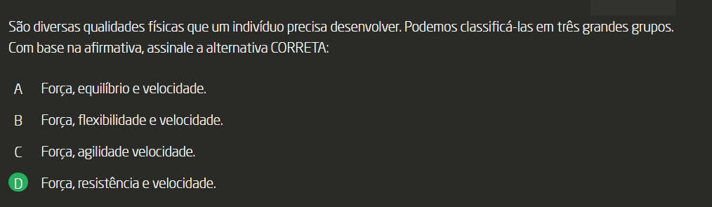 São diversas qualidades físicas que um indivíduo precisa desenvolver. Podemos classificá-las em três grandes grupos. Com base na afirmativa, assinale a alternativa CORRETA: A Força, equilíbrio e velocidade. B Força, flexibilidade e velocidade. Força, agilidade velocidade. D Força, resistência e velocidade.