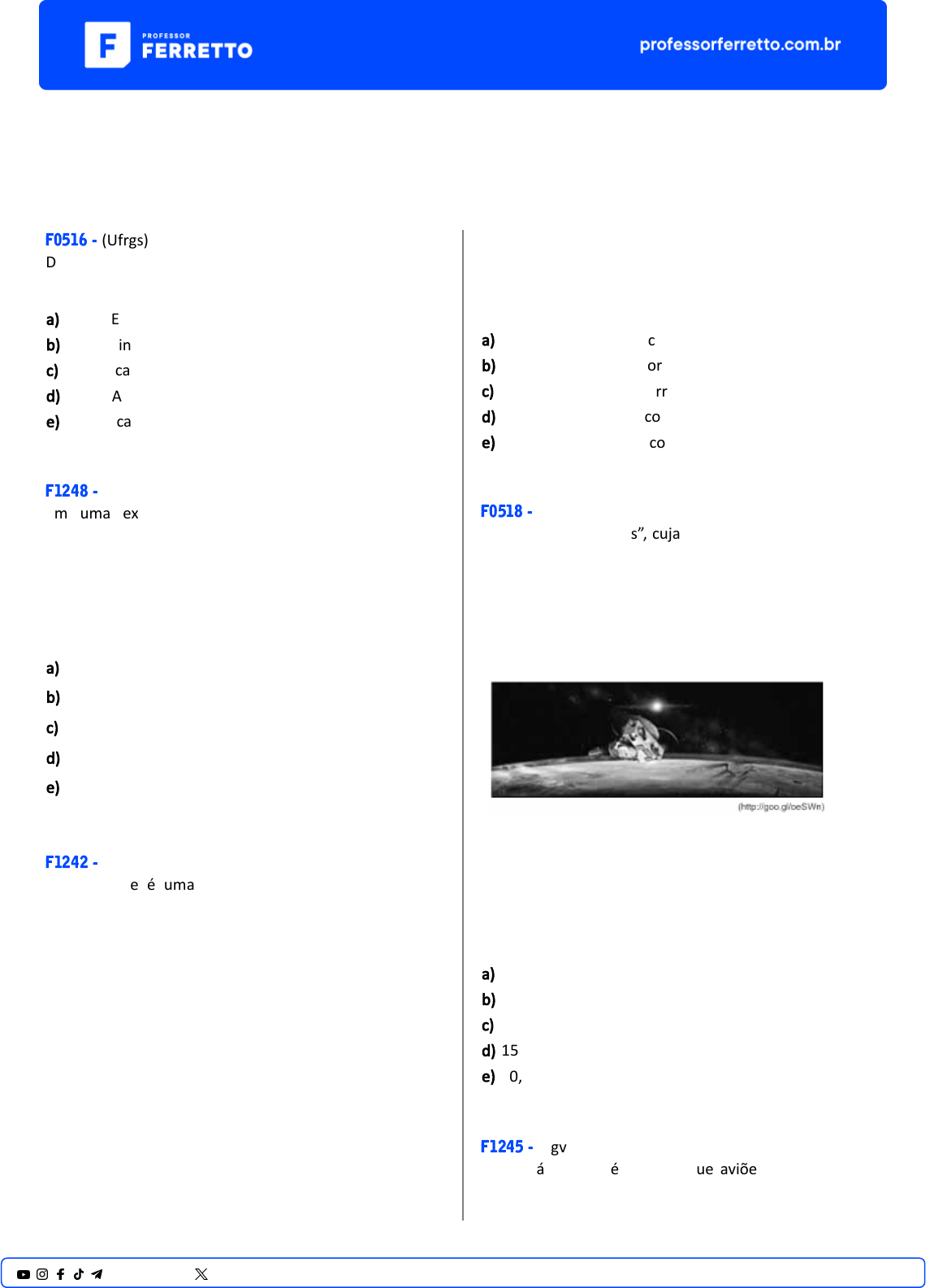 <p>Física Moderna</p><p>Teoria da Relatividade</p><p>F0516 - (Ufrgs)</p><p>Dilatação temporal e contração espacial são conceitos</p><p>que decorrem da:</p><p>a) Teoria Especial da Rela�vidade.</p><p>b) Termodinâmica.</p><p>c) Mecânica Newtoniana.</p><p>d) Teoria Atômica de Bohr.</p><p>e) Mecânica Quân�ca.</p><p>F1248 - (Unisc)</p><p>Em uma explosão de uma mina de carvão foram</p><p>u�lizadas 1.000 toneladas de explosivo trinitrotolueno</p><p>(TNT), o que equivale a 1,0 x 1012 calorias. Qual foi,</p><p>aproximadamente, a quan�dade de massa conver�da em</p><p>energia equivalente a essa explosão? (1 caloria = 4,18 J e</p><p>c = 3,0 x 108 m/s)</p><p>a) 4,6 x 10–5 kg</p><p>b) 4,6 x 10–8 kg</p><p>c) 1,1 x 10–5 kg</p><p>d) 1,1 x 10–8 kg</p><p>e) 1,1 x 10–13 kg</p><p>F1242 - (U�f)</p><p>A velocidade é uma grandeza rela�va, ou seja, a sua</p><p>determinação depende do referencial a par�r do qual</p><p>está sendo medida. A Teoria da Rela�vidade Especial,</p><p>elaborada em 1905, pelo �sico alemão Albert Einstein,</p><p>afirma que o comprimento e a massa de um objeto são</p><p>grandezas que também dependem da velocidade e,</p><p>consequentemente, são rela�vas.</p><p>Sobre a Teoria da Rela�vidade Especial, julgue os itens</p><p>abaixo e marque a alterna�va CORRETA.</p><p>I. A massa de um objeto é independente da velocidade</p><p>do mesmo, medida por qualquer referencial inercial.</p><p>II. A velocidade da luz é um limite superior para a</p><p>velocidade de qualquer objeto.</p><p>III. Intervalos de tempo e de espaço são grandezas</p><p>absolutas e independentes dos referenciais.</p><p>IV. As leis da Física são as mesmas em todos os sistemas</p><p>de referência inercial.</p><p>V. Massa e energia são quan�dades que não possuem</p><p>nenhuma relação</p><p>a) somente II e III estão corretas.</p><p>b) somente I e II estão corretas.</p><p>c) somente I e V estão corretas.</p><p>d) somente I e III estão corretas.</p><p>e) somente II e IV estão corretas.</p><p>F0518 - (Fgv)</p><p>A nave “New Horizons”, cuja foto é apresentada a seguir,</p><p>par�u do Cabo Canaveral em janeiro de 2006 e chegou</p><p>bem perto de Plutão em julho de 2015. Foram mais de 9</p><p>anos no espaço, voando a 21 km/s. É uma velocidade</p><p>muito alta para nossos padrões aqui na Terra, mas muito</p><p>baixa se comparada aos 300.000 km/s da velocidade da</p><p>luz no vácuo.</p><p>Considere uma nave que possa voar a uma velocidade</p><p>igual a 80% da velocidade da luz e cuja viagem dure 9</p><p>anos para nós, observadores localizados na Terra.</p><p>Para um astronauta no interior dessa nave, tal viagem</p><p>duraria cerca de:</p><p>a) 4,1 anos</p><p>b) 5,4 anos</p><p>c) 6,5 anos</p><p>d) 15 anos</p><p>e) 20,5 anos</p><p>F1245 - (Fgv)</p><p>Não está longe a época em que aviões poderão voar a</p><p>velocidades da ordem de grandeza da velocidade da luz</p><p>1@professorferretto @prof_ferretto</p><p>(c) no vácuo. Se um desses aviões, voando a uma</p><p>velocidade de 0,6 · c, passar rente à pista de um</p><p>aeroporto de 2,5 km, percorrendo- a em sua extensão,</p><p>para o piloto desse avião a pista terá uma extensão, em</p><p>km, de</p><p>a) 1,6.</p><p>b) 2,0.</p><p>c) 2,3.</p><p>d) 2,8.</p><p>e) 3,2.</p><p>F1250 - (Ufg)</p><p>Em 1964, o �sico britânico Peter Higgs propôs a</p><p>existência de um campo, o qual, ao interagir com uma</p><p>par�cula, conferia a ela a sua massa. A unidade básica</p><p>desse campo foi chamada de bóson de Higgs. Em julho</p><p>de 2012, os cien�stas do CERN (Centro Europeu de</p><p>Pesquisas Nucleares) anunciaram terem iden�ficado o</p><p>bóson de Higgs, com uma massa de 125 GeV</p><p>(gigaelétronvolt). O valor dessa massa, em kg, é de:</p><p>Dados: 1 eV = 1,6 x 10–19 J; c = 3,0 x 108 m/s.</p><p>a) 4,50 x 10+24</p><p>b) 6,66 x 10–18</p><p>c) 2,22 x 10–25</p><p>d) 6,66 x 10–27</p><p>e) 2,22 x 10–34</p><p>F1241 - (Ueg)</p><p>Qual das afirmações a seguir é correta para a teoria da</p><p>rela�vidade de Einstein?</p><p>a) No vácuo, a velocidade da luz depende do movimento</p><p>da fonte de luz e tem igual valor em todas as direções.</p><p>b) Elétrons são expulsos de uma super�cie quando</p><p>ocorre a incidência de uma radiação eletromagné�ca</p><p>(luz).</p><p>c) Em determinados fenômenos, a luz apresenta</p><p>natureza de par�cula e, em outros, natureza</p><p>ondulatória.</p><p>d) Na natureza, não podem ocorrer interações de</p><p>velocidades superiores à velocidade da luz c.</p><p>F0517 - (Fgv)</p><p>Os avanços tecnológicos que a ciência experimentou nos</p><p>úl�mos tempos nos permitem pensar que, dentro em</p><p>breve, seres humanos viajarão pelo espaço sideral a</p><p>velocidades significa�vas, se comparadas com a</p><p>velocidade da luz no vácuo.</p><p>Imagine um astronauta terráqueo que, do interior de</p><p>uma nave que se desloca a uma velocidade igual a 60%</p><p>da velocidade da luz, avista um planeta. Ao passar pelo</p><p>planeta, ele consegue medir seu diâmetro, encontrando</p><p>o valor 4,8 · 106 m. Se a nave parasse naquelas</p><p>proximidades e o diâmetro do planeta fosse medido</p><p>novamente, o valor encontrado, em 106 m, seria de:</p><p>a) 2,7</p><p>b) 3,6</p><p>c) 6,0</p><p>d) 7,5</p><p>e) 11,0</p><p>F0520 - (Uel)</p><p>Pensem nas crianças Mudas telepá�cas</p><p>Pensem nas meninas Cegas inexatas</p><p>Pensem nas mulheres Rotas alteradas</p><p>Pensem nas feridas</p><p>Como rosas cálidas</p><p>Mas oh não se esqueçam</p><p>Da rosa da rosa</p><p>Da rosa de Hiroshima</p><p>A rosa hereditária</p><p>A rosa radioa�va Estúpida e inválida</p><p>A rosa com cirrose</p><p>A an�-rosa atômica</p><p>Sem cor sem perfume</p><p>Sem rosa sem nada</p><p>A Rosa de Hiroshima. Compositores: Vinícius de Moraes,</p><p>Gerson Conrad, 1973</p><p>No texto, estão expressos os horrores causados na</p><p>população de Hiroshima pela explosão da 