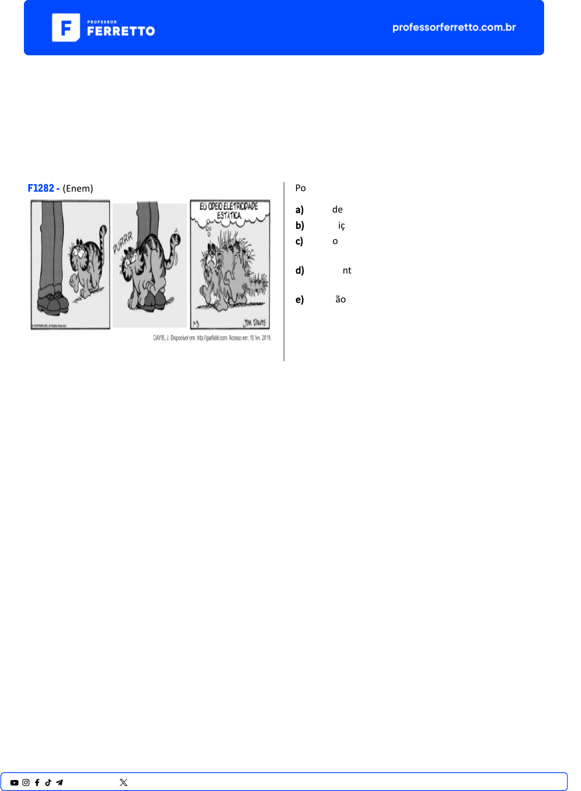 <p>ENEM</p><p>Eletrostática</p><p>Processos de Eletrização</p><p>F1282 - (Enem) Por qual mo�vo ocorre a eletrização ilustrada na �rinha?</p><p>a) Troca de átomos entre a calça e os pelos do gato.</p><p>b) Diminuição do número de prótons nos pelos do gato.</p><p>c) Criação de novas par�culas eletrizadas nos pelos do</p><p>gato.</p><p>d) Movimentação de elétrons entre a calça e os pelos do</p><p>gato.</p><p>e) Repulsão entre par�culas elétricas da calça e dos pelos</p><p>do gato.</p><p>1@professorferretto @prof_ferretto</p>
