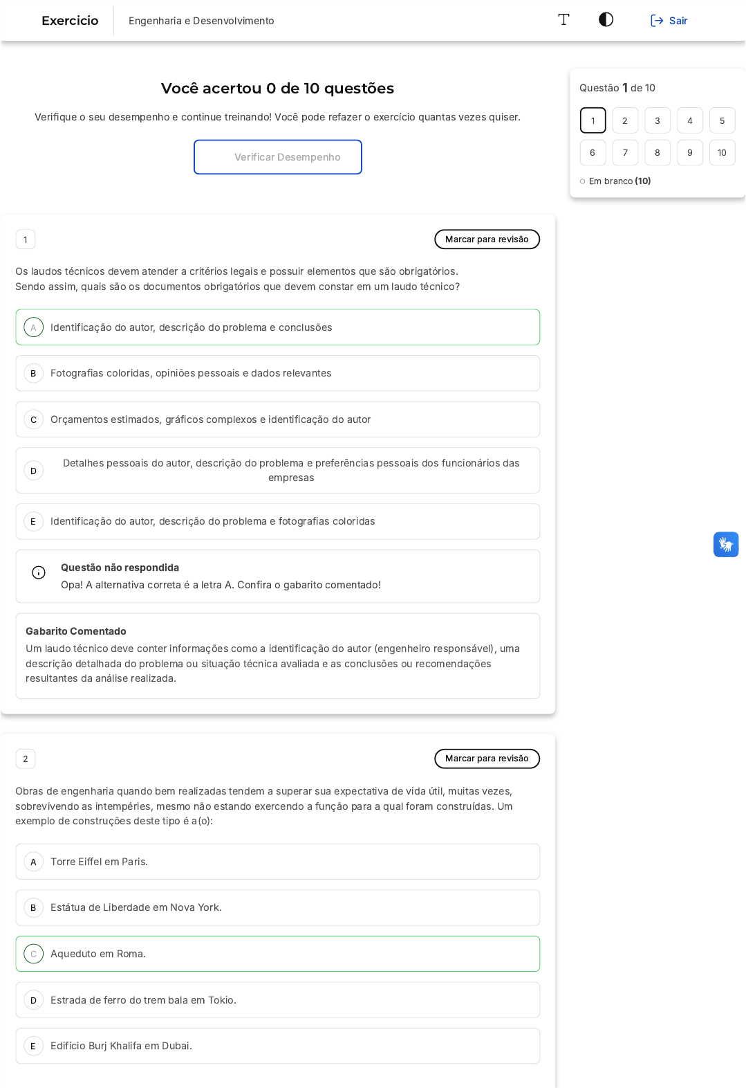 <p>Você acertou 0 de 10 questões</p><p>Verifique o seu desempenho e continue treinando! Você pode refazer o exercício quantas vezes quiser.</p><p>Verificar Desempenho</p><p>A</p><p>B</p><p>C</p><p>D</p><p>E</p><p>A</p><p>B</p><p>C</p><p>D</p><p>E</p><p>1 Marcar para revisão</p><p>Os laudos técnicos devem atender a critérios legais e possuir elementos que são obrigatórios.</p><p>Sendo assim, quais são os documentos obrigatórios que devem constar em um laudo técnico?</p><p>Identificação do autor, descrição do problema e conclusões</p><p>Fotografias coloridas, opiniões pessoais e dados relevantes</p><p>Orçamentos estimados, gráficos complexos e identificação do autor</p><p>Detalhes pessoais do autor, descrição do problema e preferências pessoais dos funcionários das</p><p>empresas</p><p>Identificação do autor, descrição do problema e fotografias coloridas</p><p>Questão não respondida</p><p>Opa! A alternativa correta é a letra A. Confira o gabarito comentado!</p><p>Gabarito Comentado</p><p>Um laudo técnico deve conter informações como a identificação do autor (engenheiro responsável), uma</p><p>descrição detalhada do problema ou situação técnica avaliada e as conclusões ou recomendações</p><p>resultantes da análise realizada.</p><p>2 Marcar para revisão</p><p>Obras de engenharia quando bem realizadas tendem a superar sua expectativa de vida útil, muitas vezes,</p><p>sobrevivendo as intempéries, mesmo não estando exercendo a função para a qual foram construídas. Um</p><p>exemplo de construções deste tipo é a(o):</p><p>Torre Eiffel em Paris.</p><p>Estátua de Liberdade em Nova York.</p><p>Aqueduto em Roma.</p><p>Estrada de ferro do trem bala em Tokio.</p><p>Edifício Burj Khalifa em Dubai.</p><p>Questão 1 de 10</p><p>Em branco �10�</p><p>1 2 3 4 5</p><p>6 7 8 9 10</p><p>Exercicio Engenharia e Desenvolvimento Sair</p><p>A</p><p>B</p><p>C</p><p>D</p><p>E</p><p>Questão não respondida</p><p>Opa! A alternativa correta é a letra C. Confira o gabarito comentado!</p><p>Gabarito Comentado</p><p>Os aquedutos romanos são exemplos de obras de engenharia que resistiram ao tempo e as suas funções.</p><p>Gigantescos e extensos estes aquedutos foram inteligentemente construídos para suprir as necessidades</p><p>de água para a cidade de Roma.</p><p>As demais opções apresentam obras de engenharia que são muito ou relativamente atuais, mas nada</p><p>comparado com as obras milenares dos romanos.</p><p>3 Marcar para revisão</p><p>Os princípios éticos são destacados no Art. 8º da Resolução nº 1.002/2002 �CONFEA, 2002�, como</p><p>fundamento da prática profissional da engenharia.</p><p>Marque a alternativa que indica um dos princípios éticos destacados no Art. 8º da Resolução nº 1.002/2002.</p><p>A profissão é exclusivamente um meio de obtenção de lucro</p><p>A profissão é um serviço voltado apenas para a elite da sociedade, que tem condição de pagar pelos</p><p>serviços</p><p>A profissão visa exclusivamente o benefício pessoal do profissional</p><p>A profissão é um bem social da humanidade, visando a preservação e o desenvolvimento harmônico</p><p>do ser humano e de seu ambiente</p><p>A prática profissional dispensa conduta honesta e digna</p><p>Questão não respondida</p><p>Opa! A alternativa correta é a letra D. Confira o gabarito comentado!</p><p>Gabarito Comentado</p><p>A profissão é um bem social da humanidade, visando a preservação e o desenvolvimento harmônico do</p><p>ser humano e de seu ambiente. Isso reflete o princípio ético destacado no Art. 8º, referindo-se ao objetivo</p><p>da profissão como um serviço para o benefício da sociedade. As demais alternativas estão incorretas,</p><p>pois vão contra os princípios éticos estabelecidos, enfatizando o lucro pessoal, a exclusividade elitista, a</p><p>busca do benefício pessoal e a falta de conduta honesta.</p><p>4 Marcar para revisão</p><p>O desenvolvimento da engenharia e da indústria andam lado a lado, um sendo dependente da evolução do</p><p>outro. Com relação a esse tema, analise as seguintes asserções:</p><p>I. No período da primeira Revolução Industrial os engenheiros, cientistas e inventores eram considerados</p><p>fundamentais para as invenções.</p><p>PORQUE</p><p>II. A lucratividade de uma indústria depende somente da capacidade técnica dos seus profissionais.</p><p>Analisando as asserções realizadas acima, assinale a opção que representa a correta razão entre elas.</p><p>A</p><p>B</p><p>C</p><p>D</p><p>E</p><p>A</p><p>B</p><p>C</p><p>D</p><p>E</p><p>A asserção I está correta e a asserção II é uma justificativa da asserção I.</p><p>A asserção I está correta e a asserção II está correta, mas não é uma justificativa da asserção I.</p><p>A asserção I está correta e a asserção II está incorreta.</p><p>A asserção I está incorreta e a asserção II está correta.</p><p>Ambas as asserções estão incorretas.</p><p>Questão não respondida</p><p>Opa! A alternativa correta é a letra C. Confira o gabarito comentado!</p><p>Gabarito Comentado</p><p>I � Correta: A função dos profissionais de criação era fundamental no período da primeira Revolução</p><p>Industrial</p><p>II � Incorreta: A lucratividade de uma indústria depende de inúmeros fatores, não somente da capacidade</p><p>técnica de seus profissionais.</p><p>5 Marcar para revisão</p><p>A primeira revolução industrial desencadeou vários processos de naturezas distintas. Escolha na lista abaixo</p><p>aquele que não se encaixa como consequência da primeira revolução industrial:</p><p>Êxodo rural em busca de empregos;</p><p>Bons salários por causa do aumento da produtividade;</p><p>Más condições de habitação;</p><p>Criação de Sindicatos;</p><p>Implantação do capitalismo.</p><p>Questão não respondida</p><p>Opa! A alternativa correta é a letra B. Confira o gabarito comentado!</p><p>Gabarito Comentado</