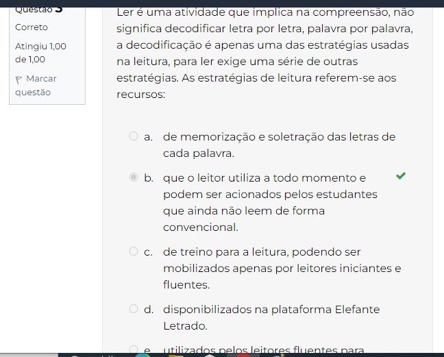 Ler é uma atividade que implica na compreensão, não significa decodificar letra por letra, palavra por palavra, 1,00 a decodificação é apenas uma das estratégias usadas na leitura, para ler exige uma série de outras ar estratégias. As estratégias de leitura referem-se aos recursos: a. de memorização e soletração das letras de cada palavra. b. que leitor utiliza a todo momento e podem ser acionados pelos estudantes que ainda não leem de forma convencional. C. de treino para a leitura, podendo ser mobilizados apenas por leitores iniciantes e fluentes. d. disponibilizados na plataforma Elefante Letrado. e utilizados pelos leitores fluentes para