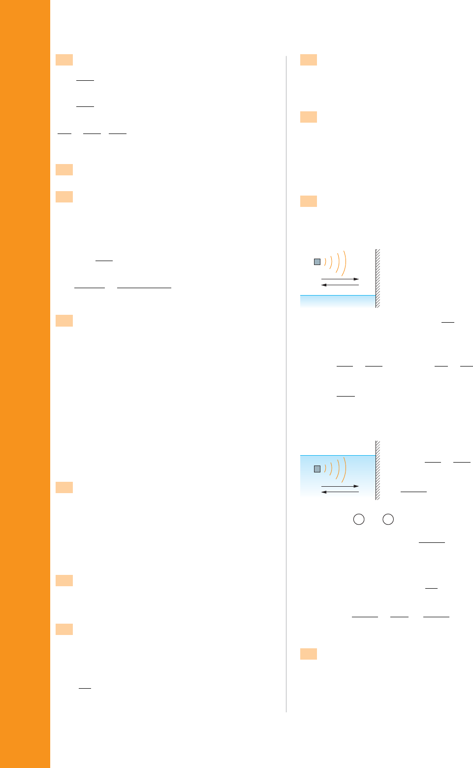 <p>232 RESOLUÇÃO</p><p>SIM</p><p>ULA</p><p>DÃO</p><p>: RE</p><p>SOL</p><p>UÇÃ</p><p>O</p><p>SIM</p><p>ULA</p><p>DÃO</p><p>: RE</p><p>SOL</p><p>UÇÃ</p><p>O</p><p>592 Alternativa a.</p><p>f1 �</p><p>v</p><p>2L</p><p>(tubo aberto)</p><p>f2 �</p><p>v</p><p>4L</p><p>(tubo fechado)</p><p>f</p><p>f</p><p>v</p><p>v</p><p>1</p><p>2</p><p>2� � �</p><p>2L</p><p>4L</p><p>593 Alternativa d.</p><p>594 Alternativa c. A proveta equivale a um tubo sono-</p><p>ro fechado, cujo comprimento é � � 40 � 10 � 30 cm.</p><p>A onda representada na figura corresponde ao 3º- har-</p><p>mônico, e como a proveta está em ressonância com o</p><p>diapasão, concluímos que f3 � 855 Hz.</p><p>Mas f3 �</p><p>3</p><p>4</p><p>v</p><p>�</p><p>. Logo:</p><p>v �</p><p>f3 4</p><p>3</p><p>855 4</p><p>3</p><p>�</p><p>�</p><p>� �� 0,3 → v � 342 m/s</p><p>595 Alternativa a.</p><p>Tempo de ida:</p><p>s � v1t1 → 3 400 � 340t1</p><p>t1 � 10 s</p><p>Tempo de volta:</p><p>v2 � �f → v2 � 200 � 17</p><p>v2 � 3 400 m/s</p><p>s � v2t2 → 3 400 � 3 400t</p><p>t2 � 1 s</p><p>Logo: t1 � 10 � 1 � 11 s</p><p>596 Alternativa d.</p><p>No modelo proposto:</p><p>� � 4 � 2,5 � � � 10 cm ou � � 0,1 m</p><p>Sendo v � 340 m/s e v � � � f:</p><p>340 � 0,1 � f → f � 3 400 Hz</p><p>597 Alternativa c. A pessoa dentro da água não ouve</p><p>o som de alerta dos seus companheiros porque o som</p><p>é quase que totalmente refletido na superfície da água.</p><p>598 Alternativa d. Como v � �f, v � 220 � 1,5 �</p><p>� 330 m/s.</p><p>Considerando-se �s a profundidade do poço, o inter-</p><p>valo de tempo �t que o som leva para percorrê-la é</p><p>�t �</p><p>8</p><p>2</p><p>� 4 s.</p><p>� �s � v � �t → �s � 330 � 4 � 1 320 m.</p><p>599 Alternativa c.</p><p>v � 1 500 m/s; t � 1 s</p><p>2x � v � t → 2x � 1 500 → x � 750 m</p><p>600 Alternativa a. Como na posição x o tempo de re-</p><p>torno do pulso aumenta, trata-se de um trecho mais</p><p>fundo que os demais: uma depressão submarina. Do</p><p>gráfico, temos t � 4 s. Assim:</p><p>2h � v � t → 2h � 1,4 � 4 → h � 2,8 km, em relação ao</p><p>nível do mar.</p><p>601 a) O sonar usa o princípio da reflexão para deter-</p><p>minar distâncias. Supondo as velocidades constantes</p><p>nos respectivos meios, podemos escrever:</p><p>• Aparelho emerso:</p><p>ttotal � t1 � t2 → 0,731 � t1 � t2</p><p>Sendo M � U, temos: s � vt → t �</p><p>S</p><p>v</p><p>.</p><p>Sendo a mesma distância e a mesma velocidade:</p><p>0,731 �</p><p>S</p><p>v</p><p>S</p><p>v</p><p>1</p><p>1</p><p>2</p><p>2</p><p>� → 0,731 �</p><p>S</p><p>v</p><p>S</p><p>v</p><p>�</p><p>0,731 � 2S</p><p>var</p><p>(1)</p><p>• Aparelho submerso</p><p>ttotal � t1 � t2 → 0,170 � t1 � t2</p><p>0,170 �</p><p>S</p><p>v</p><p>S</p><p>v</p><p>1</p><p>1</p><p>2</p><p>2</p><p>� → 0,170 �</p><p>�</p><p>2S</p><p>vágua</p><p>(2)</p><p>Substituindo 1 em 2 , temos:</p><p>0,731 � Var � 0,170 � Vágua →</p><p>V</p><p>v</p><p>água</p><p>ar</p><p>� 4,3</p><p>b) Ao passar do ar para a água, não há variação na</p><p>freqüência, logo: v � �f → f �</p><p>v</p><p>�</p><p>fágua � far →</p><p>v vágua</p><p>água</p><p>ar</p><p>ar</p><p>água</p><p>ar�</p><p>�</p><p>�</p><p>�</p><p>�</p><p>→ � 4,3</p><p>602 Alternativa d. Ao mudar o meio de propagação do</p><p>som, mudam a velocidade de propagação e o compri-</p><p>mento de onda, permanecendo a mesma freqüência.</p><p>Logo, b e e são falsas.</p><p>Como vágua � var, então �água � �ar. Assim, a e c são</p><p>falsas.</p><p>t1</p><p>t2</p><p>t1</p><p>t2</p>