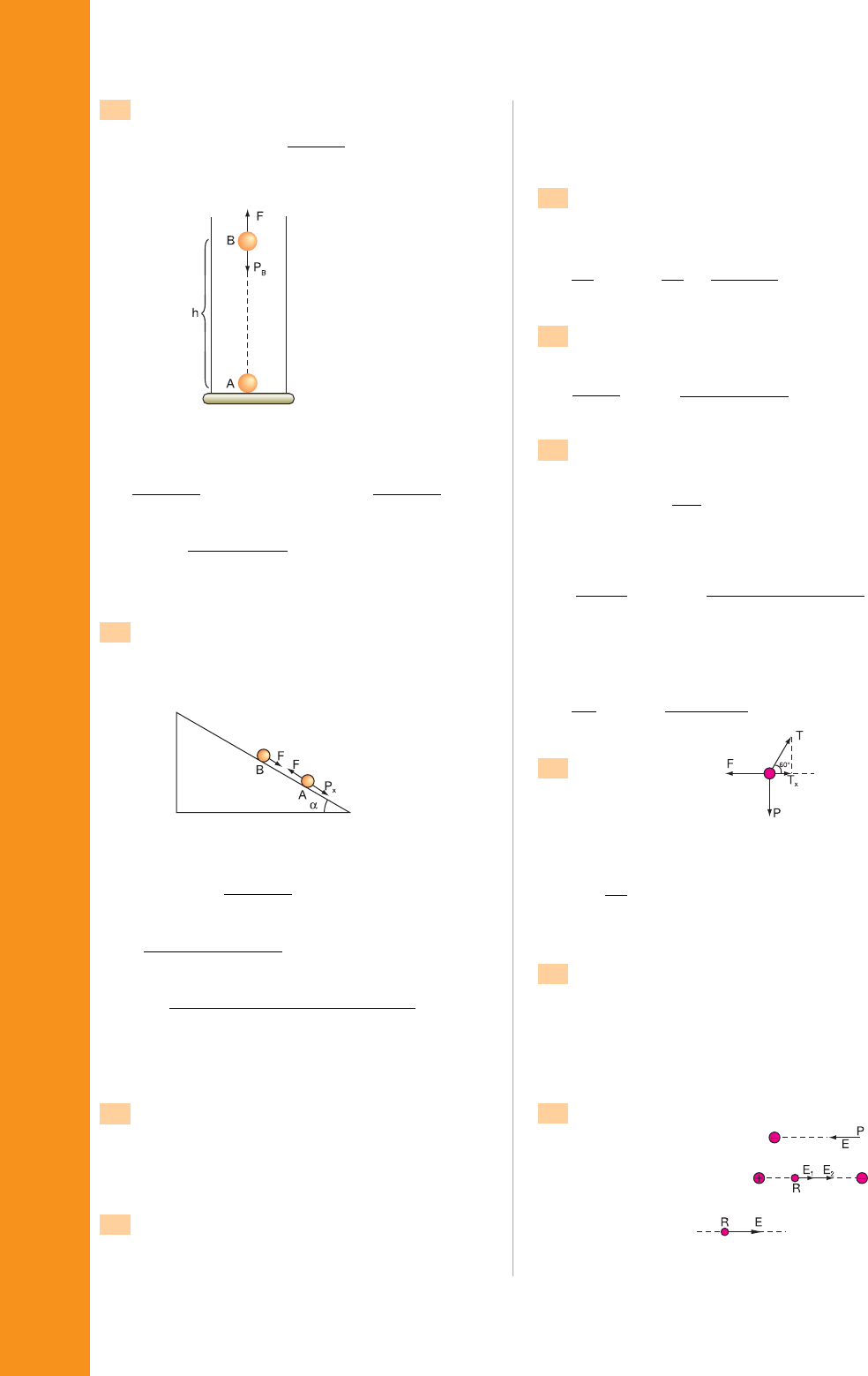 <p>236 RESOLUÇÃO</p><p>SIM</p><p>ULA</p><p>DÃO</p><p>: RE</p><p>SOL</p><p>UÇÃ</p><p>O</p><p>SIM</p><p>ULA</p><p>DÃO</p><p>: RE</p><p>SOL</p><p>UÇÃ</p><p>O</p><p>632 Dados: mA � mB � 1,0 � 10�4 kg; qA � qB � �4 � 10�8 C;</p><p>g � 10,0 m/s2; k0 � 9 � 109</p><p>N m</p><p>C</p><p>� 2</p><p>2</p><p>Representando a situação, temos:</p><p>Estando a esfera B em equilíbrio:</p><p>�F � 0 → F � PB</p><p>k0 �</p><p>Q Q</p><p>d</p><p>A B</p><p>A B</p><p>�</p><p>,</p><p>2</p><p>� mB � g → h2 � k0 �</p><p>Q Q</p><p>m g</p><p>A B</p><p>B</p><p>�</p><p>�</p><p>h2 � 9 � 109</p><p>( )4 10</p><p>1 10 10</p><p>8 2</p><p>4 1</p><p>�</p><p>� �</p><p>�</p><p>�</p><p>→ h2 � 144 � 10�4</p><p>h � 12 � 10�2 m � 0,12 m</p><p>633 Dados: mA � 50 g � 5 � 10�2 kg; mB � 100 g �</p><p>� 10�1 kg; � � 30°; d � 30 cm � 3 � 10�1 m; qA � qB</p><p>Para que a esfera A possa ficar em equilíbrio, os sinais</p><p>das cargas fornecidas às esferas deverão ser opostos.</p><p>Desta forma, a força de atração entre as esferas é igua-</p><p>lada pela projeção da força peso, logo:</p><p>F � PxA ⇒ k0 �</p><p>Q Q</p><p>d</p><p>A B�</p><p>2 � mA � g � sen �</p><p>Q2 �</p><p>d m g sen</p><p>k</p><p>A</p><p>2</p><p>0</p><p>� � � �</p><p>→</p><p>→ Q2 �</p><p>( )3 10 5 10 10 5 10</p><p>9 10</p><p>1 2 2 1 1</p><p>9</p><p>� � � � � �</p><p>�</p><p>� � �</p><p>Q2 � 25 � 10�13 � 2,5 � 10�12</p><p>Q � 1,6 �C</p><p>634 Alternativa c.</p><p>Dados: q � 5 �C � 5 � 10�6 C; F � 4 � 10�3 N</p><p>F � q � E → 4 � 10�3 � 5 � � 10�6 E</p><p>E � 800 N/C ou E � 0,8 k � N/C</p><p>635 Alternativa d.</p><p>Dados: m � 1 � 10�5 kg; q � 2 �C � 2 � 10�6 C; g �</p><p>� 10 m/s2</p><p>F � P → q � E � m � g</p><p>2 � 10�6 E � 1 � 10�5 � 10</p><p>E � 50 V/m</p><p>636 Alternativa c.</p><p>Dados F � 4,0 mN � 4,0 � 10�3 N; E � 2,0 k N/C �</p><p>� 2,0 � 103 N/C</p><p>E �</p><p>F</p><p>q</p><p>→ q �</p><p>F</p><p>E</p><p>�</p><p>4 10</p><p>2 10</p><p>3</p><p>3</p><p>�</p><p>�</p><p>�</p><p>� 2 � 10�6 ou 20 �C</p><p>637 Alternativa a.</p><p>Dados: Q � 6 �C � 6 � 10�6 C; d � 30 cm � 0,3 m</p><p>E �</p><p>k Q</p><p>d</p><p>0</p><p>2</p><p>�</p><p>→ E �</p><p>9 10 6 10</p><p>0 3</p><p>9 6</p><p>2</p><p>� � � �</p><p>( , )</p><p>→ E � 6 � 105 N/C</p><p>638 Alternativa d.</p><p>A intensidade do vetor campo elétrico em questão é</p><p>dada por E � k0 �</p><p>Q</p><p>d2</p><p>Assim, a quantidade de carga será:</p><p>Q �</p><p>E d</p><p>k</p><p>� 2</p><p>0</p><p>� Q �</p><p>3 2 10 3 10</p><p>9 10</p><p>4 2 2</p><p>9</p><p>, ( )� � �</p><p>�</p><p>�</p><p>Q � 3,2 � 10�9 C</p><p>Então, o excesso de prótons é:</p><p>n �</p><p>Q</p><p>e</p><p>→ n �</p><p>3 2 10</p><p>16 10</p><p>9</p><p>19</p><p>,</p><p>,</p><p>�</p><p>�</p><p>�</p><p>�</p><p>� n � 2 � 1010 prótons</p><p>639 Alternativa a.</p><p>Isolando as forças, temos:</p><p>F � q � E → F � 1 � 10�6 � 107 → F � 10 N</p><p>F � Tx → F � T � cos 60°</p><p>10 � T �</p><p>1</p><p>2</p><p>T � 20 N</p><p>640 a) O campo é mais intenso nos pontos em que as</p><p>linhas de campo são mais próximas, isto é, mais pró-</p><p>ximas da carga q1.</p><p>b) Como q1 e q2 são positivas (o campo é de afasta-</p><p>mento), o rpoduto q1 � q2 é positivo. Logo: q1 � q2 � 0.</p><p>641 08</p><p>01. Falsa, pois o campo em P</p><p>é de aproximação.</p><p>02. Falsa, pois ER � E1 � E2</p><p>04. Falsa, pois têm sentidos contrários.</p><p>08. Verdadeira, pois:</p><p>16. Falsa, pois têm o mesmo módulo, a mesma dire-</p><p>ção e sentidos opostos.</p>