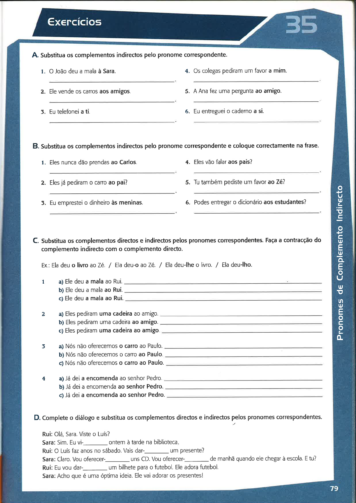 <p>A. Subst¡tua os complementos indirectos pelo pronome correspondente.</p><p>1. O João deu a mala à Sara. 4. Os colegas pediram um favor a mim.</p><p>2. Ele vende os carros aos amigos. 5. A Ana fez uma pergunta ao amigo.</p><p>3. Eu telefonei a ti. 6. Eu entreguei o caderno a si.</p><p>B. Substitua os complementos indirectos pelo pronome correspondente e coloque correctamente na frase.</p><p>1. Eles nunca dão prendas ao Carlos. 4. Eles vão falar aos pais?</p><p>2. Eles já pediram o carro ao pai? 5. Tu também pediste um favor aoZê?</p><p>3. Eu emprestei o dinheiro às meninas. 6. Podes entregar o dicionário aos estudantes?</p><p>C. Substitua os complementos directos e indirectos pelos pronomes cotrespondentes. Faça a contracção do</p><p>complemento indirecto com o</p><p>Ex.: Ela deu o livro aoZé. / Ela</p><p>r a) Ele deu a mala ao Rui.</p><p>b) Ele deu a mala ao Rui.</p><p>c¡ Ele deu a mala ao Rui.</p><p>complemento directo.</p><p>deu-o ao Zé.. / Ela deu-lhe o livro. / Ela deu-lho.</p><p>2 a) Eles pediram uma cadeira ao amigo.</p><p>b) Eles pediram uma cadeira ao amigo.</p><p>c) Eles pediram uma cadeira ao amigo.</p><p>3 a) Nós não oferecemos o carro ao Paulo.</p><p>b) Nós não oferecemos o carro ao Paulo.</p><p>c) Nós não oferecemos o carro ao Paulo.</p><p>4 a) Já dei a encomenda ao senhor Pedro.</p><p>b) Já dei a encomenda ao senhor Pedro.</p><p>c) Já dei a encomenda ao senhor Pedro.</p><p>D. Complete o diálogo e substitua os complementos directos e indirectos pelos pronomes correspondentes.</p><p>Rui: Olá, Sara. Viste o Luís?</p><p>Sara: Sim. Eu vi--ontem à tarde na biblioteca</p><p>Rui: O Luís faz anos no sábado. Vais dar-- um presente?</p><p>Sara: Claro. Vou oferecer-- uns CD. Vou oferecer-- de manhã quando ele chegar à escola. E tu?</p><p>Rui: Eu vou dar-- um bilhete para o futebol. Ele adora futebol.</p><p>Sara: Acho que é uma óptima ideia. Ele vai adorar os presentesl</p><p>o</p><p>+¿</p><p>U</p><p>u,</p><p>.=</p><p>E'</p><p>;</p><p>+J</p><p>Ê,</p><p>u,</p><p>E</p><p>lg</p><p>CL</p><p>E</p><p>o</p><p>U</p><p>u,</p><p>E'</p><p>Uì</p><p>u,</p><p>E</p><p>oc</p><p>o</p><p>L</p><p>fL</p><p>Adjectivos Concondåncia em Género G</p><p>Número Com o Nome</p><p>bom -+ bons</p><p>feliz -+ felizes</p><p>r NTRODUçAO</p><p>Vítor: Aquele carro velho é teu?</p><p>Luís: Não. O meu carro é novo e preto.</p><p>APReSENTAçAO</p><p>ato ata</p><p>bonito bonita</p><p>elegante</p><p>inteligente</p><p>grande</p><p>diffcil</p><p>bom boa</p><p>mau má</p><p>fácil -+ fáceis</p><p>falador -+ faladores</p><p>. O rapaz simpático e alto chama-se Bernardo.</p><p>Concordância em género</p><p>A maioria dos adjectivos tem uma forma para o masculino e outra</p><p>para o feminino (biformes) e concorda com o nome:</p><p>r O rcpaz alto / a rapariga alta</p><p>, O casaco bonito / a saia bonita</p><p>Há alguns adjectivos que têm a mesma forma para o masculino e</p><p>para o femìnìno (uniformes):</p><p>, O homem elegante / a mulher elegante</p><p>r O rapaz inteligente / a rapariga inteligente</p><p>¡ O carro grande / a casa grande</p><p>¡ O teste diticil / a canção difícil</p><p>Há adjectivos que têm formação irregular em género:</p><p>rOrapazbom/asopaboa</p><p>¡ O café mau / a menina má</p><p>Concordäncia em número</p><p>O adjectivo concorda em número com o nome que caracteriza. Para formar o plural, juntamos em geral um -s</p><p>no final da palavra.</p><p>, O livro bonito / os livros bonitos</p><p>¡ A casa bonita / as casas bonitas</p><p>Quando o adjectivo caracteriza vários nomes no singular, toma a forma do plural:</p><p>, O carro e o livro bonitos</p><p>' A cadeira e a mesa bonitas</p><p>Em alguns casos, a formação do plural é irregular.</p><p>Os adjectivos colocam-se geralmente depois do nome e têm um valor objectivo: O rapaz simpótico é o João.</p><p>Quando colocamos alguns adjectivos antes do nome (grande, bom, mau, etc.), estes adquiiem um valor sub-</p><p>jectivo: Ele tem uma grønde casa. (A casa é boa e grande.)</p><p>Também colocamos os adjectivos depois dos verbos ser, estar ou ficor: Ele</p><p>ficou mogro.</p><p>Concordância em género e número</p><p>é mogro / ele estó mogro / ele</p><p>Quando o adjectivo caracteriza vários nomes no singular de géneros diferentes, o adjectivo toma a forma de</p><p>masculino plural:</p><p>r O rapaze a rapariga altos</p><p>,Acasaeocarronovos</p><p>IU</p><p>Ê</p><p>oz</p><p>o</p><p>E</p><p>o</p><p>U</p><p>o</p><p>L</p><p>IU</p><p>E\=</p><p>z</p><p>IU</p><p>oL</p><p>IUc\u,</p><p>u,</p><p>c</p><p>IU</p><p>A. Faça a concordância do adjectivo com o nome de acordo com as imagens.</p><p>1. O João é</p><p>o Pedro é</p><p>5. A sopa está</p><p>mas a Rita é e o sumo está</p><p>murto</p><p>6 O diabinho é</p><p>mas a casa mas o anjinho é</p><p>branca é</p><p>B. Complete os espaços com a forma do adjectivo correcta. Use os adjectivos do quadro.</p><p>granide / pequen'ri.facil / quentes,¡ bon-l ,i elegante,,'tm=tc / sirr¡pátiaa= /</p><p>y' novo / alegre / cansado</p><p>1. Os cafés da Ana e da Teresa estão muito</p><p>2. A sala de aula é</p><p>3. O meu carro é muito</p><p>4. O exercício é</p><p>5. A Susana é uma mulher</p><p>ó. O Pedro é um rapaz mas hoje está</p><p>7. A Susana é uma mulher</p><p>8. As minhas colegas são</p><p>9. O bolo de chocolate é muito</p><p>10. Ele trabalha muito. Hoje ele está</p><p>C. coloque os adjectivos com o significado contrário.</p><p>l. OJoão é simpático, mas elas são</p><p>2. A Paula está alegre, mas eles estão</p><p>3. A minha casa é nova e grande, mas a tua casa é</p><p>4. Este exercício é difícil, mas o outro é</p><p>5. O meu dìcionário é mau, mas o teu é muito</p><p>ó. Esta sopa está quente. A tua sopa está</p><p>7. O Raul é um rapaz muito calado, mas a namorada é</p><p>2.AAnaé</p><p>+. O bolo e o café são muito 5. As casas amarelas são</p><p>8. Eles estão muito felìzes, mas nós estamos</p><p>Adjectivos c Advérbi