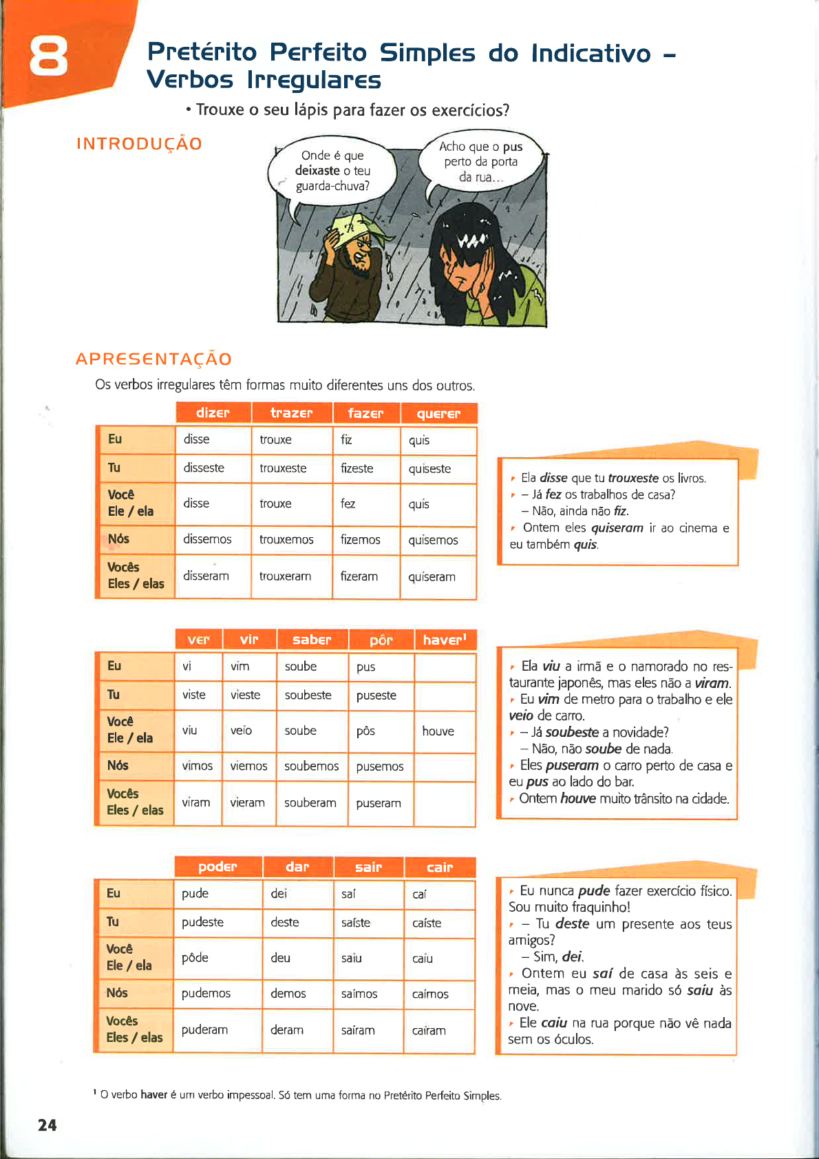 <p>Preténito Perfeito Simples do lndicativo</p><p>Verbos lrregulares</p><p>. Trouxe o seu lápis para fazer os exercícios?</p><p>TNTRODUÇAO</p><p>APR€5ENTAÇAO</p><p>Os verbos irregulares têm formas muito diferentes uns dos outros.</p><p>Eu disse trouxe Íz qurs</p><p>Tu disseste trouxeste fizeste qu seste</p><p>Você</p><p>Ele / ela</p><p>disse trouxe fez quts</p><p>Nós dissemos trouxemos fizemos qursemos</p><p>Vocês</p><p>Eles / elas</p><p>disseram trouxeram fizeram qurseram</p><p>Eu vlm soube pus</p><p>Tu viste vreste soubeste PUSeste</p><p>Você</p><p>Ele / ela</p><p>VU vero soube PôS houve</p><p>Nós V MOS vtemoS soubemos PUSemOS</p><p>Vocês</p><p>Eles / elas</p><p>vtram veram souberam puseram</p><p>¡ Ela drsse que tu trouxesfe os livros.</p><p>r - )á fez os trabalhos de casa?</p><p>- Não, ainda não fiz.</p><p>¡ Ontem eles quiserom ir ao cinema e</p><p>eu também guris.</p><p>¡ Ela viu a irmã e o namorado no res-</p><p>taurante japonês, mas eles não a virom.</p><p>> Eu vim de metro para o trabalho e ele</p><p>yelo de cano.</p><p>¡ - Já souáeste a novidade?</p><p>- Não, não souáe de nada.</p><p>, Eles puserom o carro perto de casa e</p><p>eu pus ao lado do bar.</p><p>¡ Ontem houve muito trânsito na cidade.</p><p>Eu pude de sar car</p><p>lu pudeste deste saíste caíste</p><p>Você</p><p>Ele / ela</p><p>pôde deu sau catu</p><p>Nós pudemos demos sarmos catmos</p><p>Vocês</p><p>Eles / elas</p><p>puderam deram sarram carram</p><p>¡ Eu nunca pude fazer exercício físico.</p><p>Sou muito fraquinho!</p><p>¡ - Tu desfe um presente aos teus</p><p>amigos?</p><p>- Sim, dei.</p><p>¡ Ontem eu soí de casa às seis e</p><p>meìa, mas o meu marido só solu às</p><p>nove.</p><p>, Ele coiu na rua porque não vê nada</p><p>sem os óculos.</p><p>Acho que o pus</p><p>perto da portaOnde é que</p><p>deixaste o teu</p><p>guarda-chuva?</p><p>dize¡ tnaze¡ Íaze¡ qu€F€r</p><p>vlF saber haverl</p><p>poden dan Satr catr</p><p>24</p><p>I O verbo haver é um verbo impessoal. Só tem uma forma no Pretérito Perfe¡to Simples.</p><p>n</p><p>r¡,</p><p>L</p><p>f0</p><p>=En</p><p>u,</p><p>L</p><p>É</p><p>t¡</p><p>oft</p><p>L</p><p>u,</p><p>I</p><p>o</p><p>+t</p><p>fo</p><p>.9tt</p><p>E</p><p>oI,</p><p>Uì</p><p>u,</p><p>E.</p><p>.E</p><p>u</p><p>ot-</p><p>IUq-</p><p>L</p><p>tU</p><p>0.</p><p>o</p><p>?-</p><p>L\lu</p><p>+.</p><p>IU</p><p>L</p><p>0,</p><p>A. Responda às perguntas utilizando o Pretérito Perfeito Simples dos verbos dizer, trozer e fozer.</p><p>(tu) Fizeste o bolo? (eu) Fiz. / (vocês) Trouxeram os livros? (nós) Trouxemos. / (nós) Dissemos tudo?</p><p>(vocês) Disseram.</p><p>1. Disseste a verdade à Ana?</p><p>2. Trouxemos os presentes para todos?</p><p>5. Fizeram as compras no centro comercial novo?</p><p>4. Trouxeste a tua mala do aeroporto?</p><p>5. Dissemos para ele entrar na sala?</p><p>ó. Fizeste exercício físico ontem?</p><p>7. Trouxeram os vossos amigos para a festa?</p><p>8. Fizemos alguma coisa errada?</p><p>B. Complete as frases com o Pretérito Perfeito Simples dos verbos querer, ver, vir, dor e hover.</p><p>um filme muito interessante.1. Ontem o Rui</p><p>2. Eu nunca</p><p>5. Ontem</p><p>4. No ano passado tu</p><p>5. Ontem</p><p>Lfu sober</p><p>2. On\em hover</p><p>5. Anteontem nós coir .</p><p>4. Eu não poder</p><p>5. Eles vir</p><p>ir ao cinema. Ele</p><p>essa peça de teatro, mas a minha amiga Luísa já</p><p>uma festa na minha casa. Os meus amigos</p><p>um presente muito bonito à Ana.</p><p>muitos alunos na sala de aula.</p><p>todos.</p><p>ó. Eles conhecer a cidade de Lisboa e, por isso, um passeio a pé.</p><p>C. Complete as frases no Pretérito Perfeito Simples e conte a história.</p><p>Ontem à noite o Rui (chegar) a casa cansado. Ele foi para a cozinha e (fazer) o jantar.</p><p>Depois, ele (pôr) a mesa e (antar) na sala.</p><p>Depois de jantar, ele (ver) televisão. Ele (estar) sentado no sofá da sala até o filme</p><p>acabar.</p><p>Ele (querer) dormir, mas não (poder).</p><p>Ele (sai) de casa à meia-noite e (ir) a uma farmácia comprar um remédio para dormir.</p><p>D, tigue as duas colunas, colocando os verbos no tempo correcto.</p><p>. na nossa rua.</p><p>. o que ocontecer à Paula?</p><p>. ir à festa porque fi'cor doente.</p><p>. um problema na minha rua.</p><p>. a Lisboa na semana passada.</p><p>C. Escreva as frases anteriores no Pretérito Perfeito Simples.</p><p>l.</p><p>2.</p><p>3.</p><p>4.</p><p>5.</p><p>Pretérito lmperfeito do lndicativo</p><p>Verbos Regular€s G lrregulares</p><p>. Podia dizer-me que horas são, por favor?</p><p>TNTRODUÇAO</p><p>A: Born dia. Podia dizer-me que horas são?</p><p>B: Com certeza. São dez e meia.</p><p>APR€s€NTAçAO</p><p>Os verbos regulares do lmperfeito do lndicativo formam-se através do radical do verbo</p><p>(folar / beber / porti) + a term¡nação regular para cada pessoa. No pretérito</p><p>lmperfeito, os verbos irregulares são diferentes dos verbos irregulares do pretérito</p><p>Perfeito Simples. Os verbos fozer, trozer, dizer, etc., que no Pretérito PerJeito Simples</p><p>são irregulares, no Pretérito lmperfeito são regulares. A 2.a e a 3.a conjugações (-er e -rr)</p><p>têm uma formacão igual.</p><p>Verbos r€gulares</p><p>Eu falava inglês</p><p>Tu moravas em Londres.</p><p>Você</p><p>Ele / ela</p><p>estudava em Lisboa.</p><p>Nós estávamos no hospital.</p><p>Vocês</p><p>Eles / elas</p><p>andavam no jardim.</p><p>quena UM SUMO.</p><p>comlaS um bolo.</p><p>fazia um bolo.</p><p>trazíamos o livro.</p><p>diziam a verdade,</p><p>Eu era t nha v nha punha</p><p>Tu eras tinhas vinhas punhas</p><p>Você</p><p>Ele / ela</p><p>era t nha vinha punha</p><p>Nós eramos tínhamos vínhamos púnhamos</p><p>Vocês</p><p>Eles / elas</p><p>eram tinham vinham punham</p><p>AP LrCAçAO</p><p>Usamos o Pretérito lmperfeito do lndicativo como forma de cortesia para fazer pedidos, exprimir desejos ou</p><p>preferência. Nestes casos usamos os verbos querer, gostor de, p
