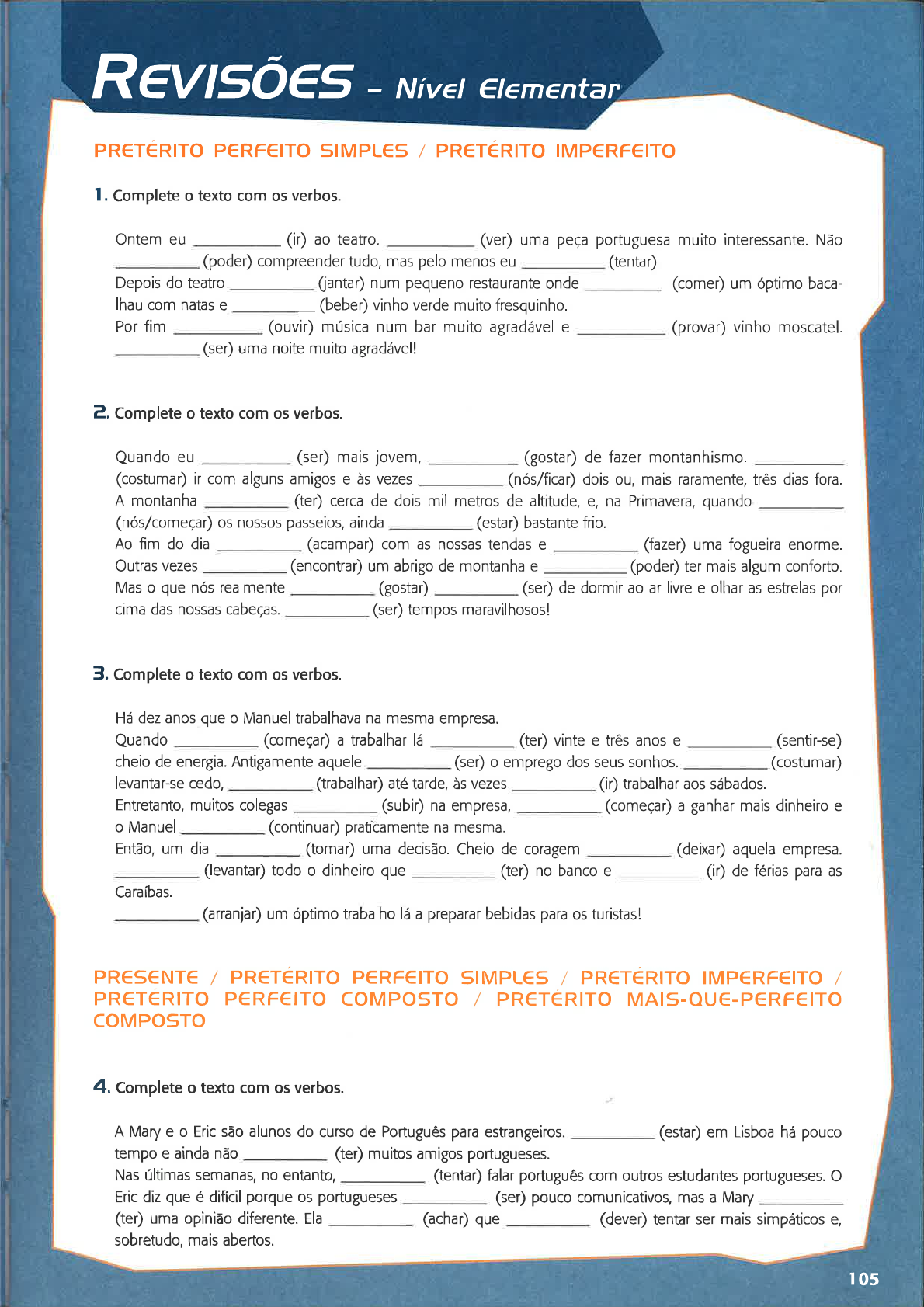 <p>Rgvsoes Nívet Etementar</p><p>t05</p><p>pRET€Rrro p€RFerro srMpLes / pnerÉRtro tMp€RF€tro</p><p>l. Complete o texto com os verbos.</p><p>Ontem eu (ir) ao teatro. (ver) uma peÇa portuguesa muito interessante. Não</p><p>(poder) compreender tudo, mas pelo menos eu (tentar).</p><p>Depois do teatro (antar) num pequeno restaurante onde _ (comer) um óptimo baca-</p><p>lhau com natas e _ (beber) vinho verde muito fresquinho.</p><p>Por fim (ouvir) música num bar muito agradável e (provar) vinho moscatel.</p><p>(ser) uma noite muito agradável!</p><p>?, Complete o texto com os verbos.</p><p>Quando eu (ser) mais jovem, (gostar) de fazer montanhismo.</p><p>(costumar) ir com alguns amigos e às vezes (nósfiicar) dois ou, mais raramente, três dias fora.</p><p>A montanha (ter) cerca de dois mil metros de altitude, e, na Primavera, quando</p><p>(nós/começar) os nossos passeios, ainda (estar) bastante frio.</p><p>Ao fim do dia (acampar) com as nossas tendas e (fazer) uma fogueira enorme.</p><p>Outras vezes (encontrar) um abrigo de montanha e (poder) ter mais algum conforto.</p><p>Mas o que nós realmente (gostar) (ser) de dormir ao ar livre e olhar as estrelas por</p><p>cima das nossas cabeças. (ser) tempos maravilhosos!</p><p>3. Complete o texto com os verbos.</p><p>Há dez anos que o Manuel trabalhava na mesma empresa.</p><p>Quando (começar) a trabalhar lá (ter) vinte e três anos e (sentir-se)</p><p>cheio de energia. Antigamente aquele (ser) o emprego dos seus sonhos. (costumar)</p><p>levantar-se cedo, (trabalhar) até tarde, às vezes (ir) trabalhar aos sábados.</p><p>Entretanto, muitos colegas (subir) na empresa, (começar) a ganhar mais dinheiro e</p><p>o Manuel (continuar) praflcamente na mesma.</p><p>Então, um dia (tomar) uma decisão. Cheio de coragem (deixa) aquela empresa.</p><p>(levantar) todo o dinheiro que (ter) no banco e (ir) de férias para as</p><p>Caraíbas.</p><p>(arranjar) um óptimo trabalho lá a preparar bebidas para os turistas!</p><p>PRES€NTE / PR€TERITO PERFEITO SIMPL€S / PRETERITO IMP€RFEÏO /</p><p>PR€TERITO PERF€ITO COMPOSTO / PR€TÉRITO MAIS.OU€.P€RF€ITO</p><p>COMPOSTO</p><p>4. Complete o texto com os verbos.</p><p>A Mary e o Eric são alunos do curso de Português para estrangeiros. (estar) em Lisboa há pouco</p><p>tempo e ainda não (ter) muitos amigos portugueses.</p><p>Nas últimas semanas, no entanto, (tentar) falar português com outros estudantes portugueses. O</p><p>Eric diz que é difícil porque os portugueses (ser) pouco comunicativos, mas a Mary</p><p>(ter) uma opìnião diferente. Ela (achar) que (dever) tentar ser mais simpáticos e,</p><p>sobretudo, mais abertos.</p><p>Rgvsoes Nívet êtementar</p><p>r06</p><p>Ontem a Mary (decidir) fazer um jantar em casa dela e (convidar) os colegas do</p><p>curso e alguns portugueses. Entre todos, (combinar) levar comida típica de cada país.</p><p>(ser) um sucesso.</p><p>Os portugueses, por exemplo,. nunca (comer) comida japonesa, nem sueca. Os holandeses</p><p>nunca (provar) bacalhau, nem rissóis de camarão. Nas últimas semanas só (comer)</p><p>na cantina e a comida lá nem sempre é boa, nem muito variada.</p><p>Pela primeira vez, os colegas chineses (beber) vinho. Eles nunca (beber) antes,</p><p>mas o Eric já (provar) e disse que (gostar) muito.</p><p>Para sobremesa (comer) um magnífico pão-de-ló que a mãe da Joana, uma amiga portuguesa,</p><p>(fazer) Nenhum deles (provar) antes, mas todos (gostar) imenso. No</p><p>fim, (ouvir) música de vários países, (rir) muito e até (tentar) contar</p><p>anedotas. (ser) uma noite divertidíssimal</p><p>Afinal não é assim tão difícil fazer amigos!</p><p>PRETÉRITO P€RF€ITO SIMPL€S / PRETERITO IMPERF€ITO / PR€T€RITO</p><p>MAIS-OU€-PERFEITO COMPOSTO</p><p>5. Complete o texto com os verbos.</p><p>Na semana passada, o André e a Natália (combinar) encontrar-se no Centro Cultural de Belém às</p><p>três horas da tarde. Eles (querer) ver uma exposição e (pensar) sentar-se depois na</p><p>cafetaria a conversar agradavelmente o resto da tarde. Se calhar até (poder) ir ao cinema mais</p><p>tarde.</p><p>No entanto, as coisas não (correr) tão bem como eles (planear). Nesse dia</p><p>(pedir) boleia à mãe e, quando(haver) greve de transportes. A Natália</p><p>(chegar) ao Centro, (passar) apenas alguns minutos das três, mas o André ainda</p><p>não (chegar).</p><p>EIa (esperar) uma hora e... nada. lnfelizmente (esquecer-se) do</p><p>casa e não (poder) contactar o amigo, nem telefonar à mãe para a ir buscar.</p><p>(resolver) andar a pé junto do rio e depois (ir) comer uns pastéis de Belém.</p><p>telemóvel em</p><p>PRET€RITO P€RFEITO SIMPL€S / PRET€RITO IMPCRFEITO / PR€TERITO</p><p>P€RF€ITO COMPOSTO / PR€TéRITO MAIS-OUE.P€RF€ITO COMPOSTO /</p><p>colocAçAo DoS PRONOM€S D€ COMPL€MGNTO DIR€CTO € INDIR€CTO</p><p>6. Complete o texto com os verbos.</p><p>Ontem eu (ir) à Baixa para comprar uns sapatos que (ver) na semana passada</p><p>numa sapataria. Eu (entrar), (experimentar) os sapatos e (comprar os</p><p>sapatos).</p><p>(sair) da sapataria e (apanhar) o metro para casa. Quando (iÙ a</p><p>sair do metro, (reparar) que um rapaz (estar) a olhar para mim e a rir-se. Eu</p><p>(pensar): - (eu/ficar) envergonhada e (lembrar-se) que</p><p>(encontrar o Afonso) numa festa há cerca de um mês. Nessa altura (nós/combinar) sair um dia e</p><p>eu (esquecer-se) completamente. Que cabeça a minhal Acho que (andar a dormir)</p><p>pouco ultimamente!</p><p>FUTURO IMP€RF€ITO DO INDICATIVO</p><p>7. Complete o texto com os verbos.</p><p>Na próxima semana eu e os meus amigos (visitar) o cabo da Roca. (apanhar) o</p><p>autocarro para lá e depois (regressar) de comboio. (fazer) um piquenique na serra.</p><p>Uns (trazer) frango assado, outros fruta e eu (fazer) um bolo enorme para todos.</p><p>Depois do almoço (tomar) um café no bar do Moinho. Daí (poder) tirar fotografias</p><p>mag