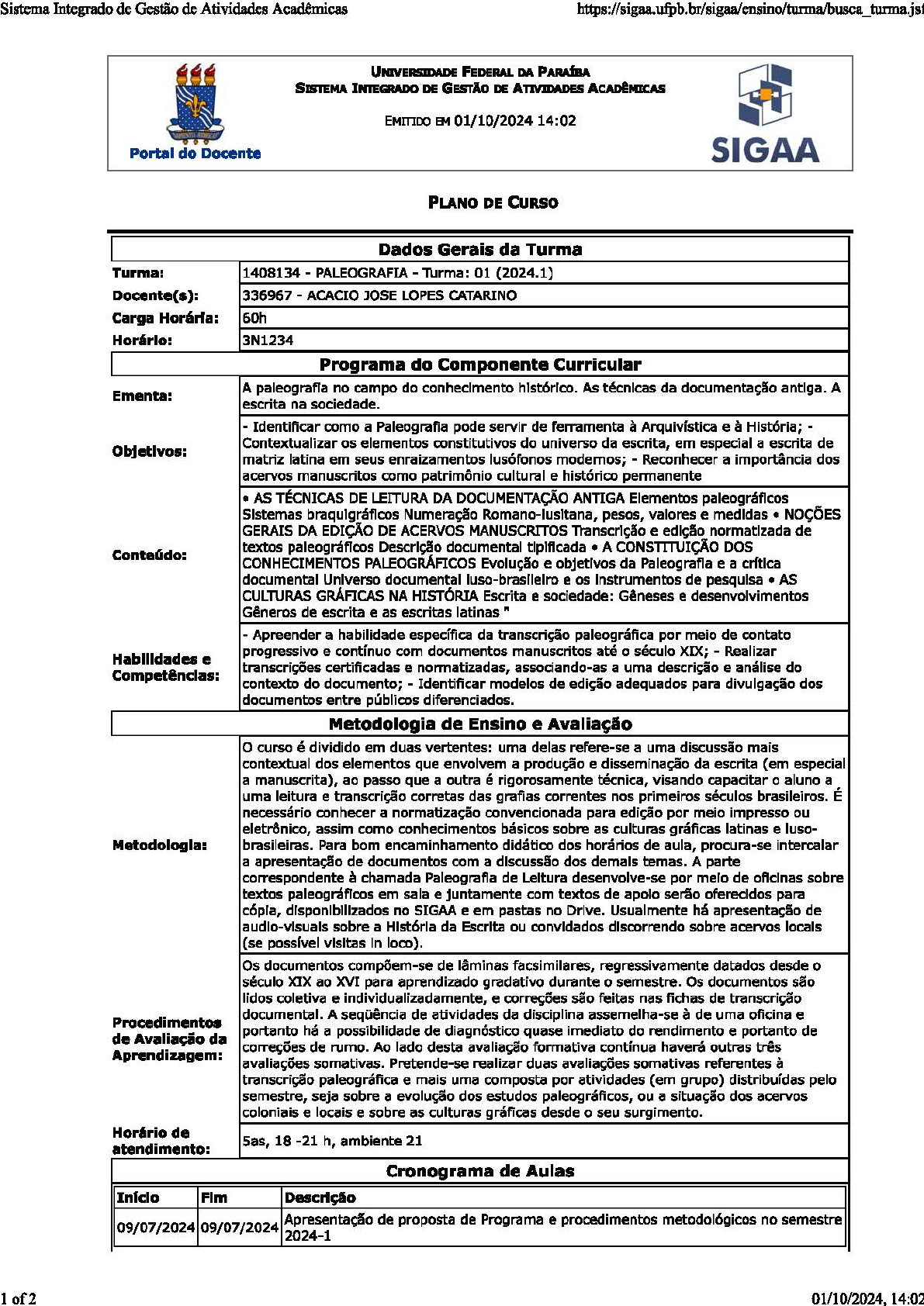 <p>Sistema Integrado de Gestão de Atividades Acadêmicas https://sigaa.ufpb.br/sigaa/ensino/turma/busca _ turma.jsf</p><p>EMmOO EM 01/10/2024 14:02 ~</p><p>SIGAA I</p><p>UNIVERSIDADE FEDERAL DA. PAAAfBA</p><p>SISIEMA INIEGRADO DE GESTlo DE A11VIDJ1U)ES ACADIMI'CAS</p><p>Portal do Docente</p><p>PLANO DE CURSO</p><p>Dados Gerais da Turma</p><p>Turma: 1408134- PALEOGRAFIA -1\Jrma: 01 (2024.1)</p><p>Docente(s): 336967- ACACIO JOSE LOPES CATARINO</p><p>Carga Hor6rfa: 60h</p><p>Horirlo: 3N1234</p><p>Programa do Componente Curricular</p><p>Ementa: A paleografla no campo do conhecimento histórico. As técnicas da documentação antiga. A</p><p>escrita na sociedade.</p><p>- Identificar como a Paleografia pode servir de ferramenta à Arquivística e à História; -</p><p>Objetivos: Contextualizar os elementos constitutivos do universo da escrita, em especial a escrita de</p><p>matriz latina em seus enraizamentos lusófonos modernos;- Reconhecer a importância dos</p><p>acervos manuscritos como patrimônio cultural e histórico permanente</p><p>• AS TÉCNICAS DE LEITURA DA DOCUMENTAÇÃO ANTIGA Elementos paleográflcos</p><p>Sistemas braqulgráflcos Numeração Romano-lusitana, pesos, valores e medidas • NOÇÕES</p><p>GERAIS DA EDIÇÃO DE ACERVOS MANUSCRITOS Transcrição e edição normatizada de</p><p>Conteido: textos paleográflcos Descrição documental tlplftcada • A CONSTTTUIÇÃO DOS</p><p>CONHECIMENTOS PALEOGRÁFICOS Evolução e objetivos da Paleografla e a crftlca</p><p>documental Universo documental luso-brasileiro e os Instrumentos de pesquisa • AS</p><p>CULTIJRAS GRÁFICAS NA HISTÓRIA Escrita e sociedade: Gêneses e desenvolvimentos</p><p>Gêneros de escrita e as escritas latinas R</p><p>-Apreender a habilidade específica da transcrição paleográfica por meio de contato</p><p>Habilidades e progressivo e contínuo com documentos manuscritos até o século XIX; - Realizar</p><p>C:ompet8nclas: transcrições certificadas e normatizadas, associando-as a uma descrição e análise do</p><p>contexto do documento; -Identificar modelos de edição adequados para divulgação dos</p><p>documentos entre públicos diferenciados.</p><p>Metodologia de Ensino e Avaliaçlo</p><p>O curso é dividido em duas vertentes: uma delas refere-se a uma discussão mais</p><p>contextual dos elementos que envolvem a produção e disseminação da escrita (em especial</p><p>a manuscrita), ao passo que a outra é rigorosamente técnica, visando capacitar o aluno a</p><p>uma leitura e transcrição corretas das grafias correntes nos primeiros séculos brasileiros. É</p><p>necessário conhecer a normatização convencionada para edição por meio impresso ou</p><p>eletr6nico, assim como conhecimentos básicos sobre as culturas gráficas latinas e luso-</p><p>Metodologia: brasileiras. Para bom encaminhamento didático dos horários de aula, procura-se intercalar</p><p>a apresentaç5o de documentos com a dlscussllo dos demais temas. A parte</p><p>correspondente à chamada Paleografla de Leitura desenvolve-se por melo de oficinas sobre</p><p>textos paleográflcos em sala e juntamente com textos de apolo serão oferecidos para</p><p>cópia, disponibilizados no SIGAA e em pastas no Drlve. Usualmente há apresentação de</p><p>audio-visuais sobre a História da Escrita ou convidados discorrendo sobre acervos locais</p><p>(se possfvel visitas In loco).</p><p>Os documentos compõem-se de lâminas facsimilares, regressivamente datados desde o</p><p>século XIX ao XVI para aprendizado gradativo durante o semestre. Os documentos são</p><p>lidos coletiva e individualizadamente, e correções são feitas nas fichas de transcrição</p><p>Procedimentoe documental. A seqüência de atividades da disciplina assemelha-se à de uma oficina e</p><p>de Avaliação da portanto há a possibilidade de diagnóstico quase imediato do rendimento e portanto de</p><p>correções de rumo. Ao lado desta avaliação formativa contínua haverá outras três Aprendizagem:</p><p>avaliações somativas. Pretende-se realizar duas avaliações somativas referentes à</p><p>transcrição paleográfica e mais uma composta por atividades (em grupo) distribuídas pelo</p><p>semestre, seja sobre a evolução dos estudos paleográficos, ou a situação dos acervos</p><p>coloniais e locais e sobre as culturas gráficas desde o seu surgimento.</p><p>Hor6rio de Sas, 18 -21 h, ambiente 21 atendimento:</p><p>Cronograma de Aulas</p><p>In feio Fim Descrfçlo</p><p>09107/2024 09/07/2024</p><p>Apresentação de proposta de Programa e procedimentos metodológicos no semestre</p><p>2024-1</p><p>1 of2 01/10/2024, 14:02</p><p>Sistema Integrado de Gestão de Atividades Acadêmicas https://sigaa.ufpb.br/sigaalensino/turmalbusca_tunna.jsf</p><p>2of2</p><p>Dados Gerais da Turma</p><p>Início Fim Descrição</p><p>16/07/2024 16/07/2024 Leitura e transcrição de documentos</p><p>23/07/2024 23/07/2024 Elementos Paleográficos</p><p>30/07/2024 30/07/2024 Sistema Braquigráfico</p><p>06/08/2024 06/08/2024 Leitura e transcrição de documentos</p><p>13/08/2024 13/08/2024 Normas de edição e transcrição paleográficas</p><p>20/08/2024 20/08/2024 Leitura paleográfica, transcrição nas fichas</p><p>27/08/2024 27/08/2024 Etapas da Análise Paleográfica</p><p>03/09/2024 03/09/2024 Avaliação de Leitura e transcrição documental</p><p>10/09/2024 10/09/2024 Leitura de laminas do seculo XVII</p><p>17/09/2024 17/09/2024 Modulo 2</p><p>01/10/2024 01/10/2024 Administração colonial e dinâmica da escrita na América Portuguesa</p><p>08/10/2024 08/10/2024 Paleografia: percursos da disciplina entre História e Arquivologia</p><p>15/10/2024 15/10/2024 Acervos sobre a Colonia</p><p>22/10/2024 22/10/2024 As Culturas Gráficas</p><p>29/10/2024 29/10/2024 Culturas Populares e Escrita</p><p>Avaliações</p><p>Data Hora Descriçlio</p><p>20/08/2024 19:00 la. Avaliação</p><p>10/09/2024 19:00 2a. avaliação</p><p>01/10/2024 19:00 3a. Avaliação</p><p>08/10/2024 19:00 Rep