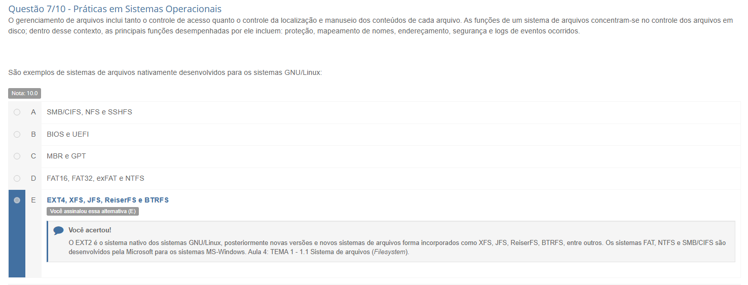 Questão 7/10 - Práticas em Sistemas Operacionais gerenciamento de arquivos inclui tanto controle de acesso quanto controle da localização e manuseio dos conteúdos de cada arquivo. As funções de um sistema de arquivos concentram-se no controle dos arquivos em disco; dentro desse contexto, as principais funções desempenhadas por ele incluem: mapeamento de nomes, endereçamento, segurança e logs de eventos ocorridos. São exemplos de sistemas de arquivos nativamente desenvolvidos para os sistemas GNU/Linux Nota: 10.0 A NFS e SSHFS B BIOS e UEFI C MBR e GPT D exFAT e NTFS E EXT4, XFS, JFS, ReiserFS e BTRFS Você assinalou essa alternativa (E) Você acertou! EXT2 é sistema nativo dos sistemas posteriormente novas versões e novos sistemas de arquivos forma incorporados como XFS, JFS, ReiserFS, BTRFS, entre Os sistemas FAT, NTFS e SMB/CIFS são desenvolvidos pela Microsoft para os sistemas MS-Windows Aula 4: TEMA 1 - 1.1 Sistema de arquivos