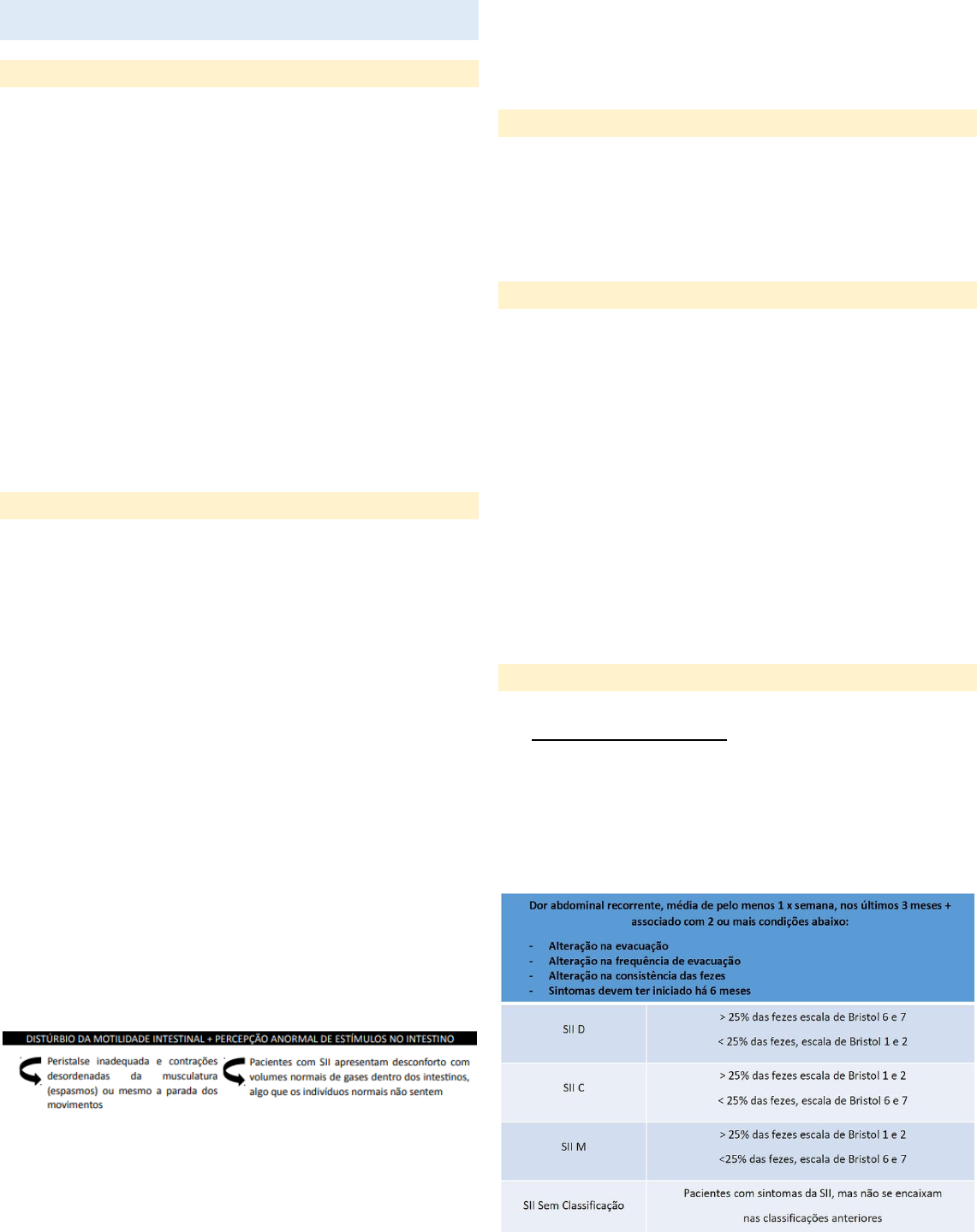 <p>Síndrome do Intestino Irritável e Intolerância à Lactose</p><p>Síndrome do Intestino Irritável (SII)</p><p>Definição e Epidemiologia</p><p>Distúrbio funcional crônico e recorrente do trato</p><p>digestivo para o qual não se demonstrou, até́́́́ o momento,</p><p>qualquer alteração metabólica, bioquímica ou estrutural da(s)</p><p>víscera(s) envolvida(s), expressando-se através da acentuação,</p><p>inibição ou simplesmente modificação da função intestinal.</p><p>Logo, é caracterizada por inflamação das vilosidades</p><p>intestinais, causando dor abdominal crônica e alteração do</p><p>hábito intestinal, na ausência de qualquer causa orgânica</p><p>Muitos pacientes com SII alternam diarreia com</p><p>constipação, podendo haver muco junto às fezes.</p><p>• Tem predomínio no sexo feminino (2:1);</p><p>• Mais comumente nos grupos etários mais jovens (14-44 anos);</p><p>• Índices de prevalência subestimados,</p><p>Fisiopatologia</p><p>Acredita-se que seja multifatorial, mas não é bem</p><p>elucidada.</p><p>• Comorbidades psiquiátricas</p><p>• Acredita-se que haja papel da microbiota intestinal –</p><p>importante para manutenção da imunidade inata e adquirida,</p><p>barreira integra, produção de muco</p><p>• Novos estudos reconheceram a relação entre os fenômenos</p><p>biológicos que ocorrem no sistema nervoso central (SNC) e</p><p>sistema nervoso entérico (SNE)</p><p>▪ Acredita-se que o SNC varia a percepção visceral de acordo</p><p>com o estado emocional e cognitivo→ ansiedade e o estresse</p><p>podem aumentar a percepção da dor ➔ Na SII há uma</p><p>percepção aumentada em todo o TGI</p><p>• Os fatores psicossociais, ambientais e genéticos também</p><p>parecem contribuir de maneira determinante para a expressão</p><p>dos sintomas</p><p>1) Movimentos do cólon↑ → bolo fecal impulsionado muito</p><p>rapidamente → absorção de fluido inadequada → fezes com</p><p>excesso de água → DIARREIA</p><p>2) Movimentos do cólon↓ → fezes em contato prolongado</p><p>com a parede intestinal → maior absorção de água → fezes</p><p>endurecidas e secas → CONSTIPAÇÃO INTESTINA</p><p>Classificação</p><p>• SII com constipação intestinal</p><p>• SII com diarreia</p><p>• SII mista</p><p>• SII de forma indeterminada</p><p>Quadro Clínico</p><p> Dor e desconforto abdominal, associados com alterações nas</p><p>fezes (PRINCIPAIS)</p><p> Constipação intestinal, diarreia ou alternância.</p><p> Sensação de estufamento e distensão abdominal</p><p>(fermentação de gases no cólon)</p><p> Sensação de evacuação incompleta</p><p> Evacuações noturnas</p><p> Urgência defecatória</p><p> Piora da dor após evacuação</p><p> Melhora da dor após eliminação dos gases</p><p> Mais de 2 evacuações entre as refeições</p><p>Diagnóstico</p><p>A) DIAGNÓSTICO CLÍNICO</p><p>❖ O diagnóstico da SII é essencialmente clínico devido a</p><p>inexistência de anormalidades físicas, laboratoriais,</p><p>radiológicas e endoscópicas</p><p>❖ Diagnóstico baseado nos Critérios de Roma III</p><p> Itens que reforçam o diagnóstico:</p><p>o Frequência alterada (>3x/dia ou</p><p>lopramida)</p><p>✓ Derivados da papaverina (cloridrato de mebeverina)</p><p>IV. Antidepressivos tricíclicos – São importantes</p><p>miorrelaxantes. NÃO devem ser prescritos para a</p><p>forma constipada da SII, podendo agravar o</p><p>quadro.</p><p>✓ Amitriptilina</p><p>V. Ansiolíticos: Usados quando houver uma relação</p><p>evidente entre os sintomas digestivos e estados de</p><p>tensão</p><p>VI. Probióticos – São alimentos funcionais que</p><p>recompõem qualitativamente o microbioma</p><p>intestinal e combatem o crescimento bacteriano</p><p>VII. Terapias alternativas como acupuntura e</p><p>homeopatia</p><p>Intolerância à Lactose</p><p>Definição</p><p>Intolerância a lactose: É a incapacidade parcial ou</p><p>total para metabolizar a lactose, que é um carboidrato</p><p>encontrado no leite e derivados. O problema ocorre devido a</p><p>deficiência da enzima lactase que, normalmente, é produzida</p><p>por células intestinais, e tem o papel de auxiliar na quebra da</p><p>lactose em duas formas mais simples, os monossacarídeos</p><p>glicose e galactose, sendo esses facilmente absorvidos.</p><p>Alergia a proteína do leite: APLV pode resultar de</p><p>mecanismos Imunoglobulina E (IgE)-mediados, no IgE-</p><p>mediados ou mistos. As formas mistas podem envolver</p><p>mecanismos IgE-mediados ou celulares, habitualmente tem um</p><p>início retardado ou crônico e incluem a gastroenteropatia e a</p><p>esofagite eosinofílica.</p><p>A APLV IgE-mediada associa-se a maior risco de</p><p>reações graves, maior risco de múltiplas alergias alimentares e</p><p>sensibilização a alérgenos inalantes no futuro.</p><p>Classificação e Epidemiologia</p><p>A) Congênita: forma mais rara de intolerância. Recém-</p><p>nascido não consegue ingerir nenhum tipo de lactose sem</p><p>apresentar sintomas.</p><p>B) Primária: forma mais comum da doença, podendo ocorrer</p><p>em qualquer idade.</p><p>* Diminuição na produção de lactase devido ao</p><p>desligamento do gene (diminuição da expressão do</p><p>gene). Há vários graus de intolerância</p><p>* Questão do quanto usa leite e derivados (proteína boa</p><p>e barata).</p><p>C) Secundária: é reversível se tratada a condição base. +</p><p>Doenças intestinais, infecções ou medicamentos. + Diarreia</p><p>(aguda ou crônica), retirando a lactase presente no</p><p>intestino. Por isso após episódios de diarreia é recomendo</p><p>cortar a lactose. + Reversível (tratar a condição base).</p><p>Cerca de 70-80% da população mundial tem algum grau de</p><p>intolerância, mas nem todos apresentam sintoma</p><p>gastrointestinal. É menos frequente em crianças, sendo que</p><p>elas têm maior expressão do gene. No Brasil maior prevalência</p><p>e