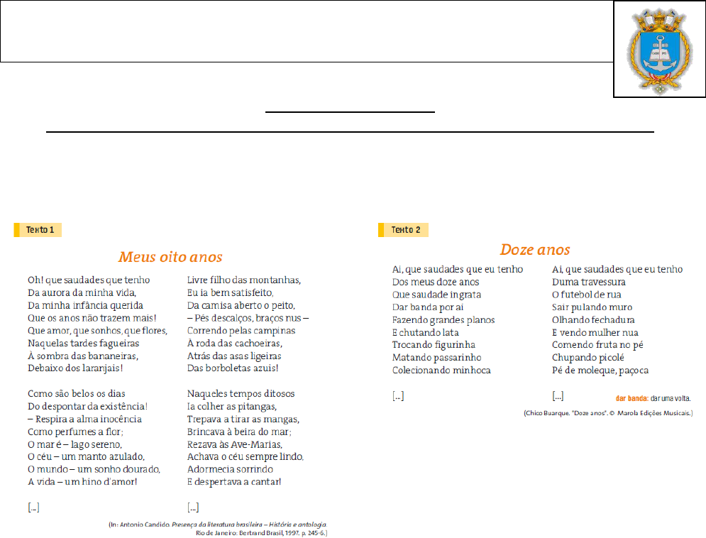 <p>COLÉGIO NAVAL</p><p>ALUNO:__________________________ - 2º ANO</p><p>PROFESSORA: SHIRLANE</p><p>LISTA DE EXERCÍCIOS</p><p>A poética de Álvares de Azevedo, Casimiro de Abreu e Fagundes Varela</p><p>Leia os textos e responda às questões de 01 a 04.</p><p>01) Na letra da canção “Doze anos”, Chico Buarque dialoga com o</p><p>poema “Meus oito anos”, de Casimiro de Abreu. Qual é o tema de</p><p>cada um dos textos?</p><p>02) No texto 1, o poeta romântico se refere a determinadas</p><p>experiências vivenciadas no período da infância.</p><p>a. De acordo com esse texto, as brincadeiras do eu lírico na</p><p>infância envolviam travessuras? Justifique sua resposta.</p><p>b. De que tipo era a relação do eu lírico com os elementos da</p><p>natureza? Justifique sua resposta com elementos do texto.</p><p>03) Releia estes versos:</p><p>Como são belos os dias</p><p>Do despontar da existência!</p><p>– Respira a alma inocência</p><p>Como perfumes a flor;</p><p>a. De acordo com esses versos, como o eu lírico, na vida adulta,</p><p>vê a sua infância?</p><p>b. Essa visão do eu lírico é objetiva ou é subjetiva e idealizada?</p><p>Justifique sua resposta com elementos do poema.</p><p>04) Na letra da canção “Meus doze anos”, Chico Buarque parodia o</p><p>poema “Meus oito anos”, isto é, ao dialogar com o texto de</p><p>Casimiro de Abreu, apresenta ideias diferentes da do autor</p><p>romântico, provocando humor.</p><p>a. De acordo com a primeira estrofe, a relação do eu lírico com os</p><p>elementos da natureza é semelhante à que tem o eu lírico do texto</p><p>romântico? Por quê?</p><p>b. Nesse texto, o eu lírico da canção, tal qual o do poema de</p><p>Casimiro de Abreu, valoriza a pureza e a ingenuidade? Justifique</p><p>sua resposta.</p><p>Leia os versos de Fagundes Varela e responda à questão 05.</p><p>Roem-me atrozes ideias,</p><p>A febre me queima as veias,</p><p>A vertigem me tortura!...</p><p>Oh! por Deus! quero dormir,</p><p>Deixem-me os braços abrir</p><p>Ao sono da sepultura!</p><p>Despem-se as matas frondosas,</p><p>Caem as flores mimosas</p><p>Da morte na palidez:</p><p>Tudo, tudo vai passando,</p><p>Mas eu pergunto chorando</p><p>— Quando virá minha vez?</p><p>05) Que aspecto da poesia de Fagundes Varela o texto evidencia?</p>