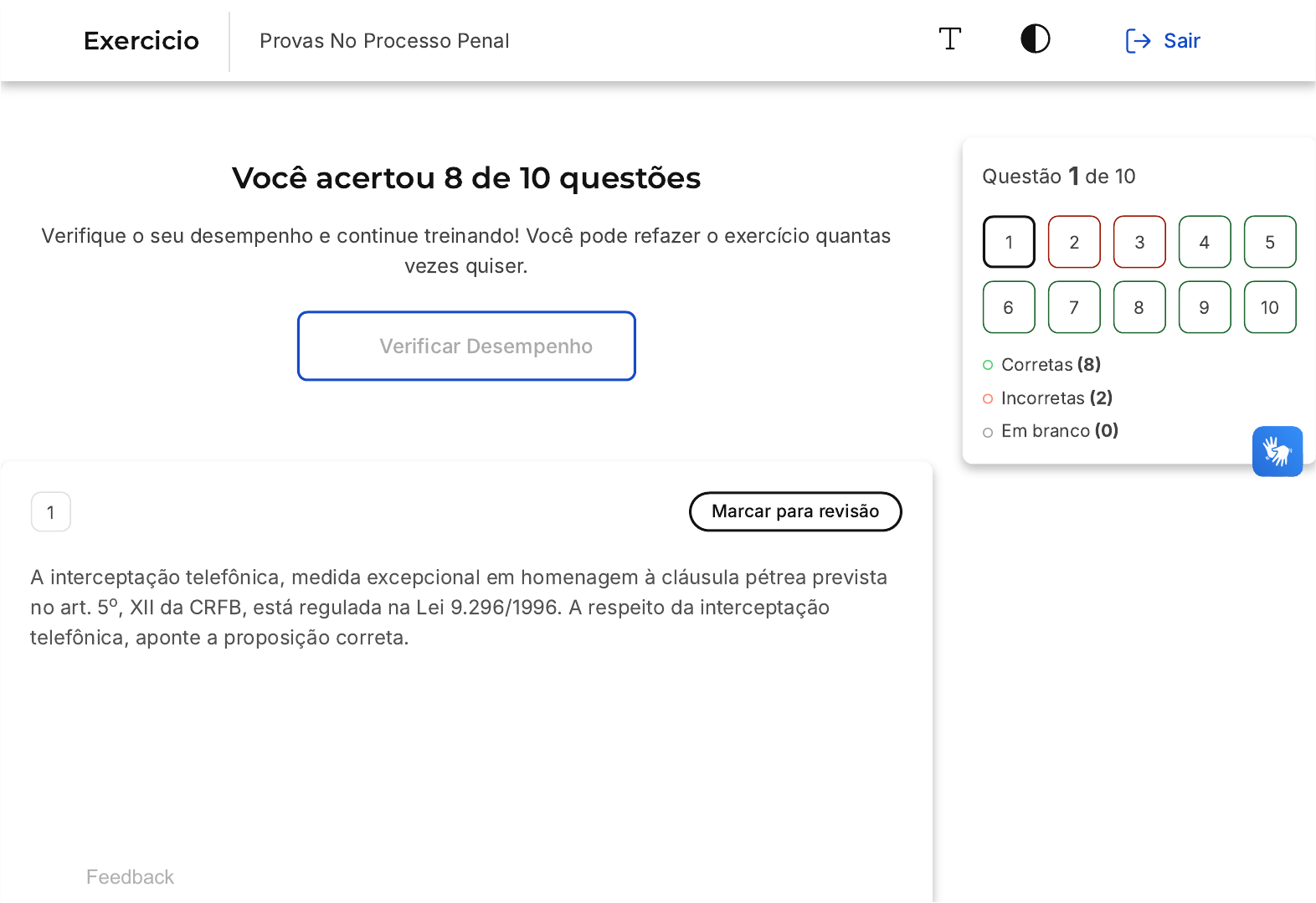 <p>Você acertou 8 de 10 questões</p><p>Verifique o seu desempenho e continue treinando! Você pode refazer o exercício quantas</p><p>vezes quiser.</p><p>Verificar Desempenho</p><p>1 Marcar para revisão</p><p>A interceptação telefônica, medida excepcional em homenagem à cláusula pétrea prevista</p><p>no art. 5 , XII da CRFB, está regulada na Lei 9.296/1996. A respeito da interceptação</p><p>telefônica, aponte a proposição correta.</p><p>o</p><p>Questão 1 de 10</p><p>Corretas �8�</p><p>Incorretas �2�</p><p>Em branco �0�</p><p>1 2 3 4 5</p><p>6 7 8 9 10</p><p>Feedback</p><p>Exercicio Provas No Processo Penal Sair</p><p>A</p><p>B</p><p>C</p><p>D</p><p>E</p><p>O STJ já fixou a tese de que não é legítima a prova obtida por meio de</p><p>interceptação telefônica para apuração de delito punido com detenção, ainda que</p><p>conexo com outro crime apenado com reclusão.</p><p>A atribuição para a execução de interceptação telefônica ordenada judicialmente</p><p>se restringe à polícia civil.</p><p>O STJ entende ser desnecessária a realização de perícia para a identificação de</p><p>voz captada, salvo quando houver dúvida plausível que justifique a medida.</p><p>O STJ entende ser necessária a realização de perícia para a identificação de voz</p><p>captada.</p><p>O STJ entende que há necessidade de degravação integral dos diálogos objeto de</p><p>interceptação telefônica.</p><p>Resposta correta</p><p>Parabéns, você selecionou a alternativa correta. Confira o gabarito comentado!</p><p>Gabarito Comentado</p><p>A alternativa correta é a C, que afirma que o Superior Tribunal de Justiça �STJ)</p><p>entende ser desnecessária a realização de perícia para a identificação de voz captada,</p><p>exceto quando houver uma dúvida plausível que justifique a medida. Isso está de</p><p>acordo com a jurisprudência do STJ, conforme os acórdãos do STJ� HC 453357/SP,</p><p>A</p><p>B</p><p>AgRg no HC 445823/PR e HC 409551/RJ. As demais alternativas estão em desacordo</p><p>com os entendimentos do STJ. Por exemplo, o STJ considera que não há necessidade</p><p>de degravação integral dos diálogos objeto de interceptação telefônica �HC</p><p>422642/SP, AgRg no AREsp 1301242/SP e RHC 92164/RJ�, que a atribuição para a</p><p>execução de interceptação telefônica ordenada judicialmente não se restringe à polícia</p><p>civil �RHC 78743/RJ, RHC 90125/SC e RHC 62067/SP�, e que é legítima a prova obtida</p><p>por meio de interceptação telefônica para apuração de delito punido com detenção,</p><p>desde que conexo com outro crime apenado com reclusão �HC 366070/RS, AgRg no</p><p>REsp 1717551/PA e AgRg nos EDcl no HC 293680/PR�.</p><p>2 Marcar para revisão</p><p>�UFPR � Juiz de Direito Substituto-PR/2012 - adaptada) A prova, no Processo Penal,</p><p>incumbirá a quem alega �CPP, art. 156�. Contudo, é correto afirmar que:</p><p>As provas derivadas daquelas consideradas ilícitas são sempre válidas e devem</p><p>ser recepcionadas sem ressalvas, sendo inadmissíveis só aquelas efetivamente</p><p>ilícitas.</p><p>Quando a infração deixa vestígios, a confissão do acusado supre o exame de</p><p>corpo de delito.</p><p>C</p><p>D</p><p>E</p><p>O juiz, de ofício, não pode ordenar a realização de provas antes do início da ação</p><p>penal, porque passa a presidi-la apenas depois do recebimento da denúncia.</p><p>O juiz pode determinar, no curso da instrução, a realização de diligências para</p><p>dirimir dúvida sobre ponto relevante da causa.</p><p>A prova declarada ilícita não precisa ser desentranhada.</p><p>Resposta incorreta</p><p>Opa! A alternativa correta é a letra D. Confira o gabarito comentado!</p><p>Gabarito Comentado</p><p>O artigo 156 do Código de Processo Penal �CPP) estabelece que a prova da alegação é</p><p>de responsabilidade de quem a faz. No entanto, o juiz tem a faculdade de determinar,</p><p>durante a instrução ou antes de proferir a sentença, a realização de diligências para</p><p>esclarecer dúvidas sobre pontos importantes do caso. O juiz também pode ordenar a</p><p>produção antecipada de provas consideradas urgentes e relevantes, mesmo antes do</p><p>início da ação penal, sempre observando a necessidade, adequação e</p><p>proporcionalidade da medida. As provas consideradas ilícitas, ou seja, aquelas obtidas</p><p>em violação a normas constitucionais ou legais, são inadmissíveis e devem ser</p><p>retiradas do processo. Portanto, a alternativa correta é a D, que afirma que o juiz pode</p><p>determinar, no curso da instrução, a realização de diligências para dirimir dúvida sobre</p><p>ponto relevante da causa.</p><p>A</p><p>B</p><p>C</p><p>3 Marcar para revisão</p><p>�CESPE � Juiz de Direito Substituto - DFT/2014 - adaptada) Na esteira da cláusula pétrea</p><p>prevista no art. 5 , XII, da CRFB/88, a Lei 9.296/1996 disciplinou a interceptação de</p><p>comunicações telefônicas, baseada em sua excepcionalidade. Com referência à</p><p>interceptação telefônica, assinale a opção correta.</p><p>o</p><p>O objetivo primordial da interceptação telefônica é reunir o maior número possível</p><p>de informações, a fim de produzir substrato probatório mínimo hábil a</p><p>desencadear eventual persecução penal, cabendo aos policiais executores da</p><p>medida proceder a uma espécie de filtragem das escutas interceptadas, conforme</p><p>a linha investigatória adotada.</p><p>A Lei n.º 9.296/1996, que trata da interceptação das comunicações telefônicas,</p><p>estipula o prazo de quinze dias para a interceptação de comunicações</p><p>telefônicas, renovável uma vez por igual período, vedadas, de acordo com o</p><p>entendimento jurisprudencial do STF e do STJ, as prorrogações por período</p><p>superior a esse prazo.</p><p>A quebra do sigilo telefônico pode ter por base, exclusivamente, denúncia</p><p>anô